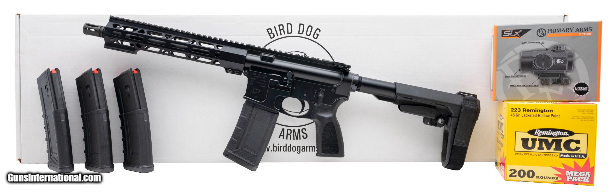 Description: "Bird Dog BDP-15 Pistol Bundle Pack. 5.56X45mm with an 10.5"" barrel with Bird Dog muzzle brake. Semi-automatic Pistol with a Pistol Brace and matte black finish. Bundle Pack includes three Athril 30-Round Magazines, Primary Arms Classic RD-25 Red Dot sight, and 200 Round Remington UMC 45 Grain JHP Ammo. New. (STOCK PHOTO) SOLD |