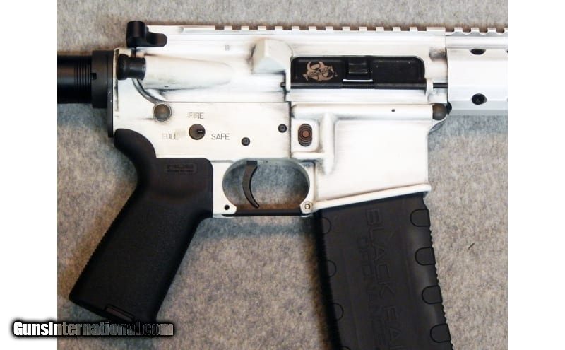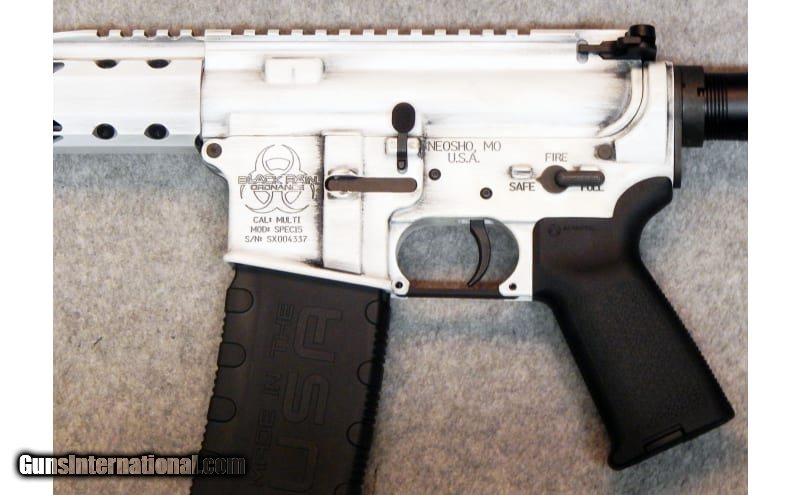 Description: Black Rain Ordinance ~ Spec-15 ~ Chambered in 5.56x45 mm NATO. Is a semi-auto Armalite pattern modern sporting carbine. Features a 16" barrel with a 1/2x28" threaded muzzle with an affixed A2 bird cage flash hider. Firearm has a white finish with is contrasted with a black Magpul MOE buttstock, and Magpul MOE grip. Comes with a soft case and a single 30 + 1 capacity magazine. 5.56x45MM NATO SOLD Chambers: 5.56x45 mm NATO. Metal Condition: Very good condition. Bore Condition: Good condition. Barrels: 16" inches. Stock Dimensions: 13.75" LOP. Fore End: Free float aluminum. M-lok. Butt Pad: Rubber. Weight: 6.75 pounds Chokes: 1/2x28" threaded. Item Location: Acworth, GA |