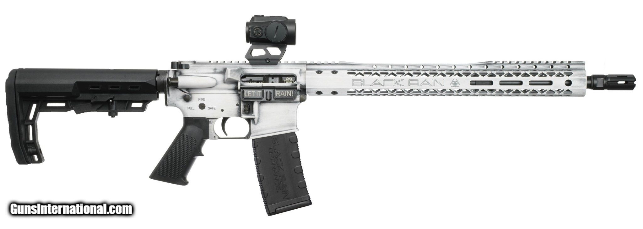 Description: Guns Listing ID: 499998 The Black Rain Ordnance Spec 15 is a high-performance rifle chambered in 5.56 NATO, featuring a durable 16-inch 4150V Chromoly barrel and finished in a distinctive battleworn white Cerakote. This rifle is built for reliability and precision, enhanced by the included Zero Tech Trace 1x25 red dot optic. The Spec15 forged aluminum receiver set provides a strong yet lightweight platform. A 15-inch M-LOK slim handguard allows for secure accessory mounting, while the castle flash suppressor reduces muzzle flash. The rifle utilizes a direct impingement system with a .750 low-profile non-adjustable gas block for consistent performance. The rifle is equipped with a Salt Bath Nitride-coated Spec15 bolt carrier group (BCG) and a Spec15 forged charging handle for smooth operation. The Mil-Spec G.I. trigger, G.I. grip, and XTS buttstock complete the functional and ergonomic design. SOLD Manufacturer: BLACK RAIN ORDNANCE Model: SPEC15 Caliber Info: 5.56X45MM NATO Condition: new Barrels: 16" BARREL Action: SEMI AUTOMATIC Finish: WHITE BATTLEWORN |
