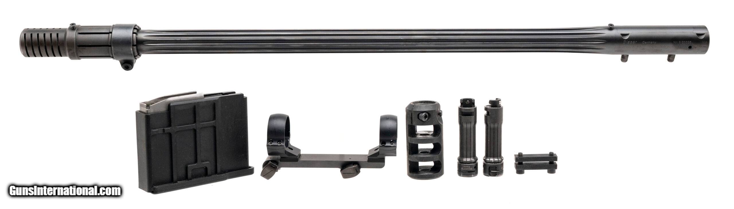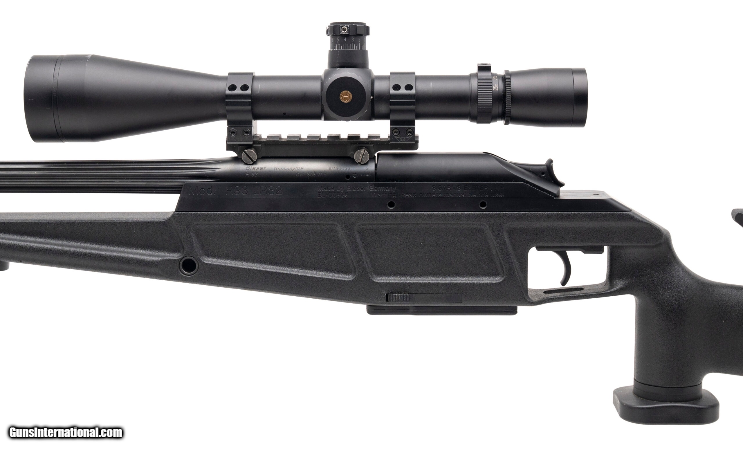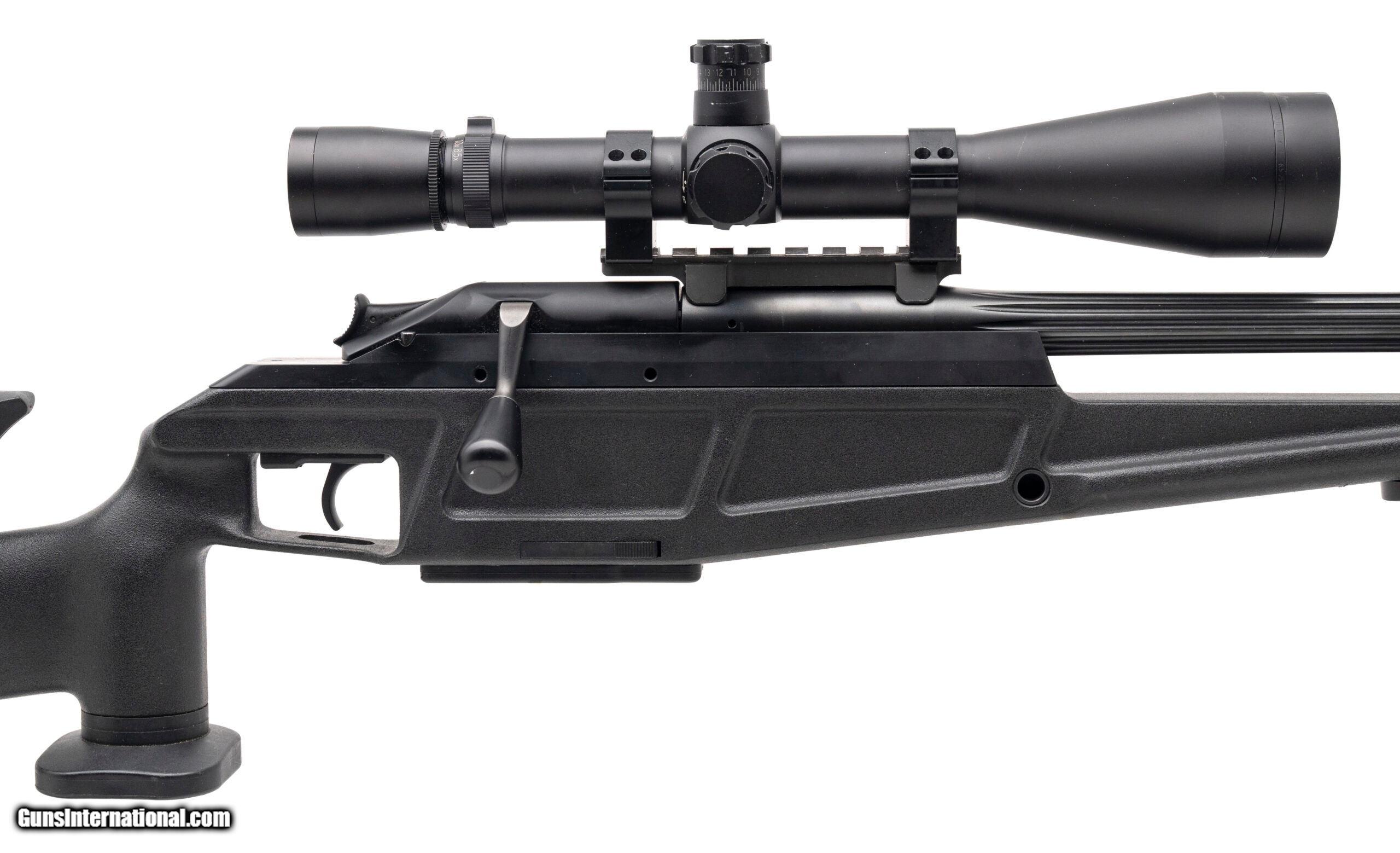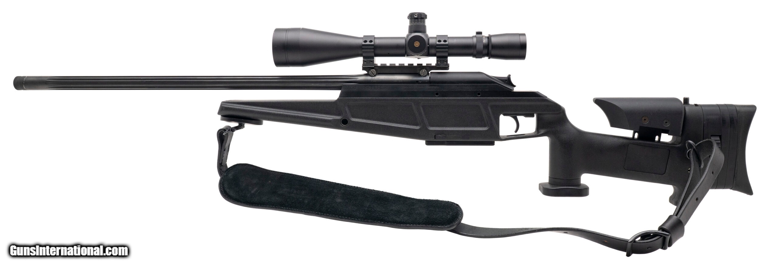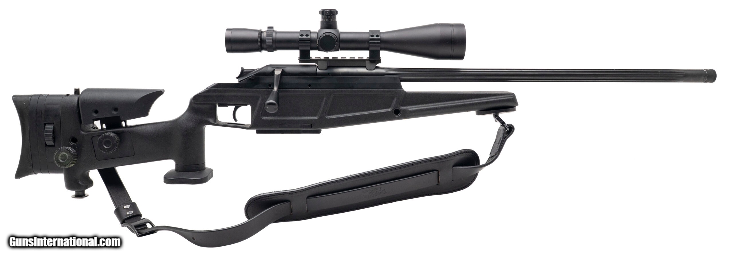 Description: "SN: BL-00939. Modern production, .308 Win/.300 Win Mag with a 24"" fluted/threaded barrel. Bore is bright with strong rifling. Straight-pull precision rifle with a Leupold Mark 4 8.5-25x50mm scope w/Mil Dot reticle and a Deerfield Leathers sling. This rifle features a two barrel set, 7.62 NATO muzzle brake, additional 30mm saddle mount, and an extra 7.62 NATO & .300 Win. Mag. bolt head. Overall condition is very good. Comes with case and .300 WM magazine. SOLD |