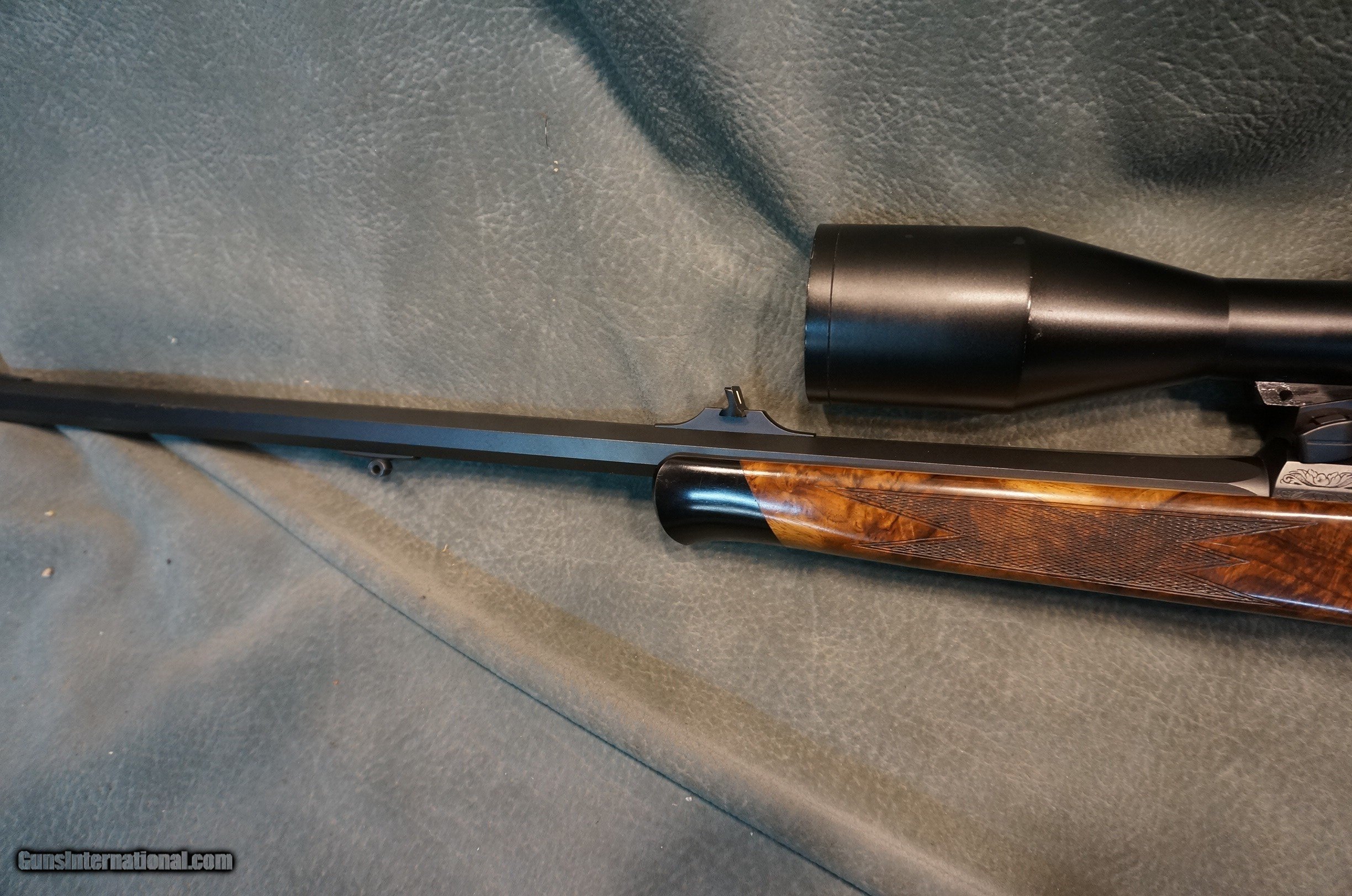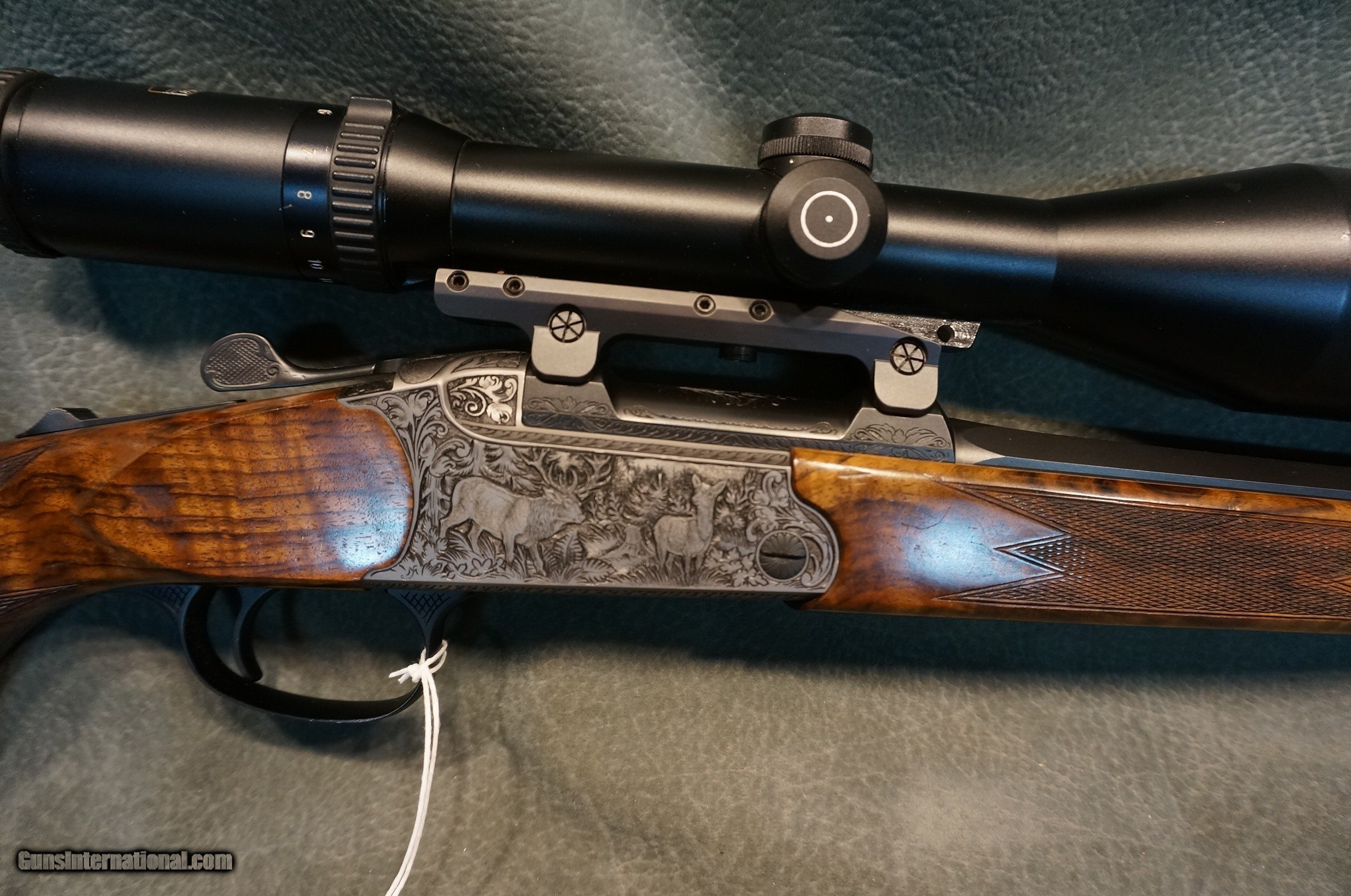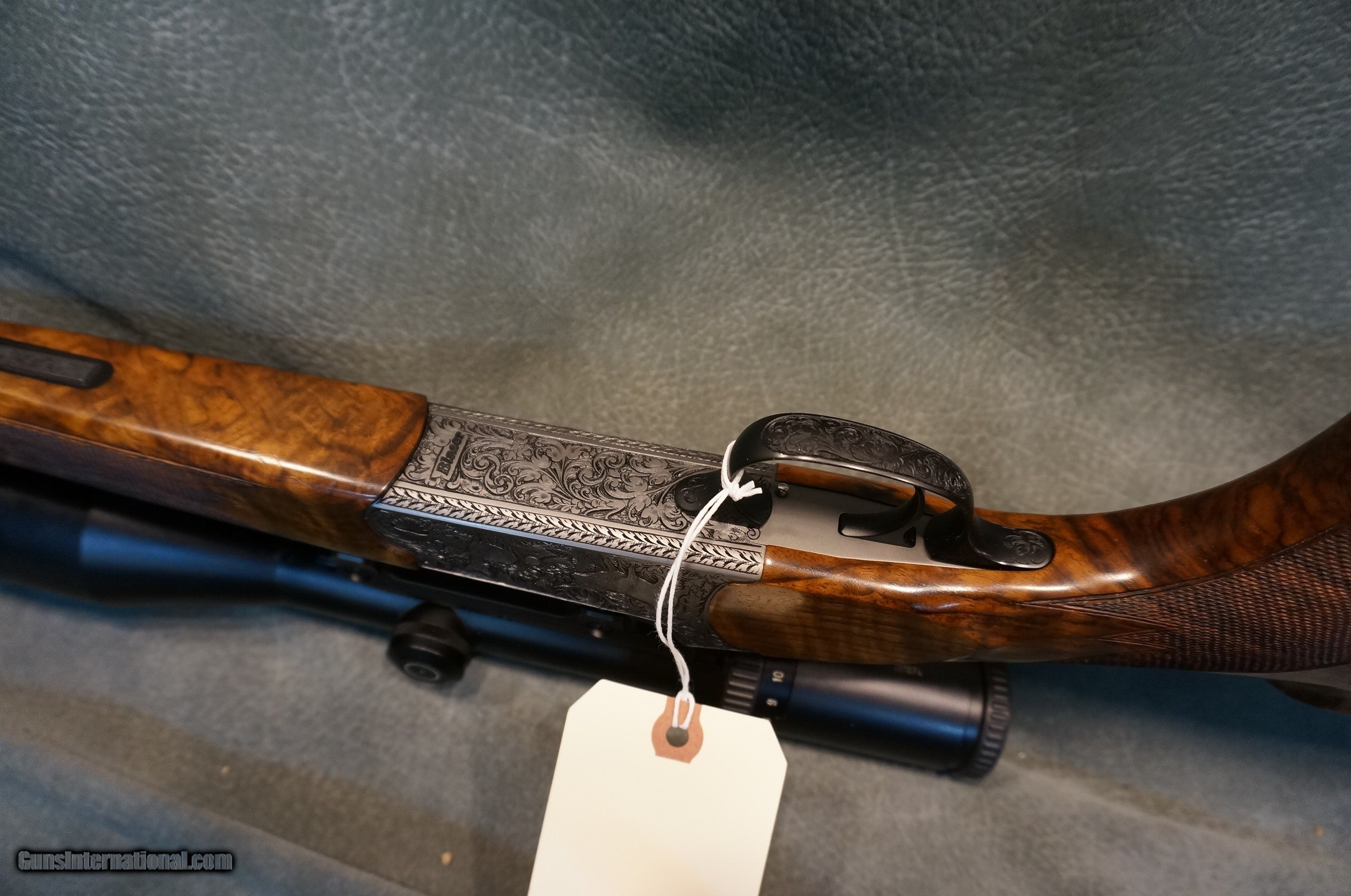 Description: SALE PENDING***Blaser K95 Exclusive factory engraved 30-06,one of a kind factory engraved by Sigrid Muckenheim with deep relief Brown Bear fishing for salmon on the left side of the receiver and 2 Elk on the right side,high grade at least #8 Turkish Walnut stock,cartridge trap door,ebony forend tip,palm swell,Schmidt and Bender 3-12x50 illuminated scope with QR mounts,over $15000 new,no longer made.Excellent condition with a few light hunting marks. GUN COLLECTIONS WANTED FOR CASH! We buy, sell, consign and trade new and used firearms. This is our 44th year in business.To send your FFL or for tracking info please e-mail shippingfirststopguns . We offer 90 day layaways with 20% down. No return on layaways. Firearms will need to be transferred through a FFL dealer. Prices reflect a cash discount. There will be 3% added to credit card sales. We trade for gold and silver. THANK YOU! SOLD |
