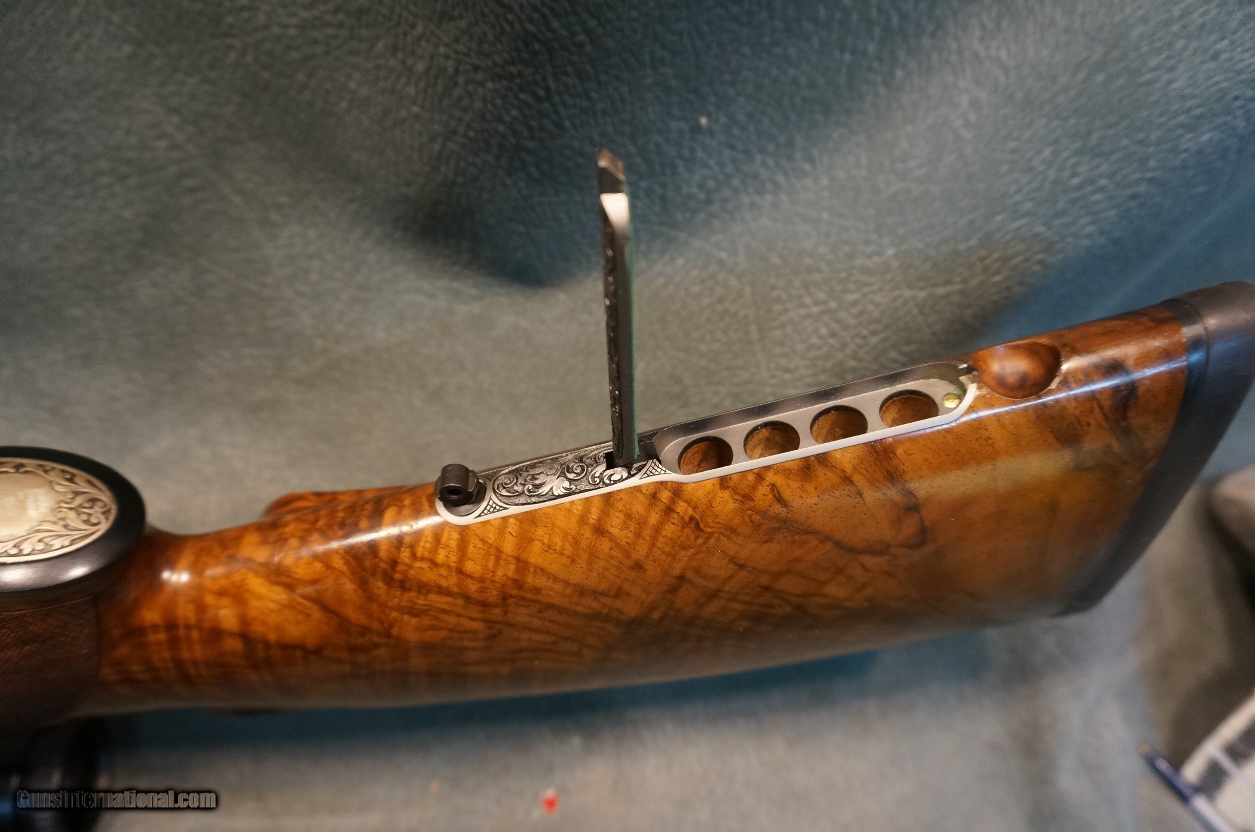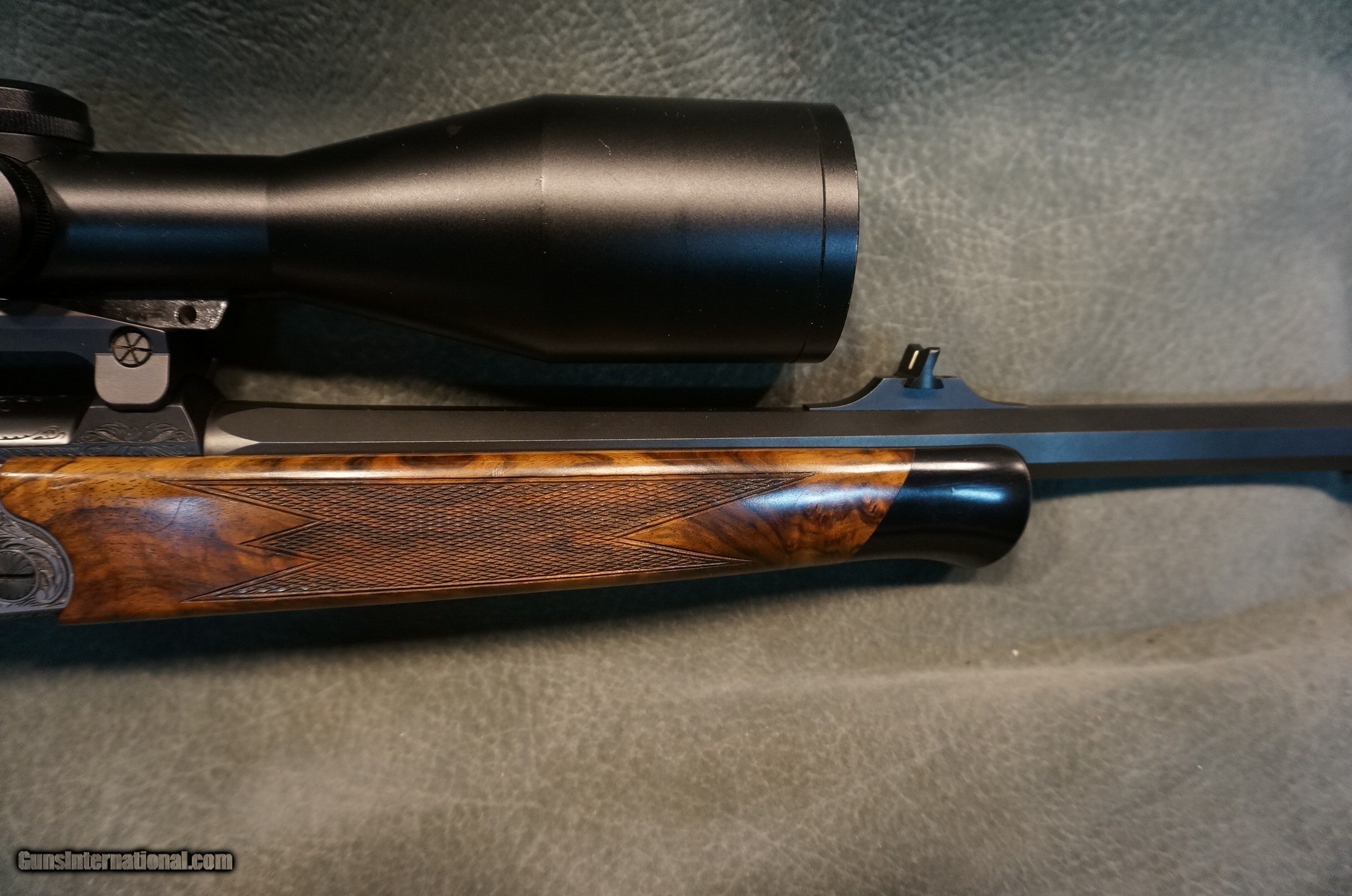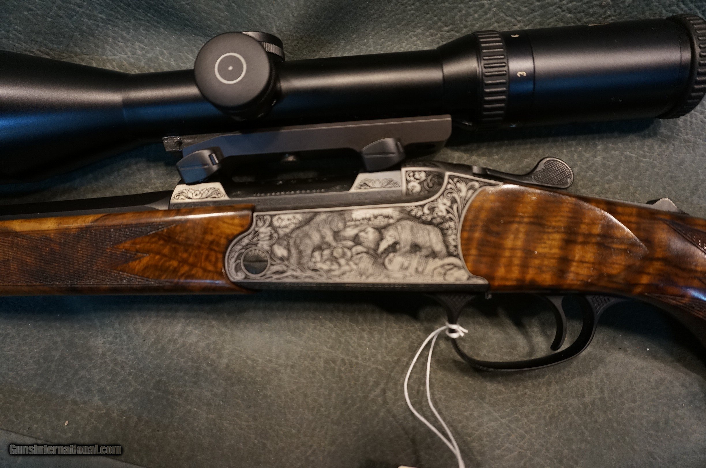 Description: SALE PENDING***Blaser K95 Exclusive factory engraved 30-06,one of a kind factory engraved by Sigrid Muckenheim with deep relief Brown Bear fishing for salmon on the left side of the receiver and 2 Elk on the right side,high grade at least #8 Turkish Walnut stock,cartridge trap door,ebony forend tip,palm swell,Schmidt and Bender 3-12x50 illuminated scope with QR mounts,over $15000 new,no longer made.Excellent condition with a few light hunting marks. GUN COLLECTIONS WANTED FOR CASH! We buy, sell, consign and trade new and used firearms. This is our 44th year in business.To send your FFL or for tracking info please e-mail shippingfirststopguns . We offer 90 day layaways with 20% down. No return on layaways. Firearms will need to be transferred through a FFL dealer. Prices reflect a cash discount. There will be 3% added to credit card sales. We trade for gold and silver. THANK YOU! SOLD |