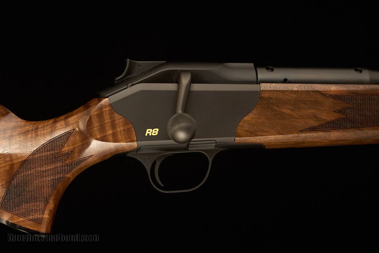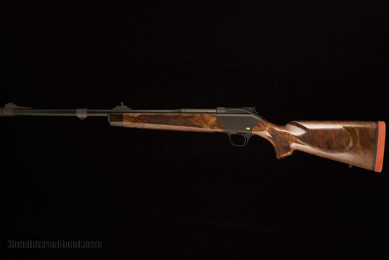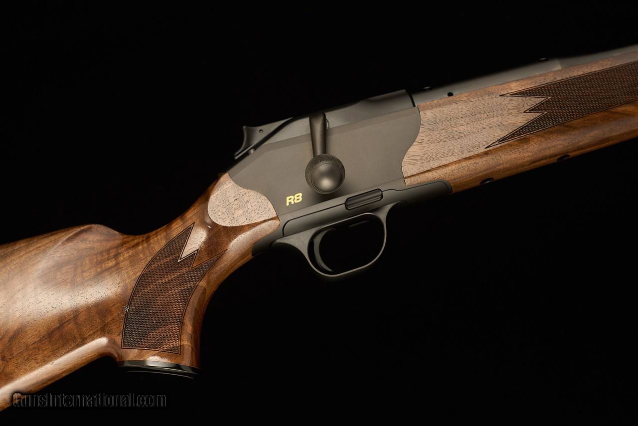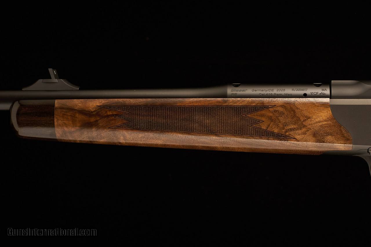 Brand new Blaser R8 Kilombero in .416 Remington Magnum with grade 4 Turkish walnut. Forearm tip is actual ebony. Express sights are banded and made of steel. The metal portion of the receiver, as well as the trigger guard plate, is steel for maximum recoil absorption and durability. Bolt handle is steel and well checkered for excellent traction. Kickstop unit is present in the buttstock. We can easily add barrels of any caliber, to include .300 Win Mag, .375 H&H, and .458 Lott.