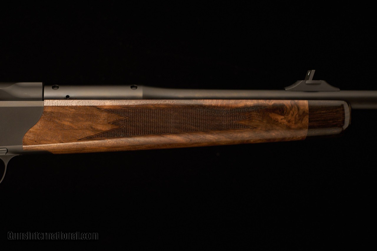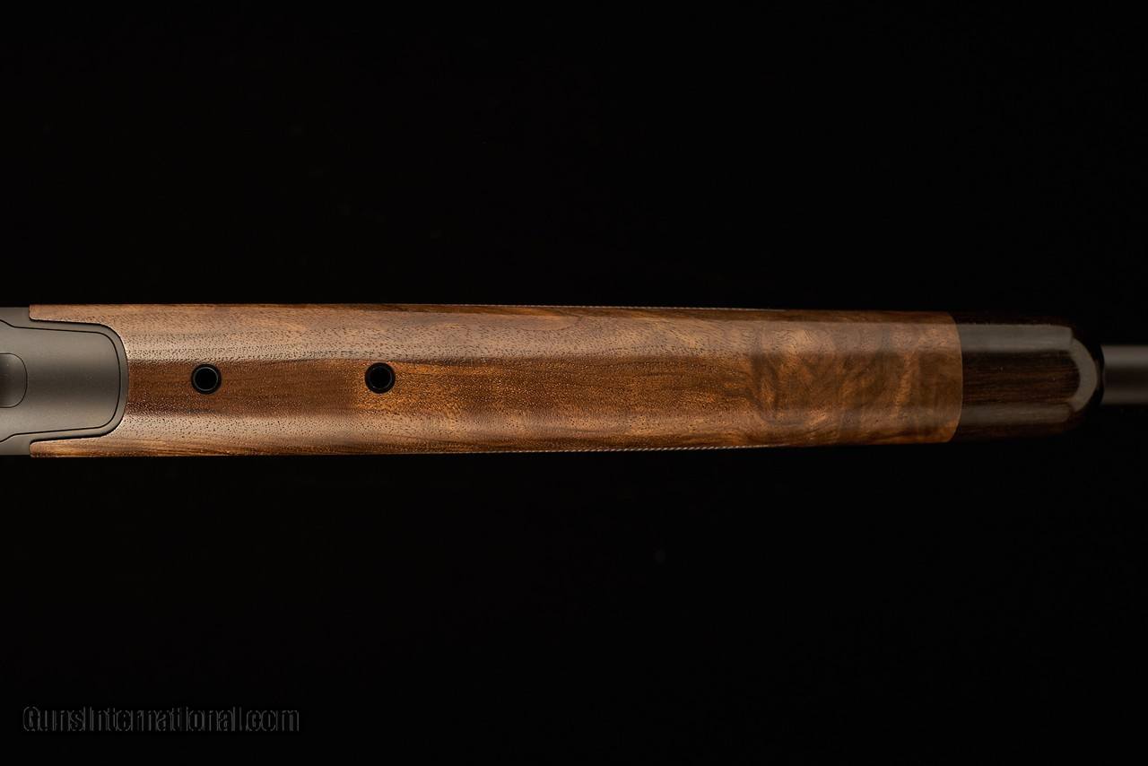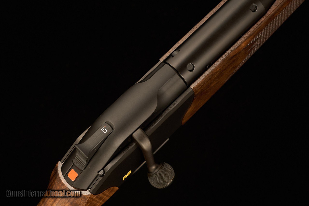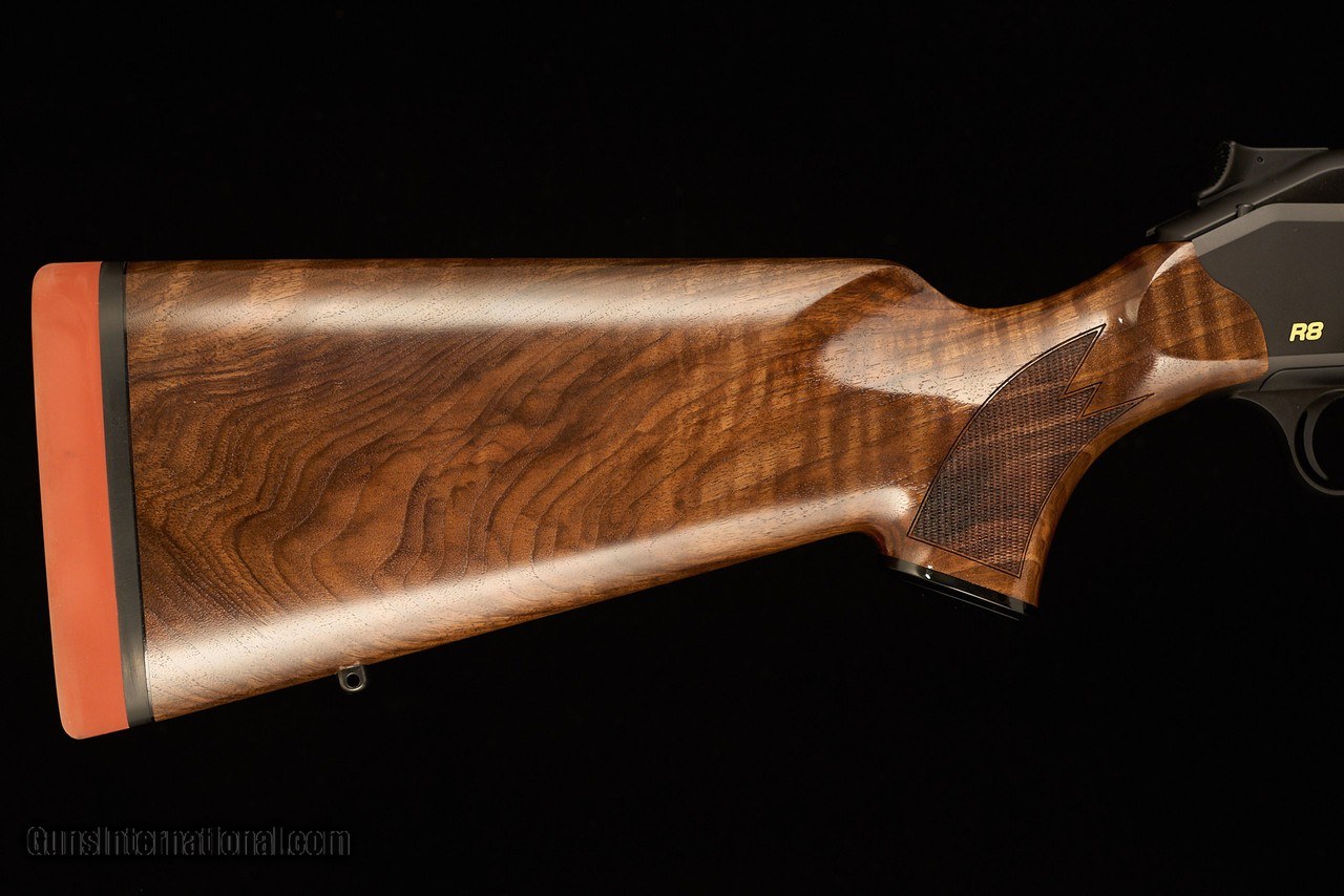 Brand new Blaser R8 Kilombero in .416 Remington Magnum with grade 4 Turkish walnut. Forearm tip is actual ebony. Express sights are banded and made of steel. The metal portion of the receiver, as well as the trigger guard plate, is steel for maximum recoil absorption and durability. Bolt handle is steel and well checkered for excellent traction. Kickstop unit is present in the buttstock. We can easily add barrels of any caliber, to include .300 Win Mag, .375 H&H, and .458 Lott.
