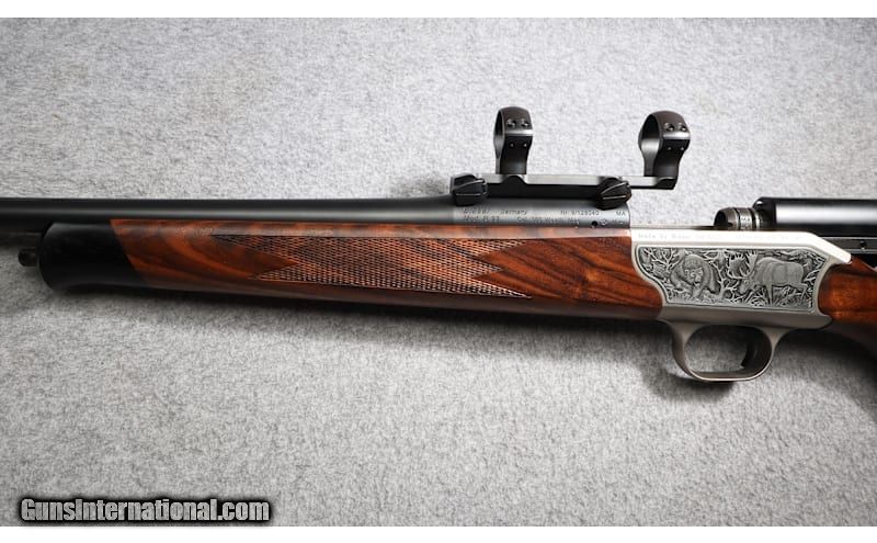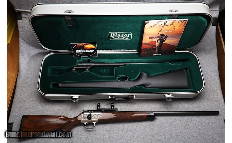 Description: For your consideration, Blaser R93 straight-pull bolt action rifle chambered in .300 Weatherby Magnum in excellent condition. Comes with 2nd barrel with scope rings attached chambered in .22-250 Remington, 2nd bolt head, 2nd stock, and hard case. The R93 minimizes body movement during cycling. When cycling, the bolt assembly pulls back and pushes forward in a straight line. There is no rotation of the bolt handle upwards or downwards. .300 Weatherby Magnum SOLD Metal Condition: Excellent Wood Condition: Excellent Bore Condition: "Both barrels are clean, bright and shiny Barrels: "One barrel chambered in .300 Weatherby Magnum, 2nd barrel chambered in .22-250 Remington. Weight: 7 lbs 4 oz Sights: Both barrels have scope rings attached. Item Location: Scarborough, ME |