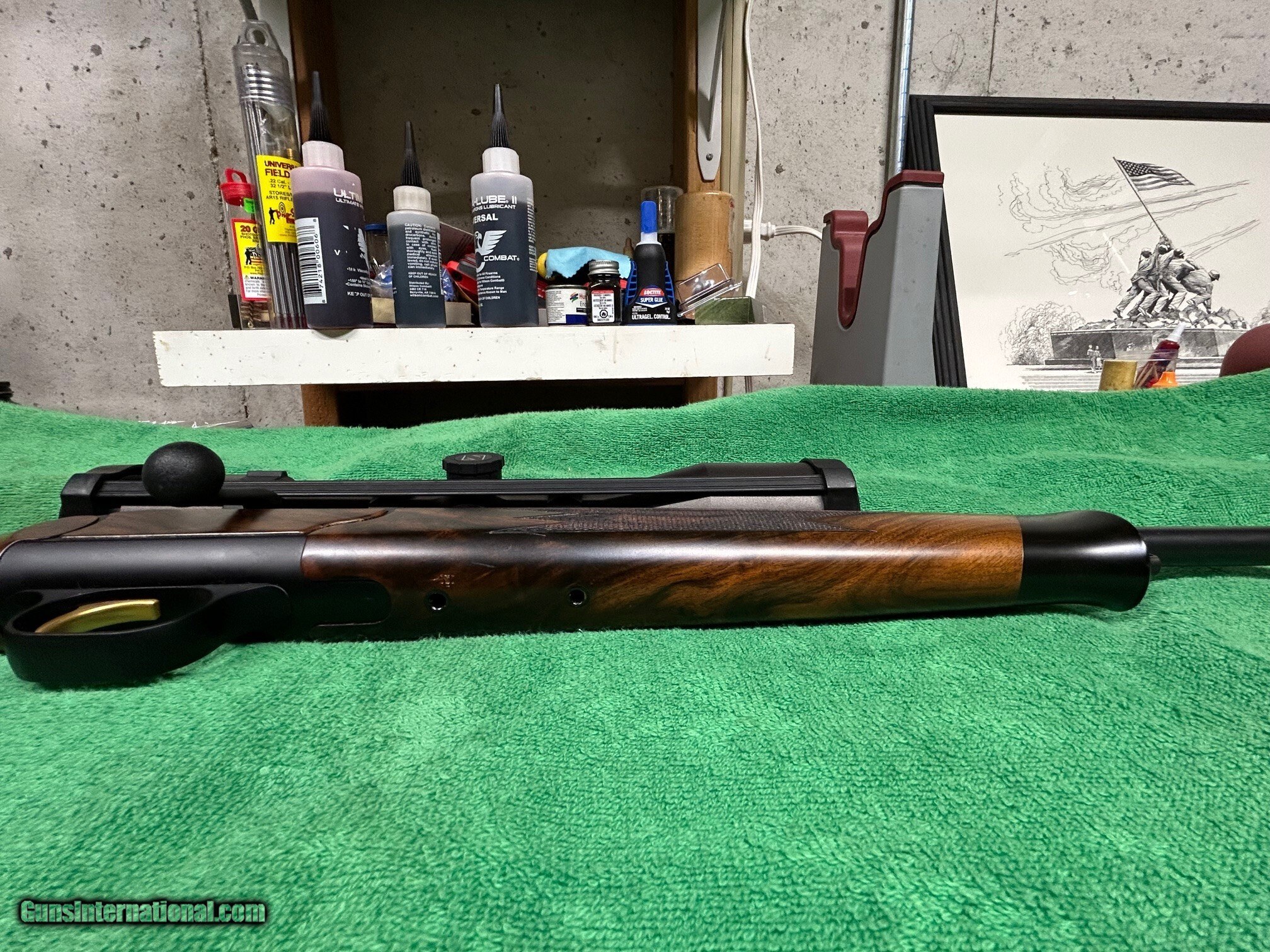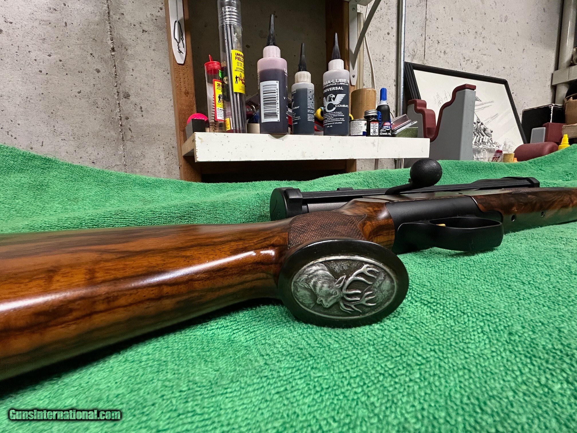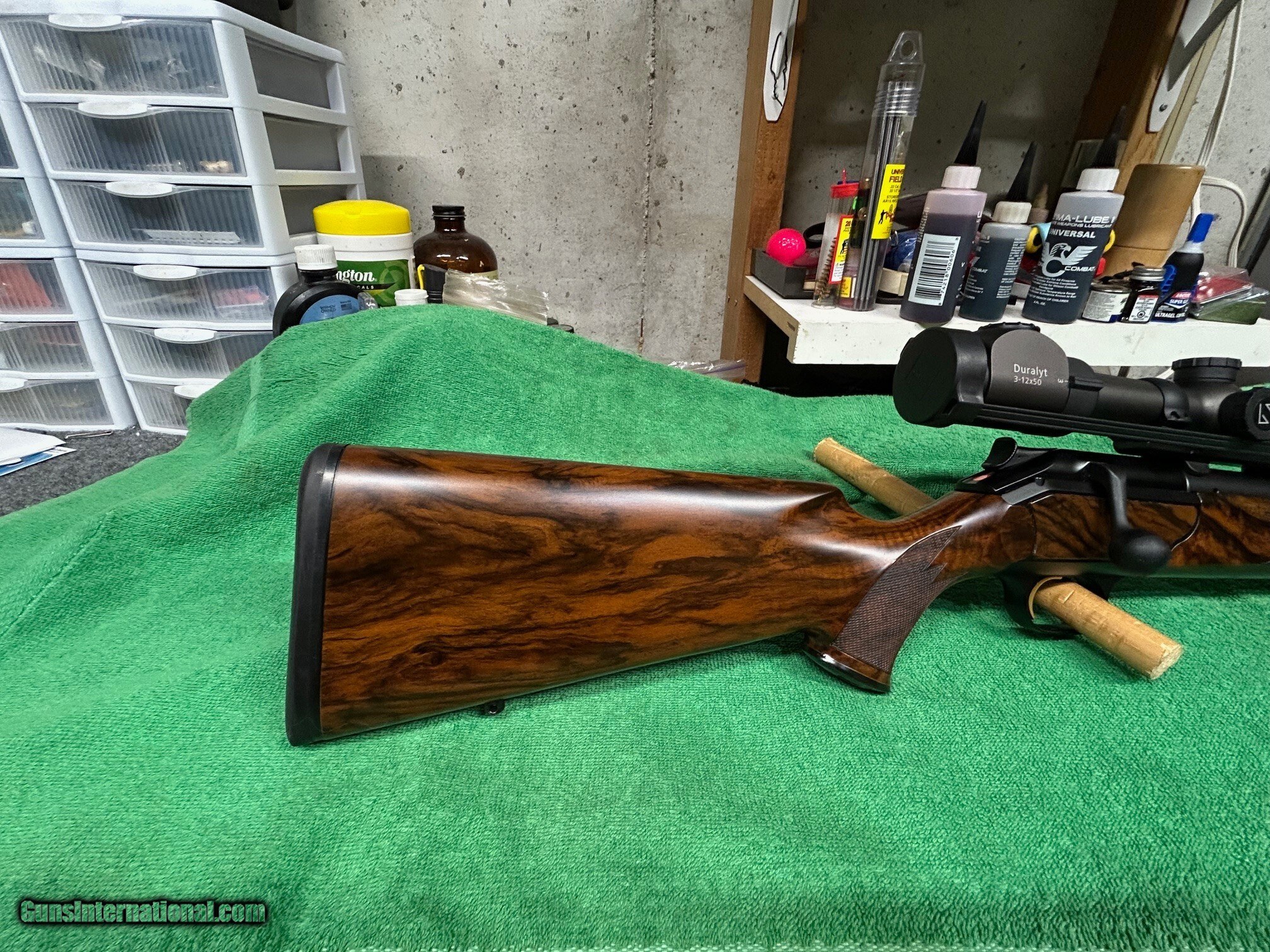 Description: PRICE REDUCTION. For your consideration is a gorgeous Blaser R93 Attache stock and receiver with perfectly matched wood sideplates. AS NEW condition! You don't see many of these anymore. This one is stunning! The listed price DOES NOT include the scoped barrel or bolt shroud and bolt head. They can be purchased separately if desired. Please contact me for pricing. You will not be disapppointed with this beautiful stock set. It comes complete with a GOLD trigger that bears the Blaser inspection marking and a silver elk grip cap insert. It also has a Blaser removeable recoil reducer in the stock. The pictured barrel is chambered in 338 Win Mag with a Zeiss Conquest Duralyt 3-12x50 illuminated scope with a German # 4 reticle in Blaser factory QD 30mm mounts. These can be purchased separately. Payment using USPS money orders ships the next day via UPS Ground for $100 in the CONUS. Insurance is additional and paid by the Buyer at a cost of $15 per thousand. Must ship to an FFL. No sales outside the US. You will not find a nicer upgrade for your R93! Price: $3,495.00 Shipping: $100.00 Contact Seller |
