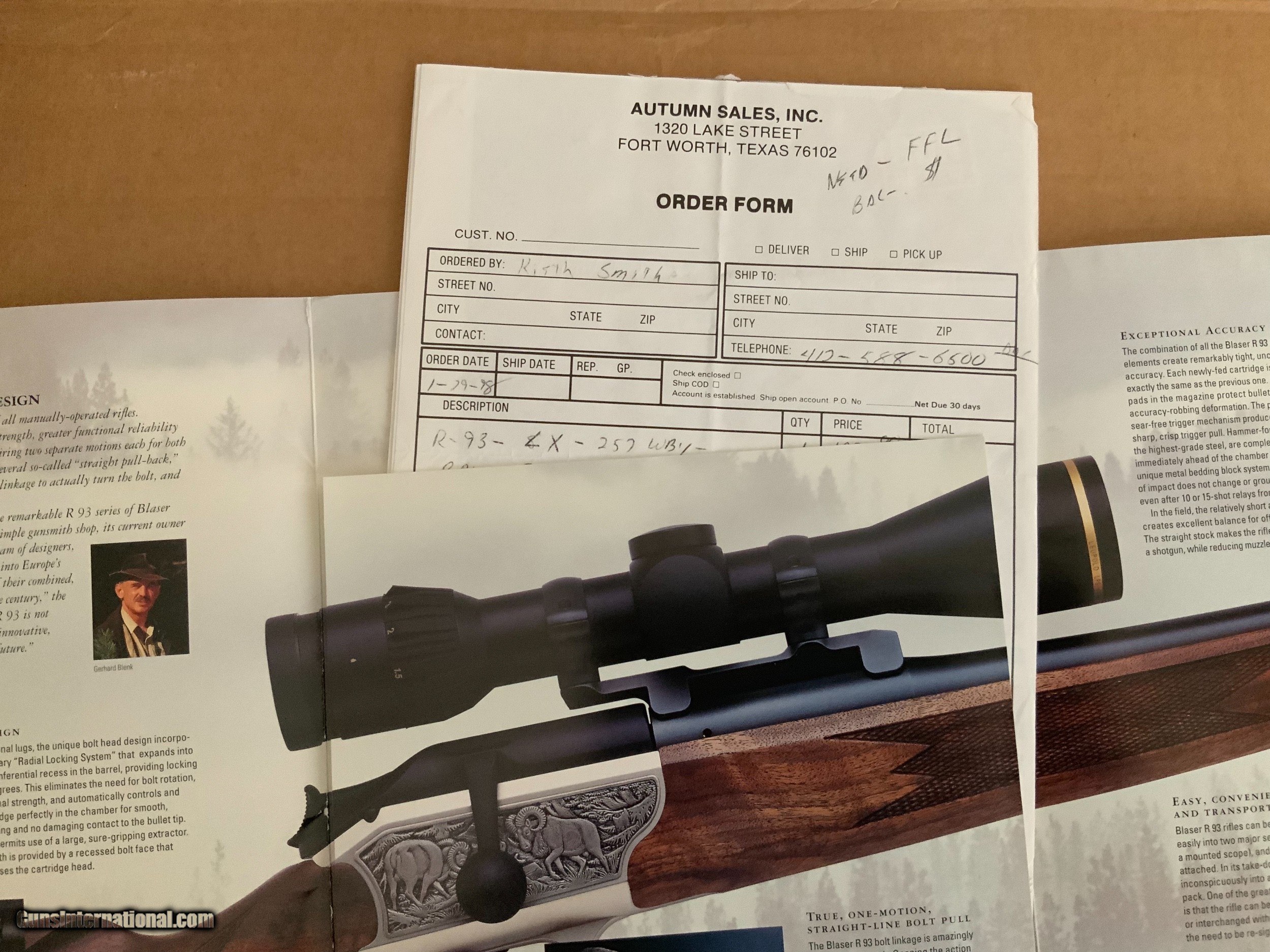 Description: Blaser R93 LX chambered in .257 Weatherby with 1” rings....Leupold scope not included. This was part of my father’s collection that I received when he died 8 years ago. Comes in original box and original bill of sale and all original Blaser brochures. Purchased new from Autumn Sales in Dallas on January 29, 1998. Gun is in excellent conditon. Has been in climate controlled safe for 20 years. Fired less than 100 times. The trigger is the best trigger I have ever felt on a factory gun. The action is super smooth. $50 shipping to your FFL. Will only ship to areas where legal. 3 day inspection period applies. SOLD Manufacturer: Blaser Model: R93 LX Serial Number: BC-030xx Caliber Info: .257 Weatherby Condition: Very good |