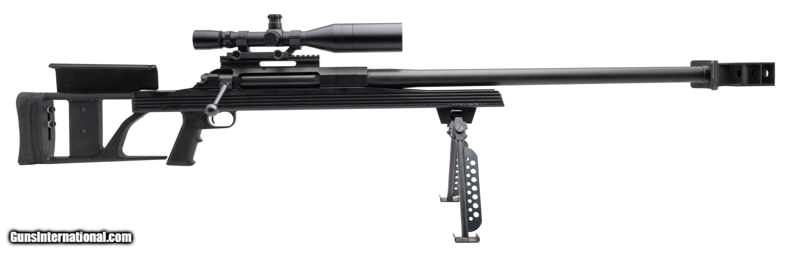 Description: "SN: US75067. Modern production, .50 BMG with a 30"" chrome molybdenum barrel w/3-chamber muzzle brake. Bore is very good. Single-shot bolt-action rifle with a Leupold Mark 4 4.5-14x-50mm LR/T scope, collapsible bi-pod, free float monolithic stock, adjustable stock & cheek rest, and manganese phosphate finish. Finish shows minor handling marks. Overall condition is very good. SOLD |