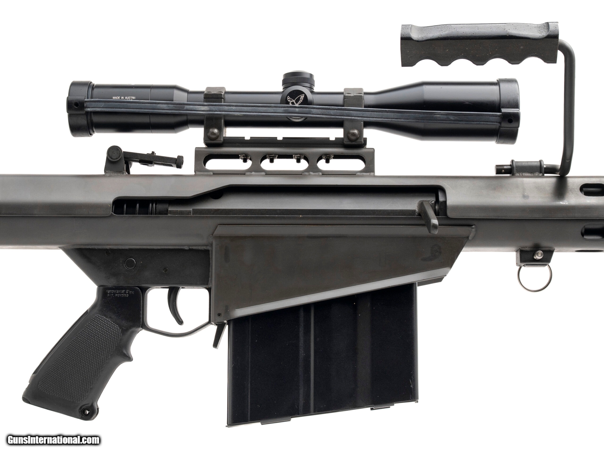 Description: "SN: 2866. 1990s vintage, .50 BMG with a 29"" fluted barrel w/2-chamber muzzle brake. Bore is excellent with strong rifling. Semi-auto marksman rifle with Swarovski 10x42 Barret .50 Cal scope, collapsible bi-pod, carry handle, flip-up front & rear sights, and black manganese phosphate finish. Finish shows scattered minor marks. Includes additional magazine, and custom fit Pelican case. Overall condition is very good. SOLD |