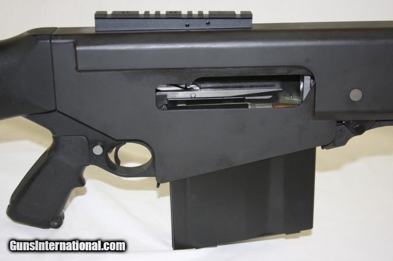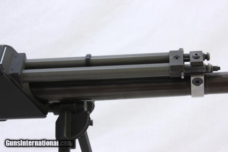 The Dieckmann .50 BMG caliber custom semi automatic rifle. The rifle was designed and manufactured by Ralf E. Dieckmann in the time period of 1993 to 1994 in Phoenix and Prescott, Arizona. The rifle was designed along the lines of a typical Assault Rifle scaled up to accommodate the .50 caliber Browning cartridge. The breech mechanism consists of a vertically locking and horizontally reciprocating wedge type breech block. It is driven by a novel “floating” gas system and returns to battery by dual extension springs. The rifle utilizes a 10-shot Barrett magazine. The overall length is 56 ¼ inches. The barrel length is 29 inches. The rifle weighs 35 pounds, unloaded, with the M-14 bipod installed and without optics. The rifle has been fired enough times to establish that it is safe to shoot. Due to the high cost of .50 caliber ammunition, it has not been endurance tested to establish its long-term reliability. For that reason, the rifle is offered for sale as a ONE OF A KIND prototype/collector’s item only. What is not included in the sale is any intellectual property which may reside in the mechanism of the rifle. Ralf E. Dieckmann, the designer, would be happy to work with any manufacturer interested in further developing this prototype rifle for retail sales. The sale includes the rifle, one magazine, an M-14 bipod and a Pelican case (not pictured).