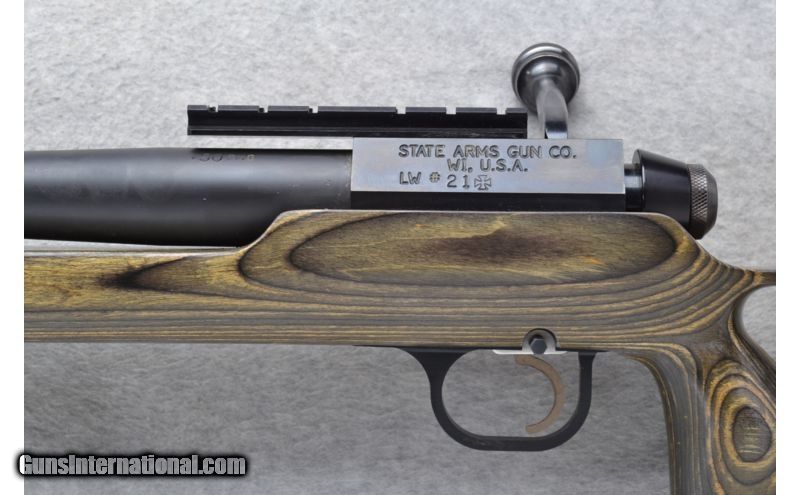 Description: This State Arms Gun Co. is a single shot bolt action rifle in .50 BMG Cal. It has a 35 inch matte black barrel with the muzzle break. It has a smooth grip thumbhole pistol grip hardwood laminate stock. It is loaded by removing the bolt and placing the round in it. The large bolt handle is knurled. It comes with an adjustable folding Bi-Pod. In overall excellent condition it comes as is. No Case. SOLD Manufacturer: Made in U.S.A. Caliber Info: .50 BMG Chambers: Single shot. Metal Condition: Excellent. Wood Condition: Excellent with a couple minor handling marks. Bore Condition: Excellent. Barrels: 35 inch matte black with the muzzle break. Triggers: Grooved. Stock: Smooth grip thumbhole pistol grip hardwood laminate. Stock Dimensions: LOP 15 3/4 inches, Fore End: Smooth grip hardwood laminate. Butt Pad: Pachmayr White Line rubber recoil pad. Weight: 17 lbs. 11 oz. with the bi-pod attached. Sights: 5.5 inch Picatinny rail on reciever top. No iron sights. Extras: Bi-Pod Item Location: Richfield, WI |