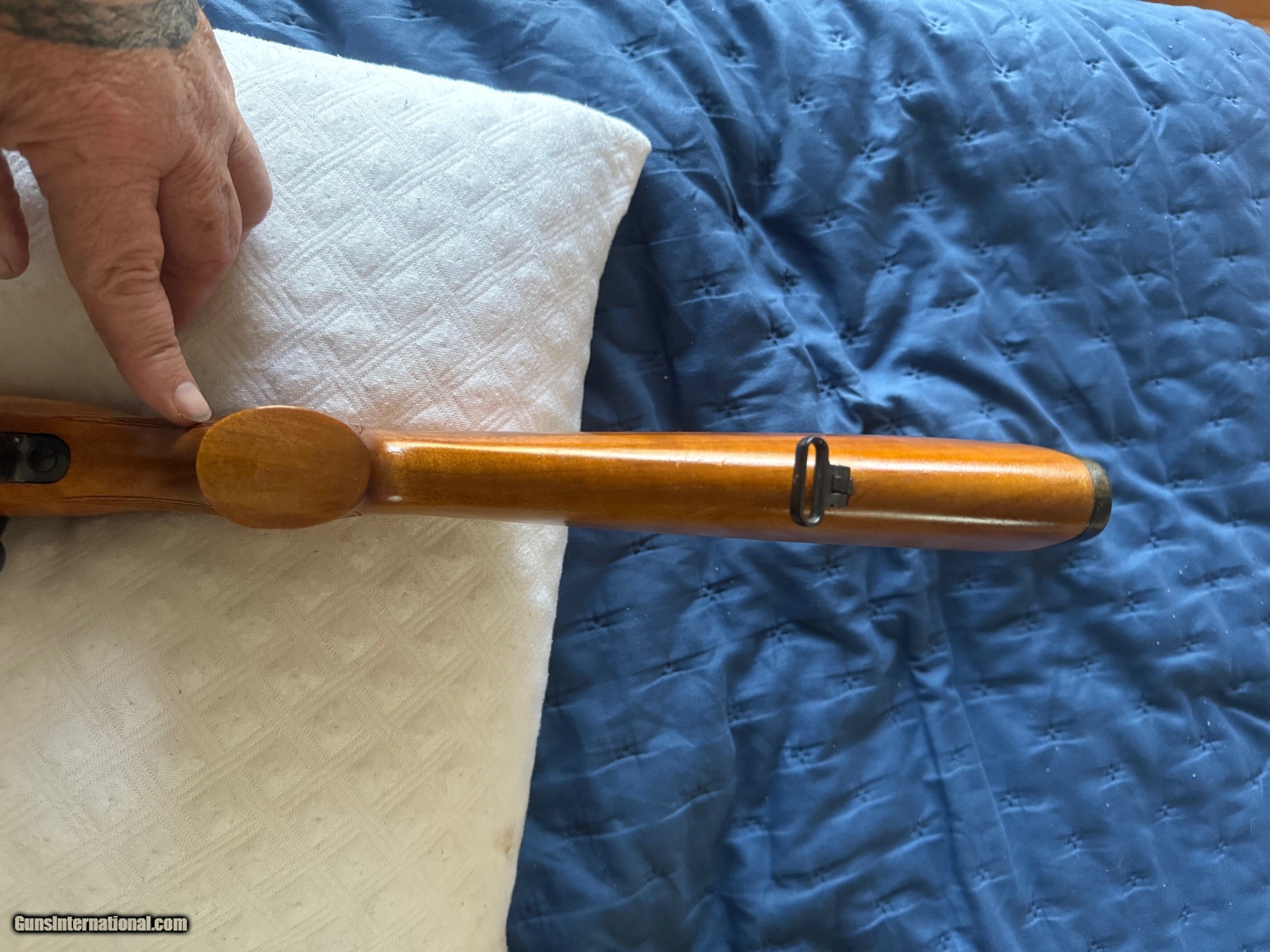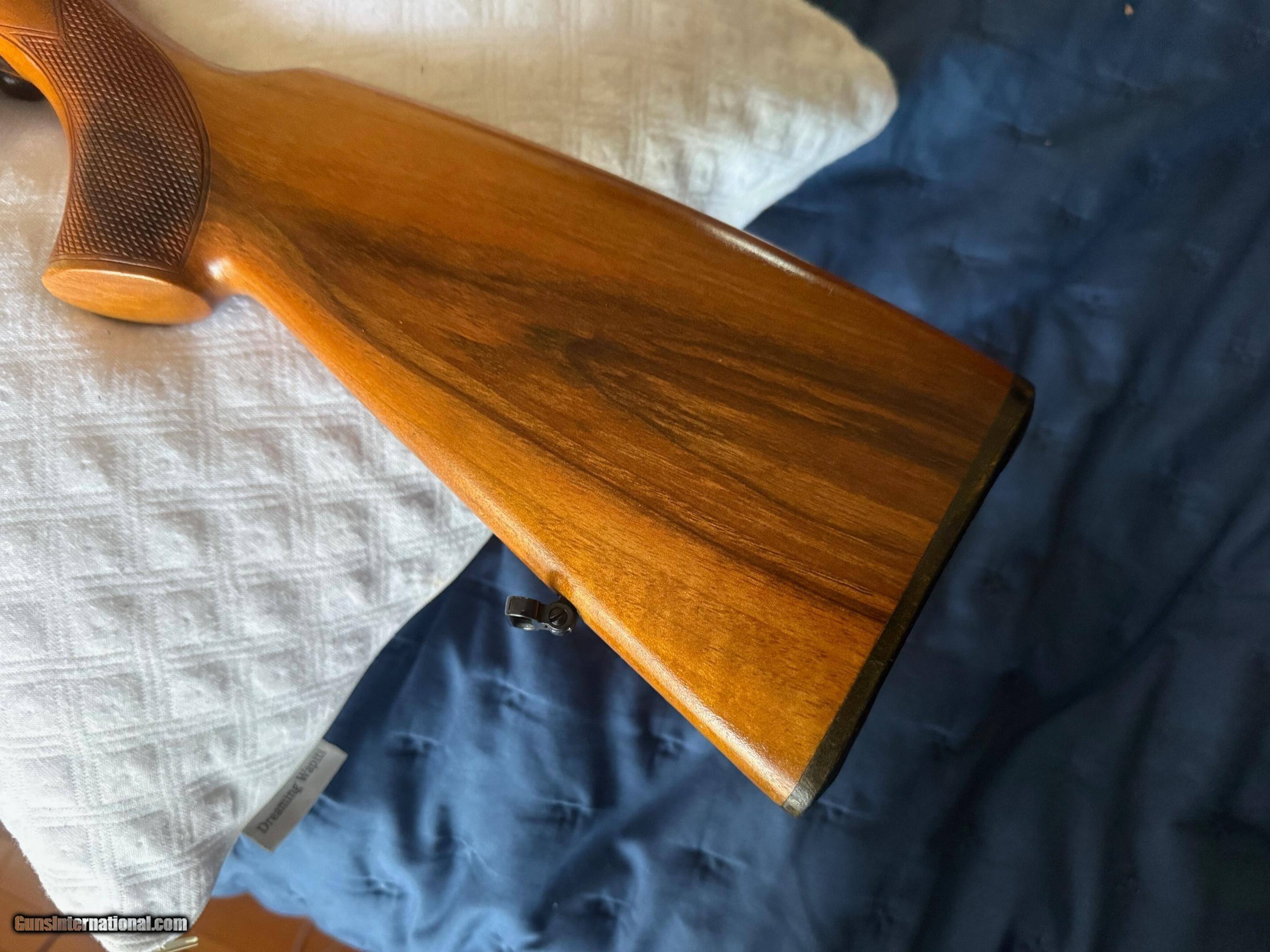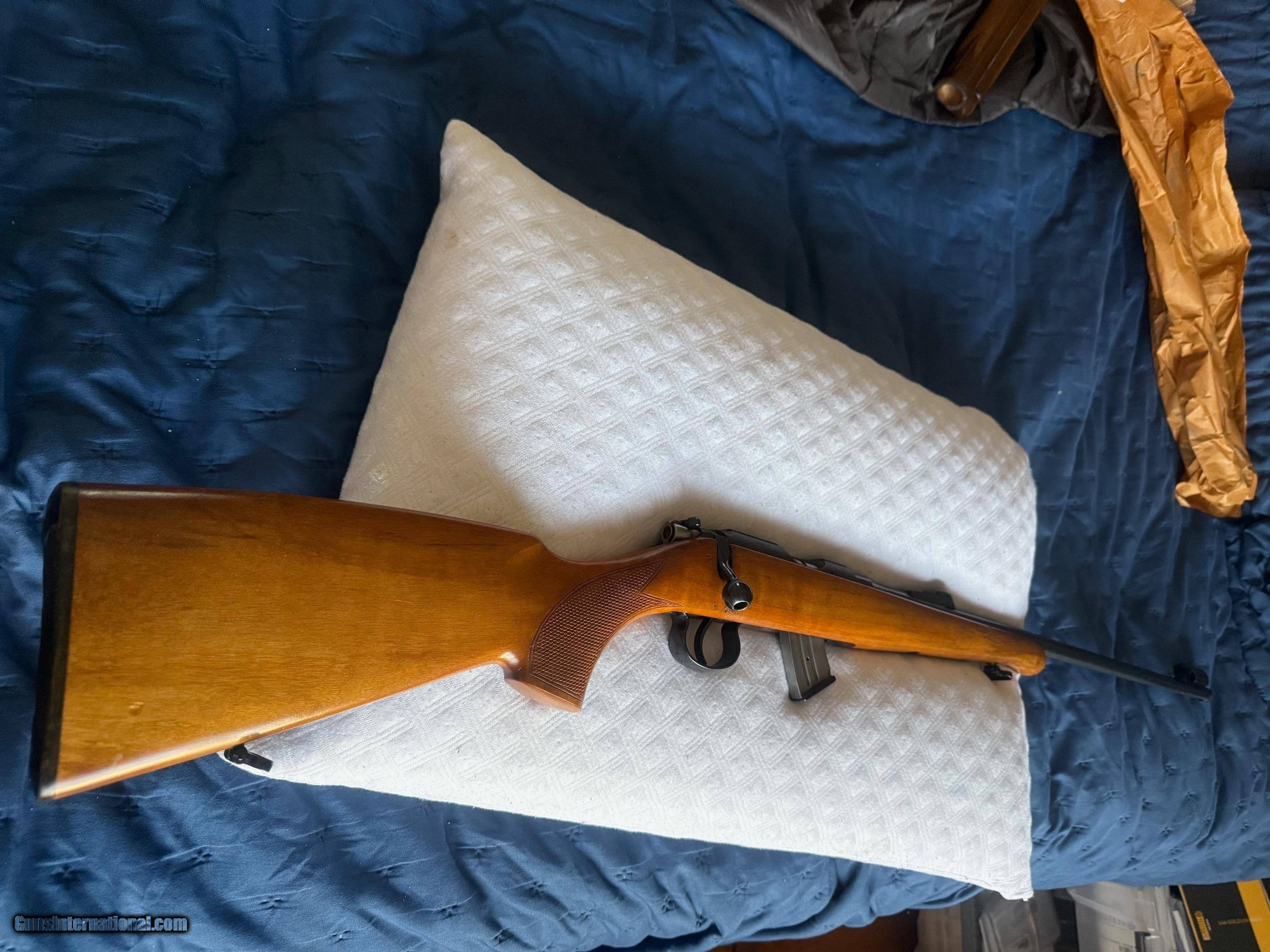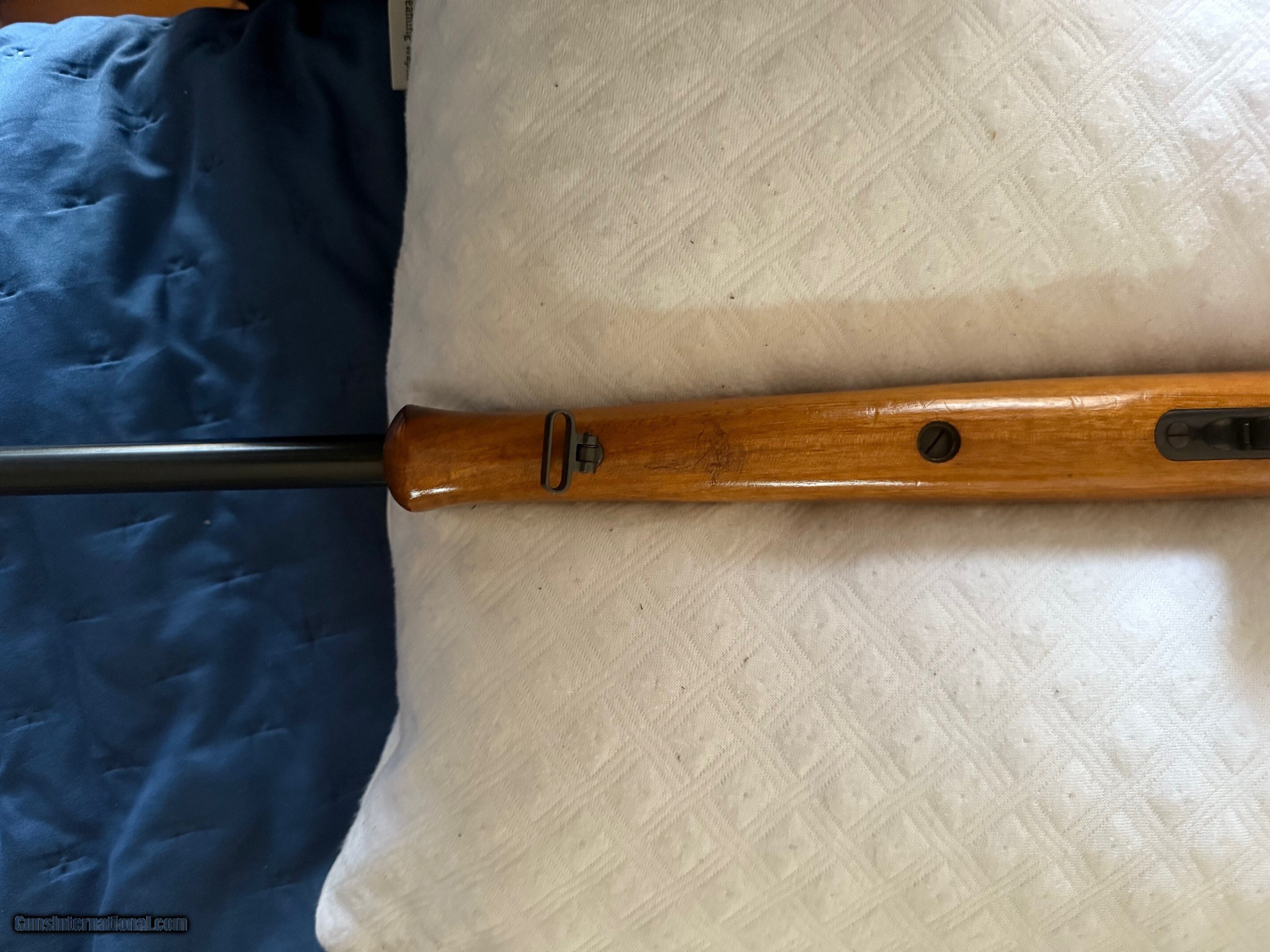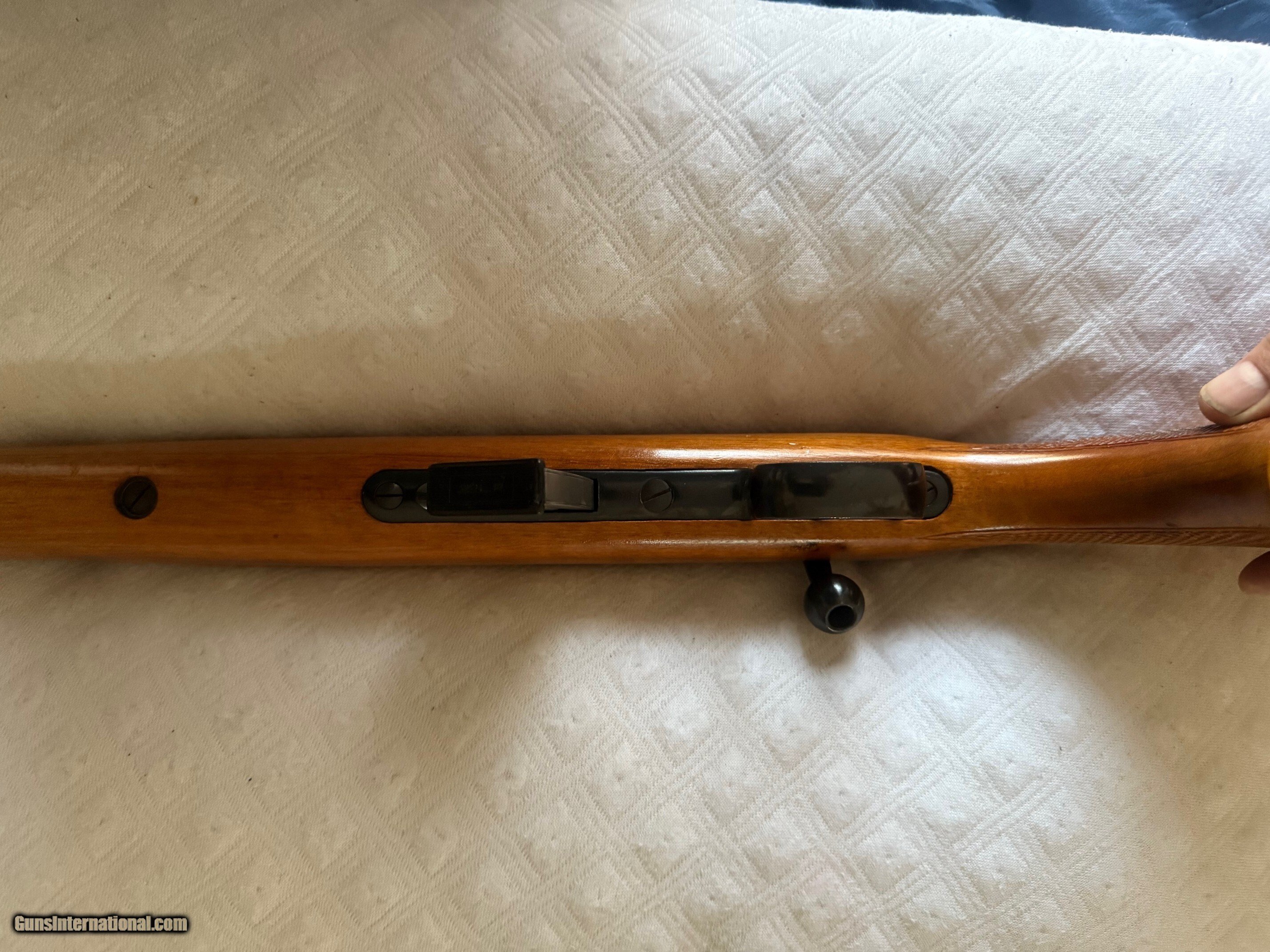 Almost impossible to find one in this excellent condition. The 2E has a 24.8" barrel and great wood. It has a hooded front sight, and the blade on the front sight has been removed to facilitate a scope. The metal is in fine shape, and the barrel has been threaded and comes with a thread protector. It comes with the appropriate rings with bases, and has sling rings and studs. These are some of the most accurate 22 rifles made.