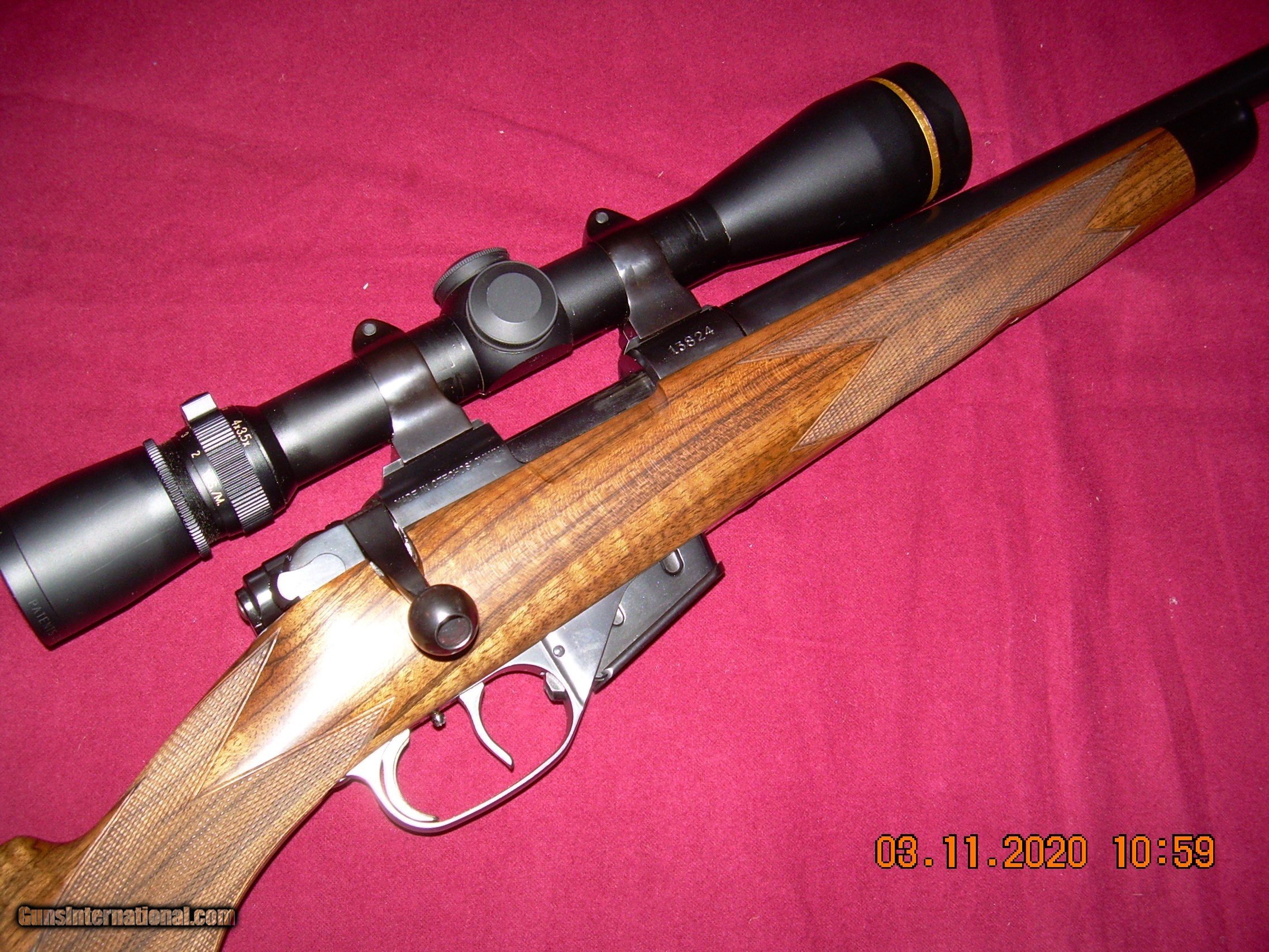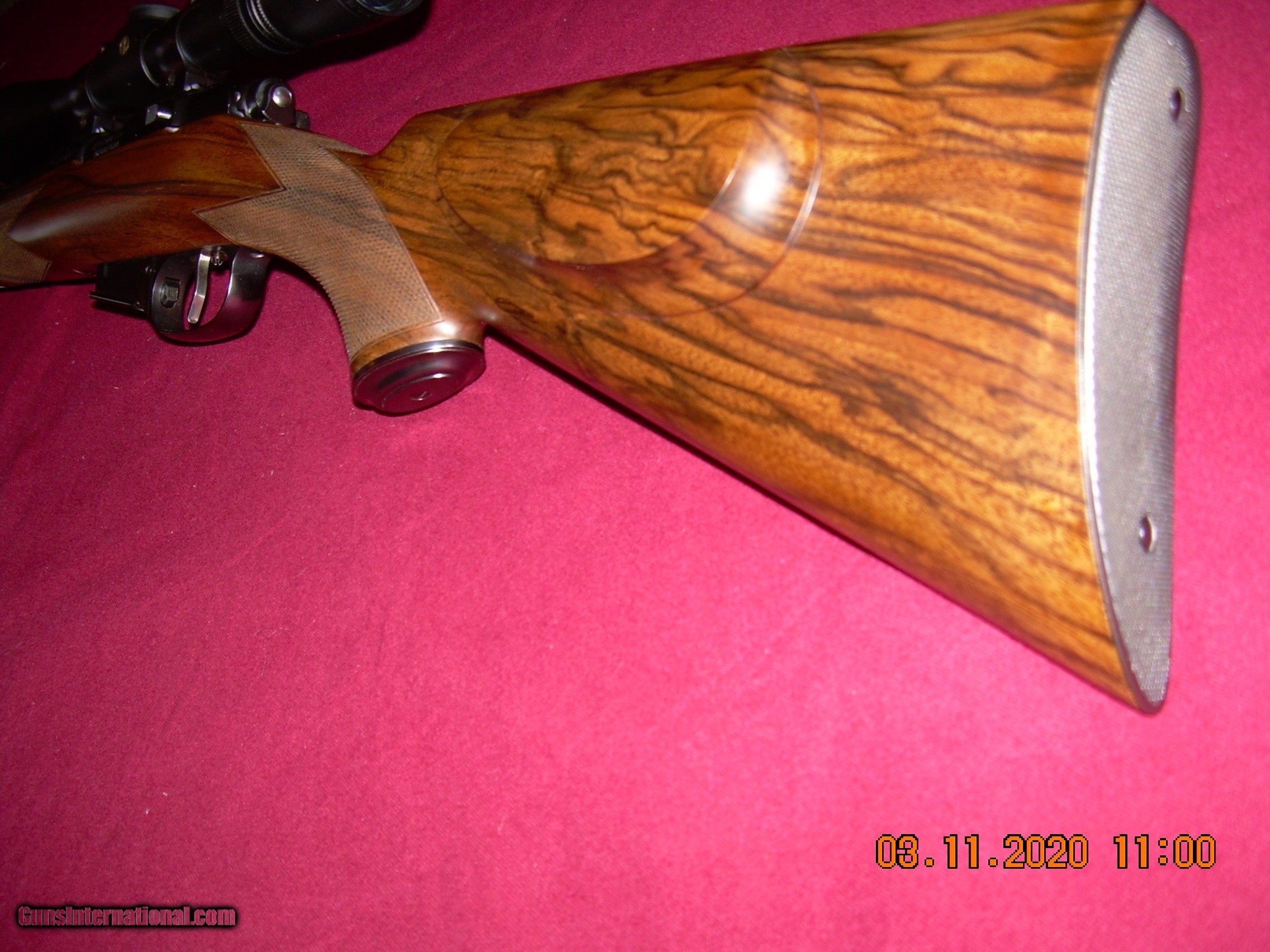 Description: Beautiful, trim little sporter,exhibition grade wood, in cal 22 Hornet with stockwork and metal done by Dennis Potter of southern Wisconsin. Beautiful rust bluing, match grade barrel by Shilen, 24" in length. Detachable magazine, double set triggers, steel buttplate and grip cap, ebony forearm tip, shadow line cheekpiece, about 20 lpi checkering and a 14" LOP to front trigger. Weighs in at 7# 9 oz as pictured with the Leupold vari X 3 3.5-10 with leupold dot reticule. Gun is in 99% plus condition, in and out, fired to sight in and that's about it. Need $65 insured shipping to lower 48 - SALE PENDING - SOLD Manufacturer: Brno Model: ZKW 465 Serial Number: 138xx Barrel Length: 24 Condition: 99%+ |