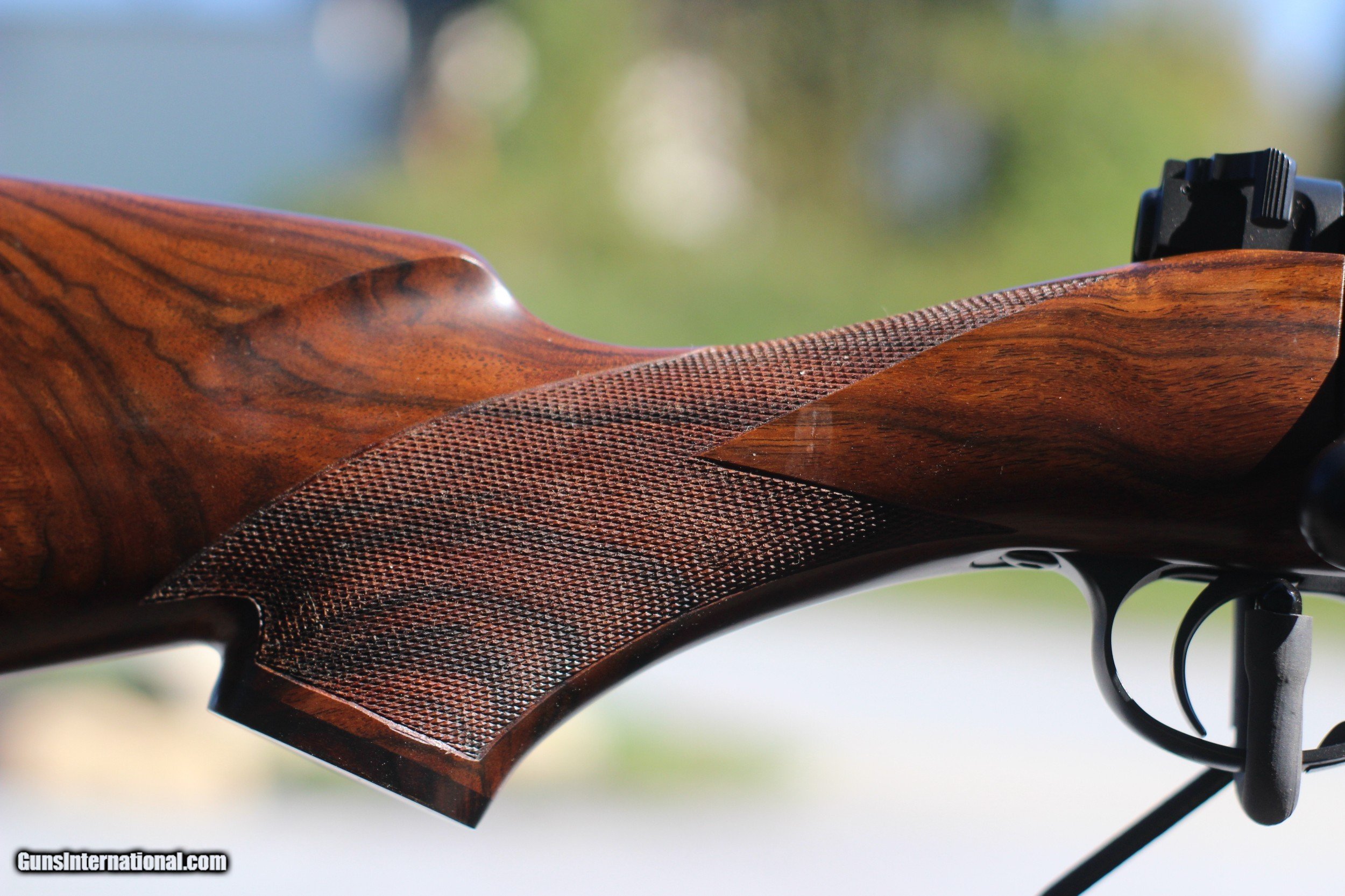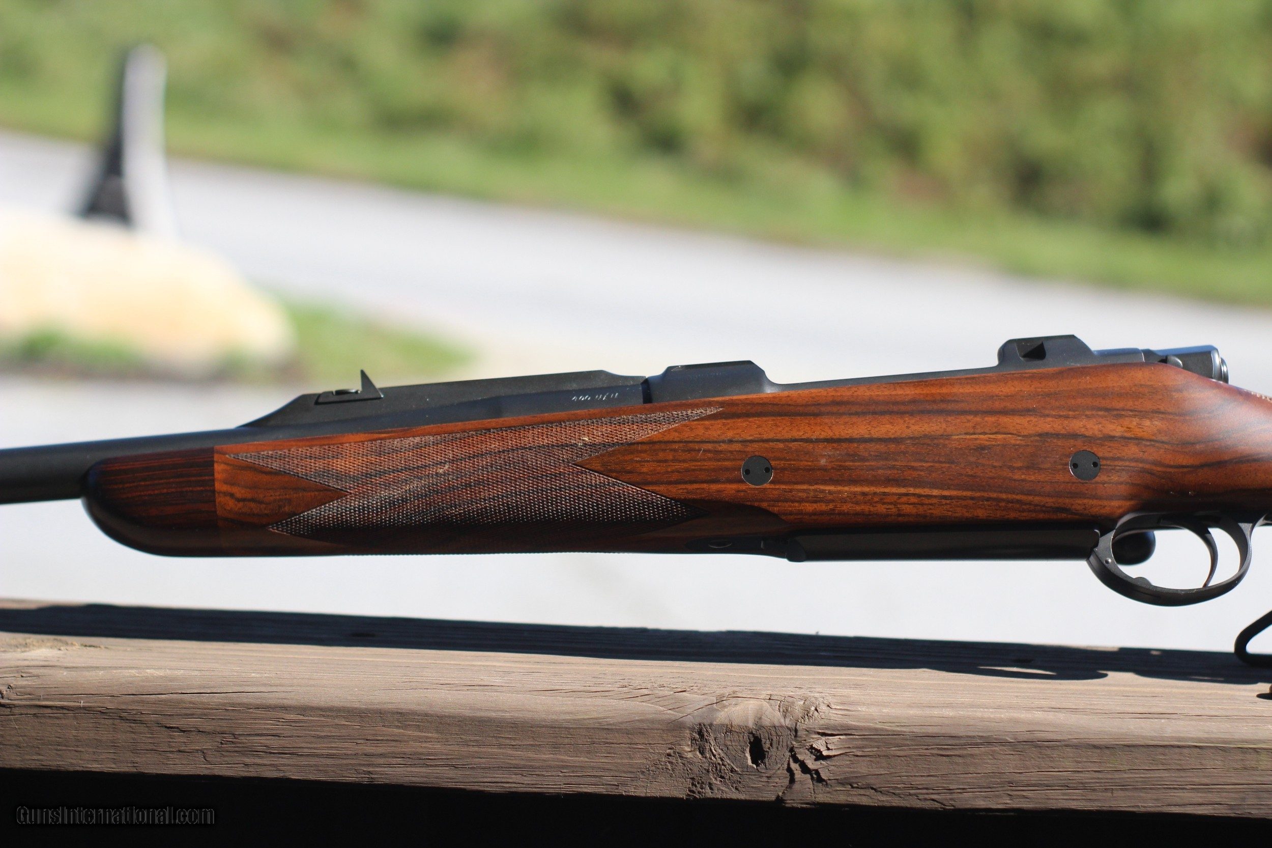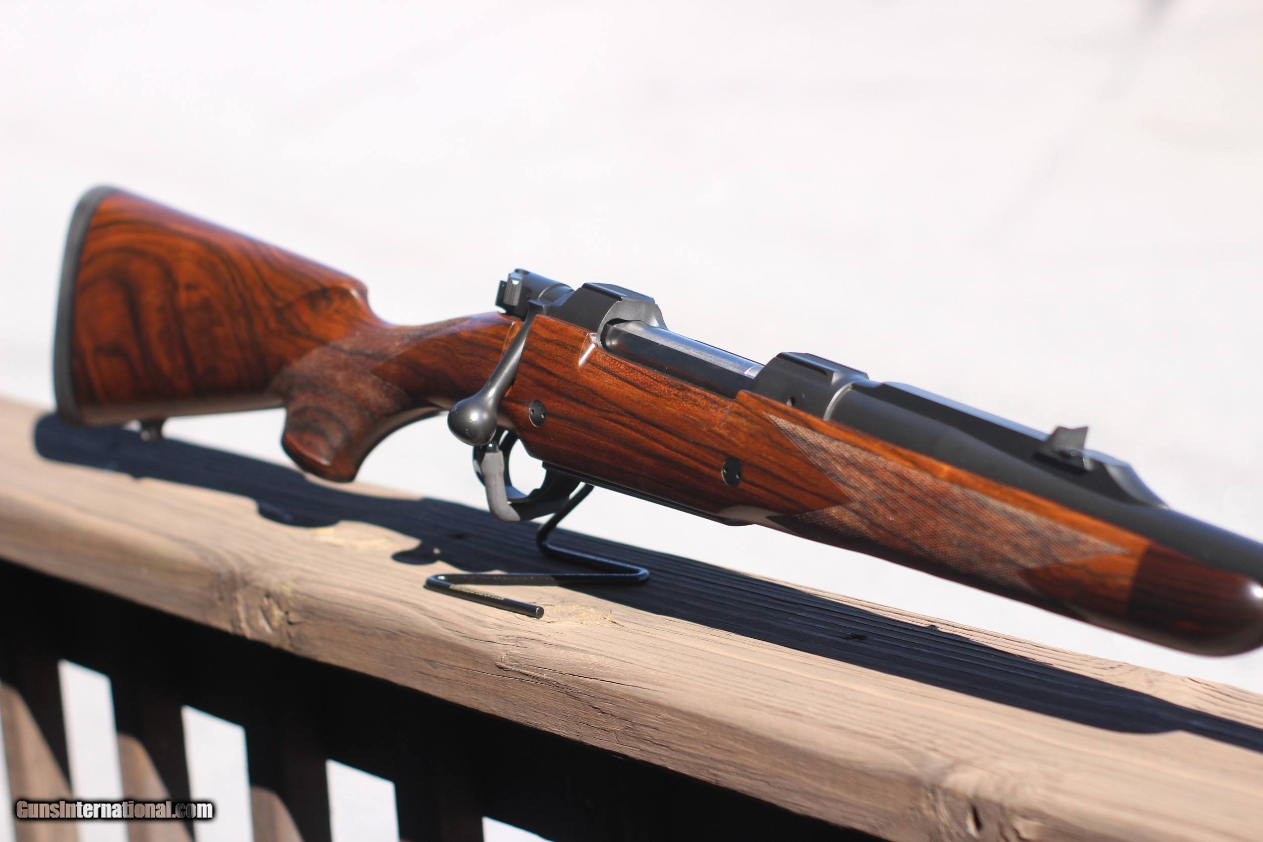 Description: Bolt action by AHR (American Hunting Rifle) 26 " medium taper round barrel with quarter rib Banded express front sight & 1 standing , and 1 folding Custom 5 shot drop box Reworked doublesquare bridge CZ action Qberndorf style bolt knob and 3 position model 70 safety Well figured strong English walnut stock in the classic British style , with layered back grip ,& short forend with rosewood tip Double crossbolted 2nd recoil lug on barrel Stocked to the irons or low mount scope Well balanced safari rifle in near NEW condition 9 lbs 6 oz. 13 3/4 LOP over decelerator Qver $8500 replacement value $ 5995 SOLD |