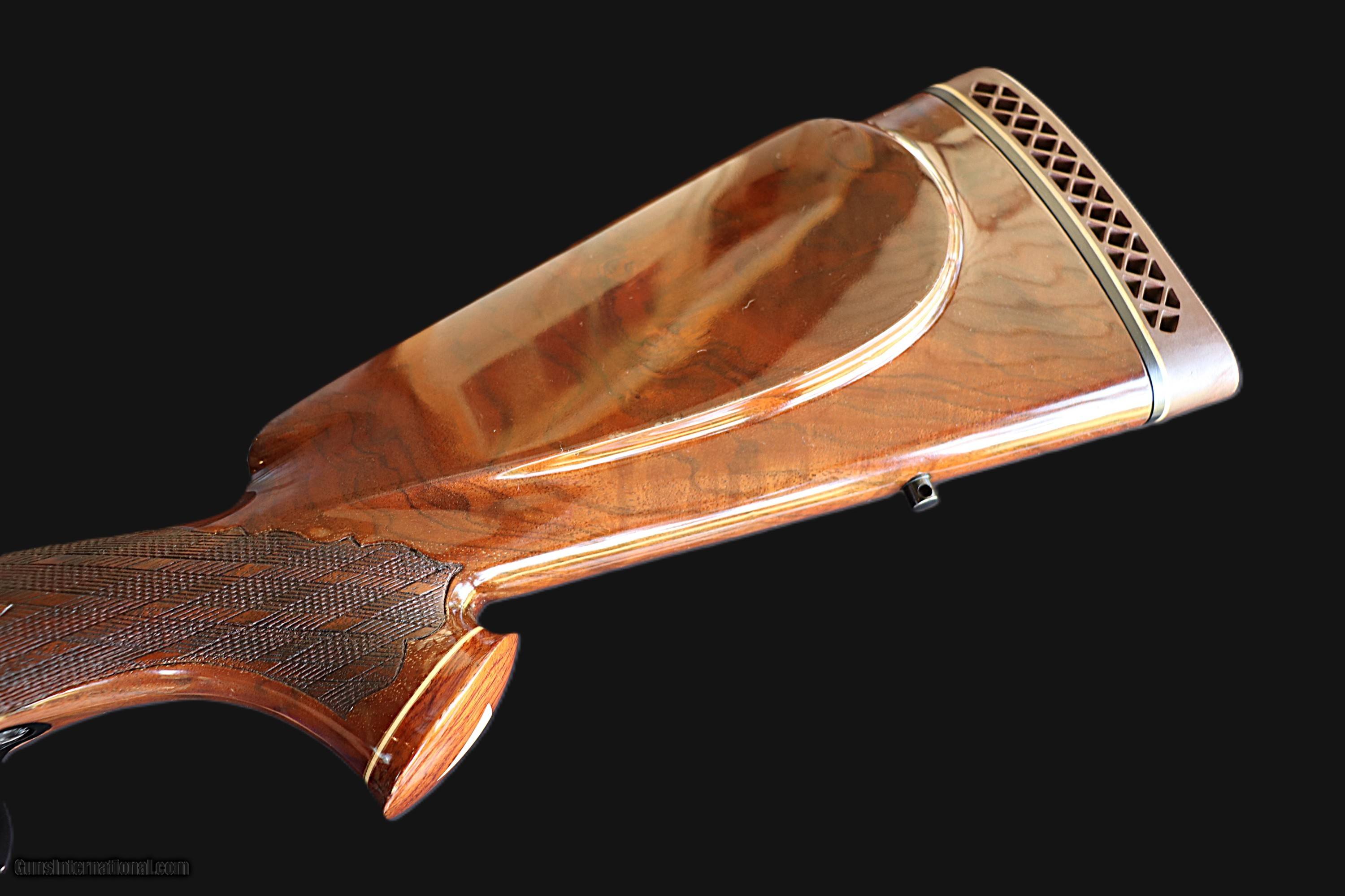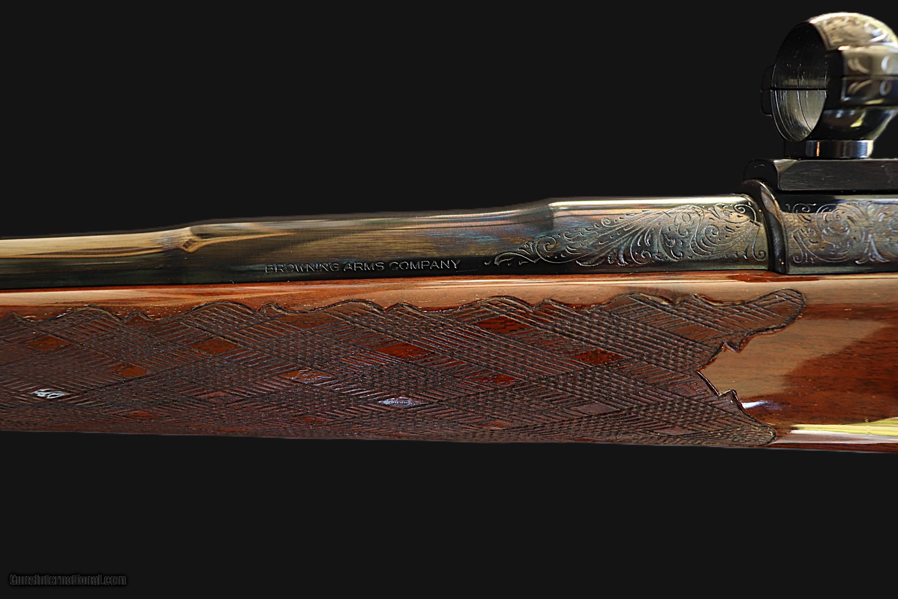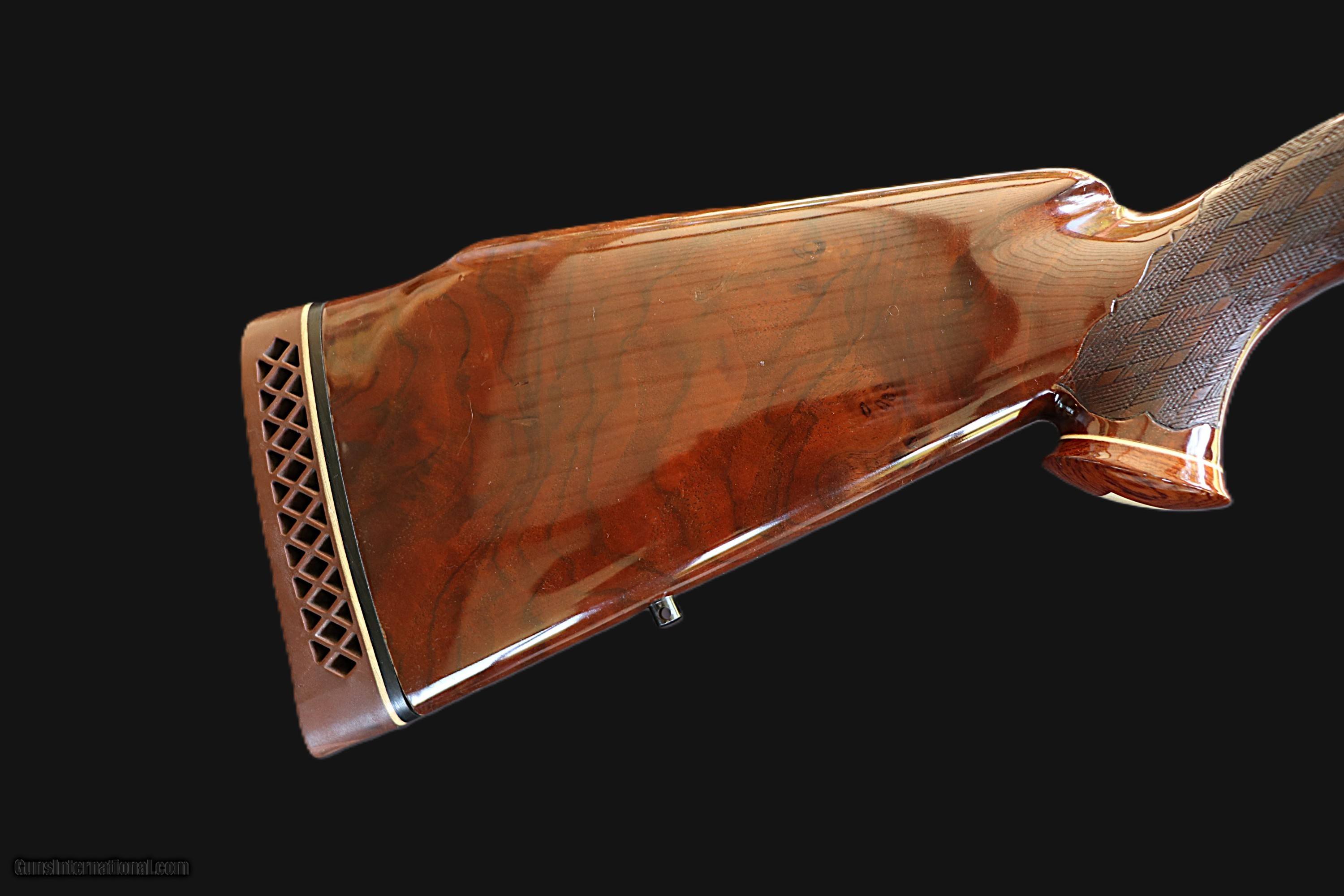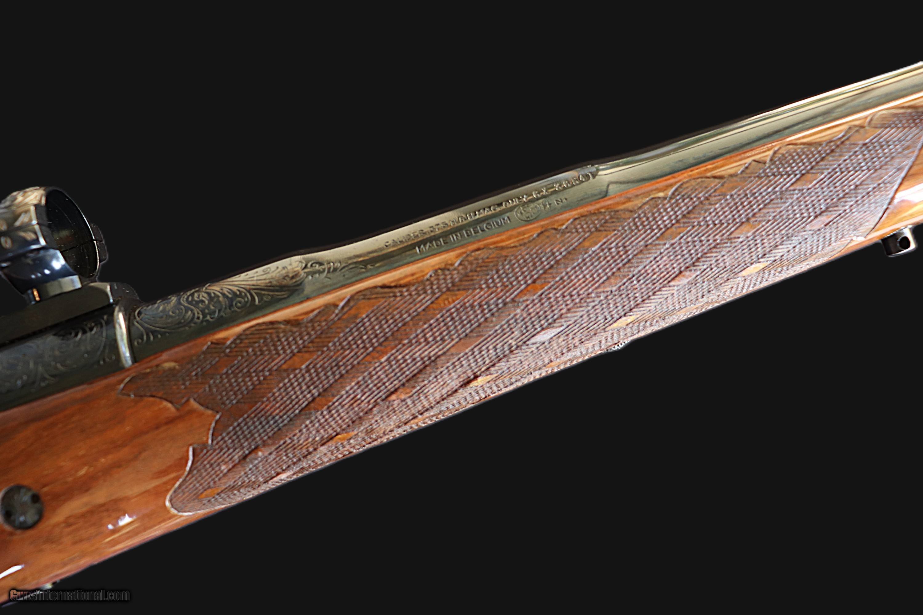 Description: On consignment we have a Belgium manufactured Browning Hi-Power Medallion bolt action rifle in .375 H&H Mag. This rifle features a finely checkered walnut stock with Monte Carlo cheekpiece, brown recoil pad, rosewood forend tip and gripcap, and blued swivel studs, a polished blued receiver with detailed scroll engraving, and 24” blued barrel. Rifle is in excellent condition with light handling marks in the stock, LOP is 13.5/8”. Gun includes Redfield one-piece scope mount and engraved scope rings. Serial number is 6X36641 SOLD Rifle Caliber: .375 H&H Magnum Manufacturer: Browning Model: High Power Medallion Serial Number: 6X36641 |