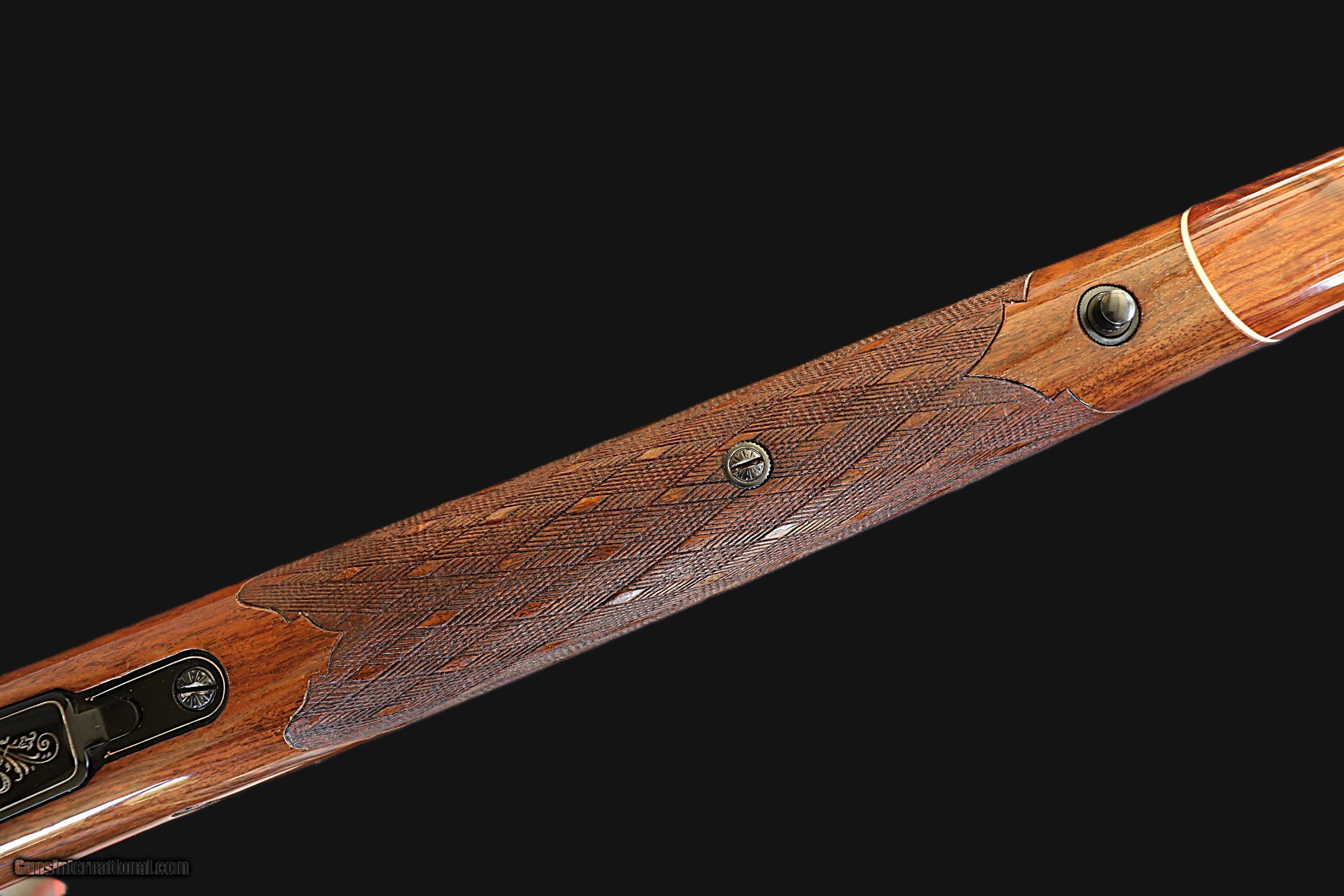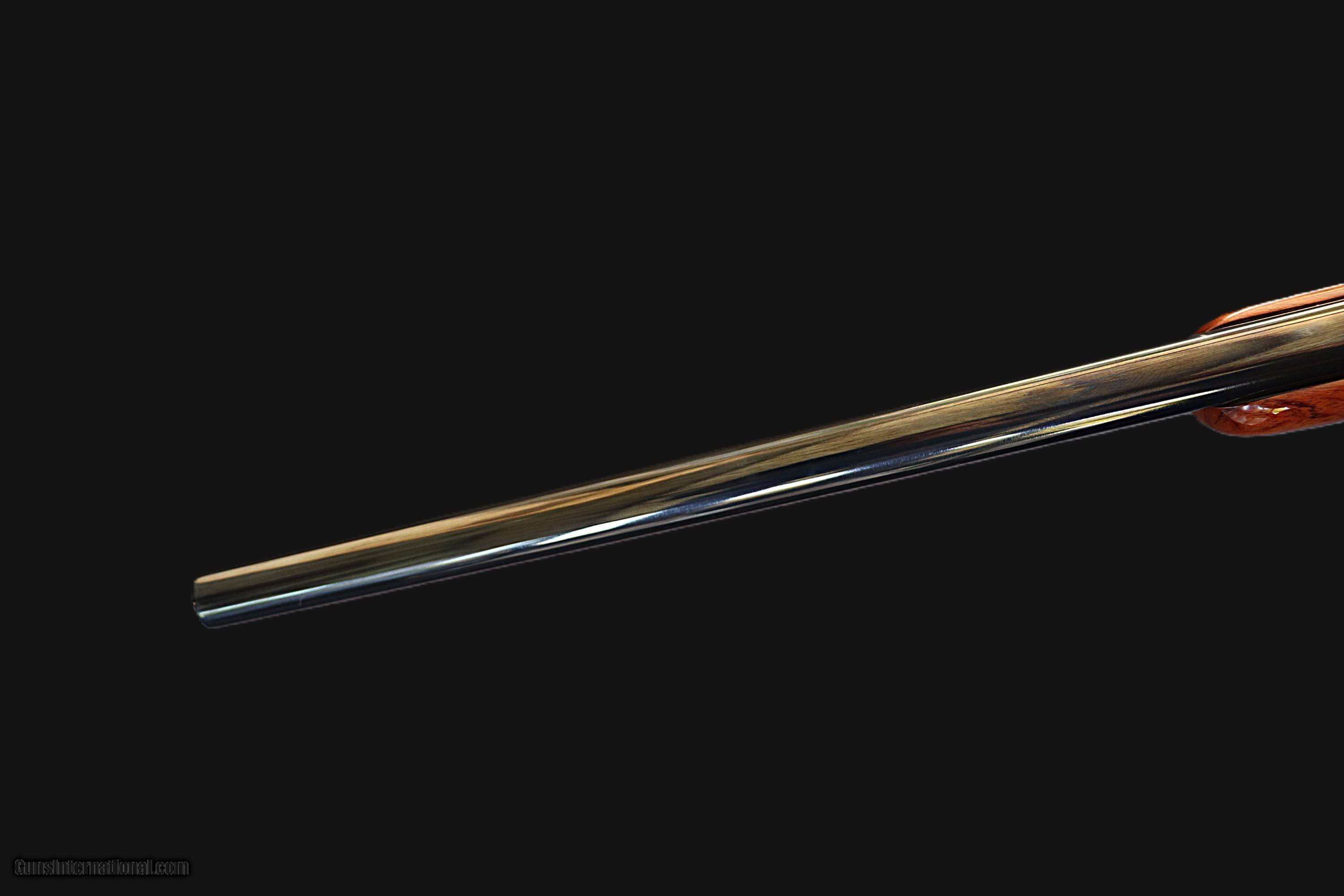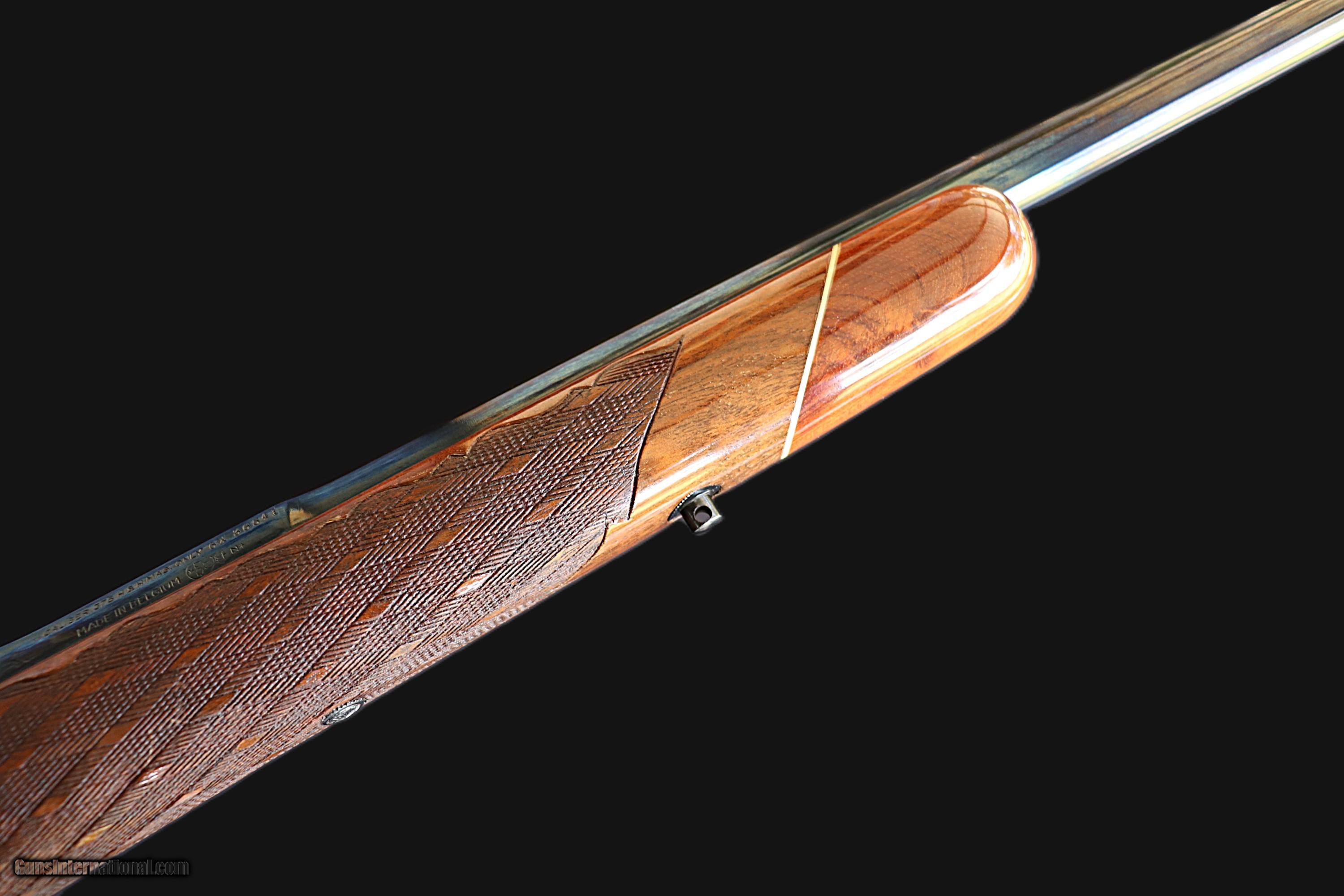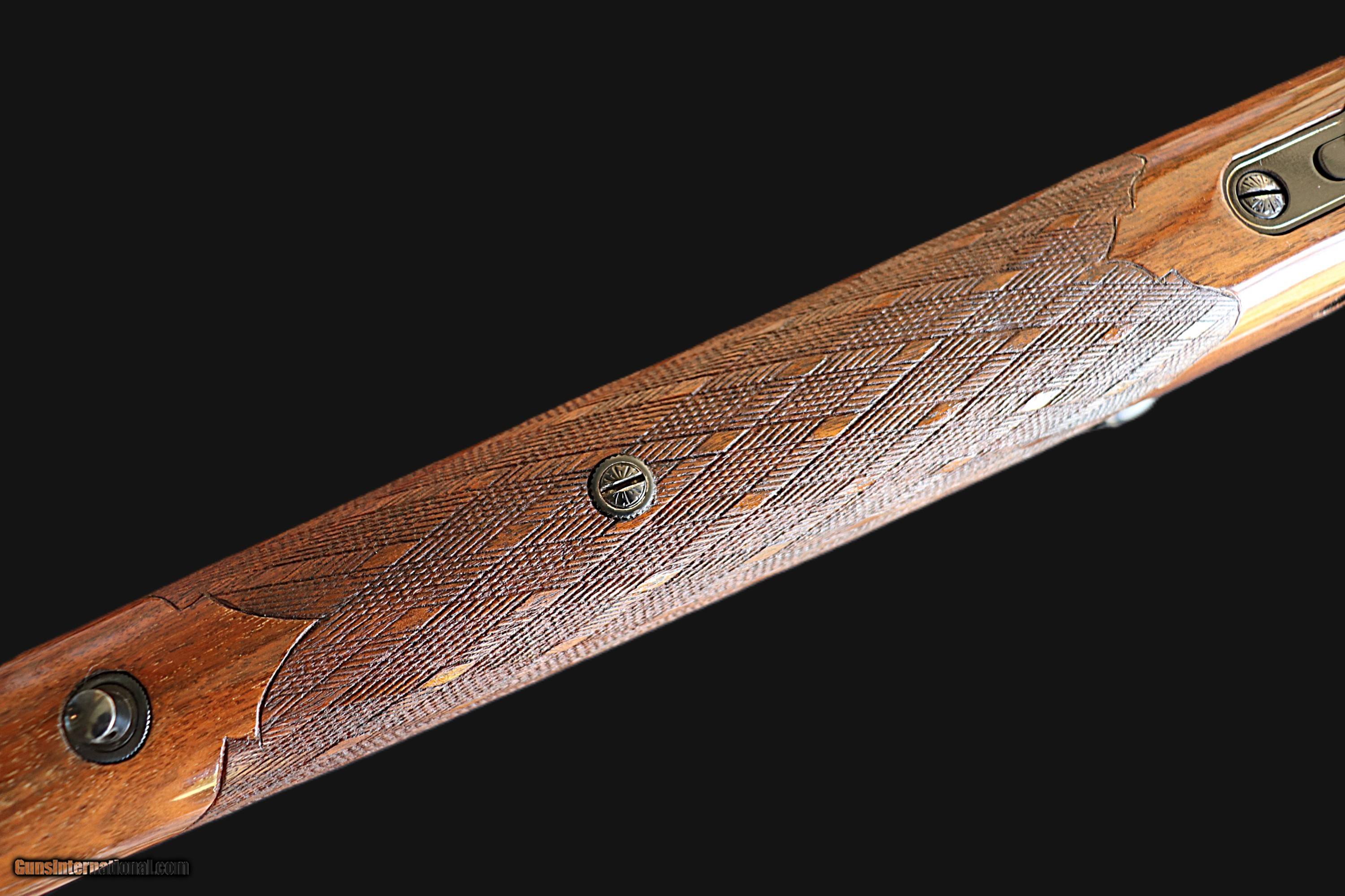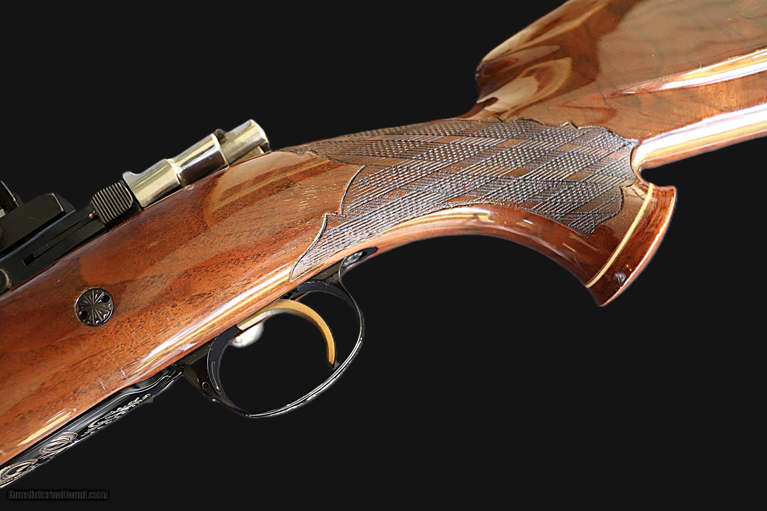 Description: On consignment we have a Belgium manufactured Browning Hi-Power Medallion bolt action rifle in .375 H&H Mag. This rifle features a finely checkered walnut stock with Monte Carlo cheekpiece, brown recoil pad, rosewood forend tip and gripcap, and blued swivel studs, a polished blued receiver with detailed scroll engraving, and 24” blued barrel. Rifle is in excellent condition with light handling marks in the stock, LOP is 13.5/8”. Gun includes Redfield one-piece scope mount and engraved scope rings. Serial number is 6X36641 SOLD Rifle Caliber: .375 H&H Magnum Manufacturer: Browning Model: High Power Medallion Serial Number: 6X36641 |