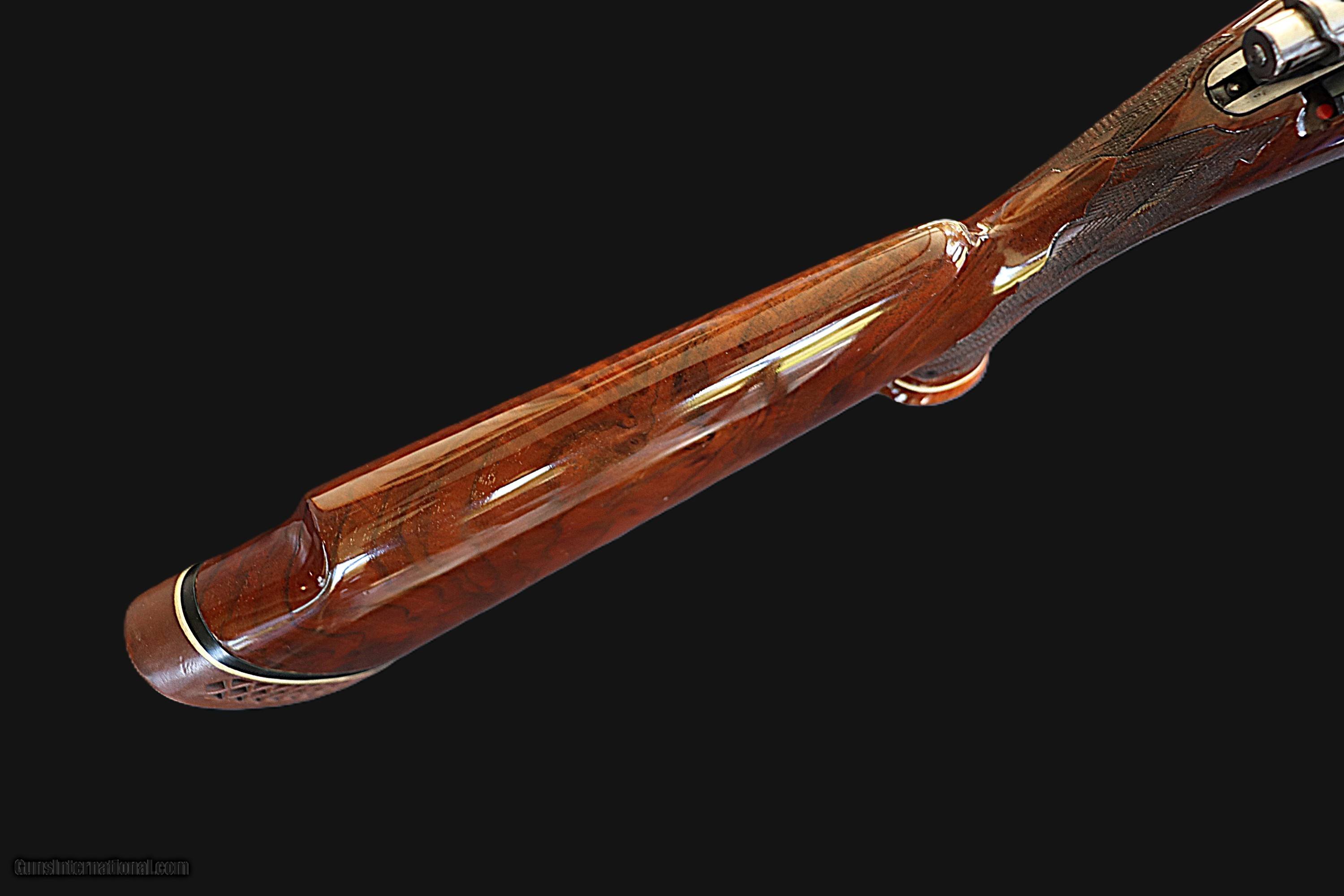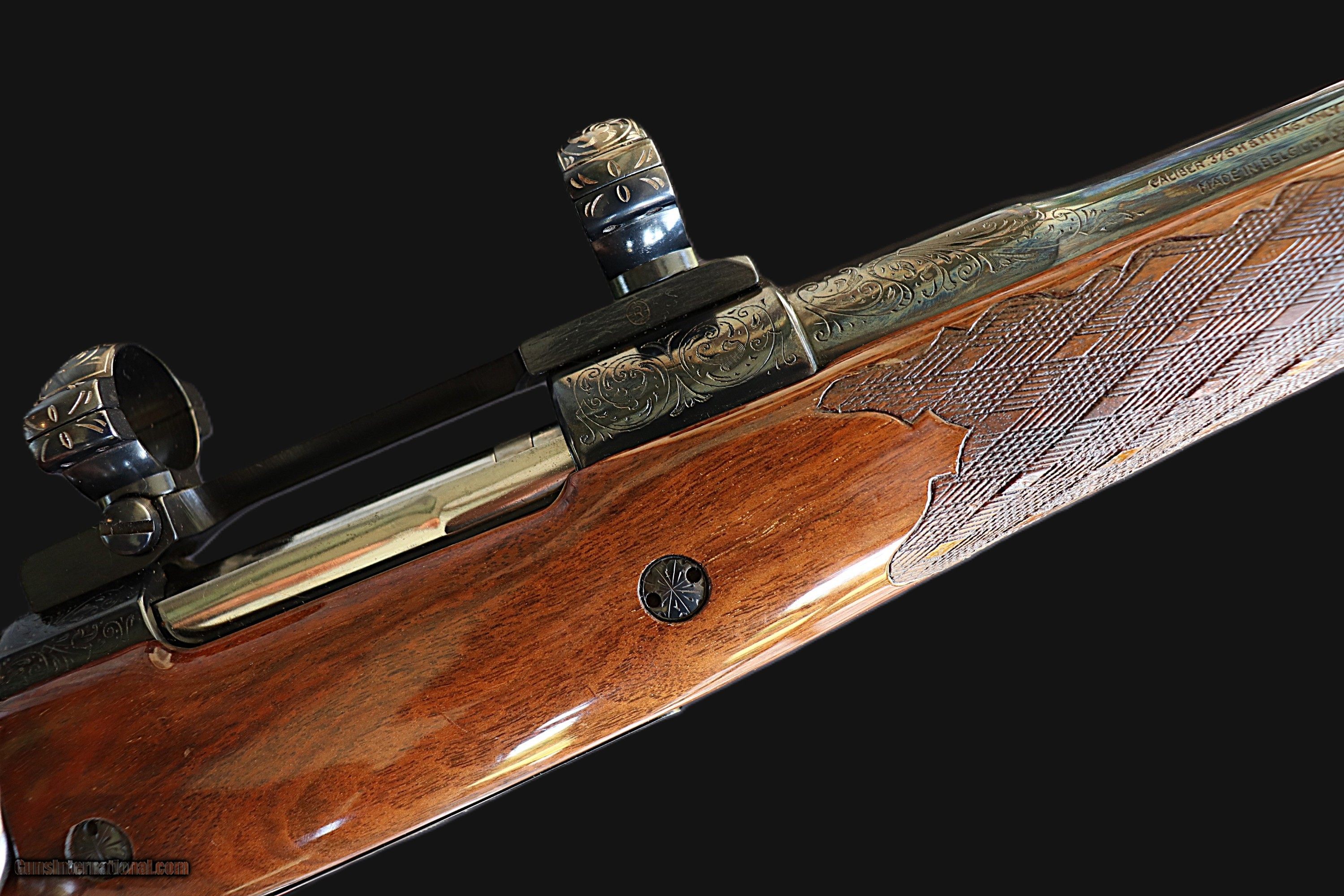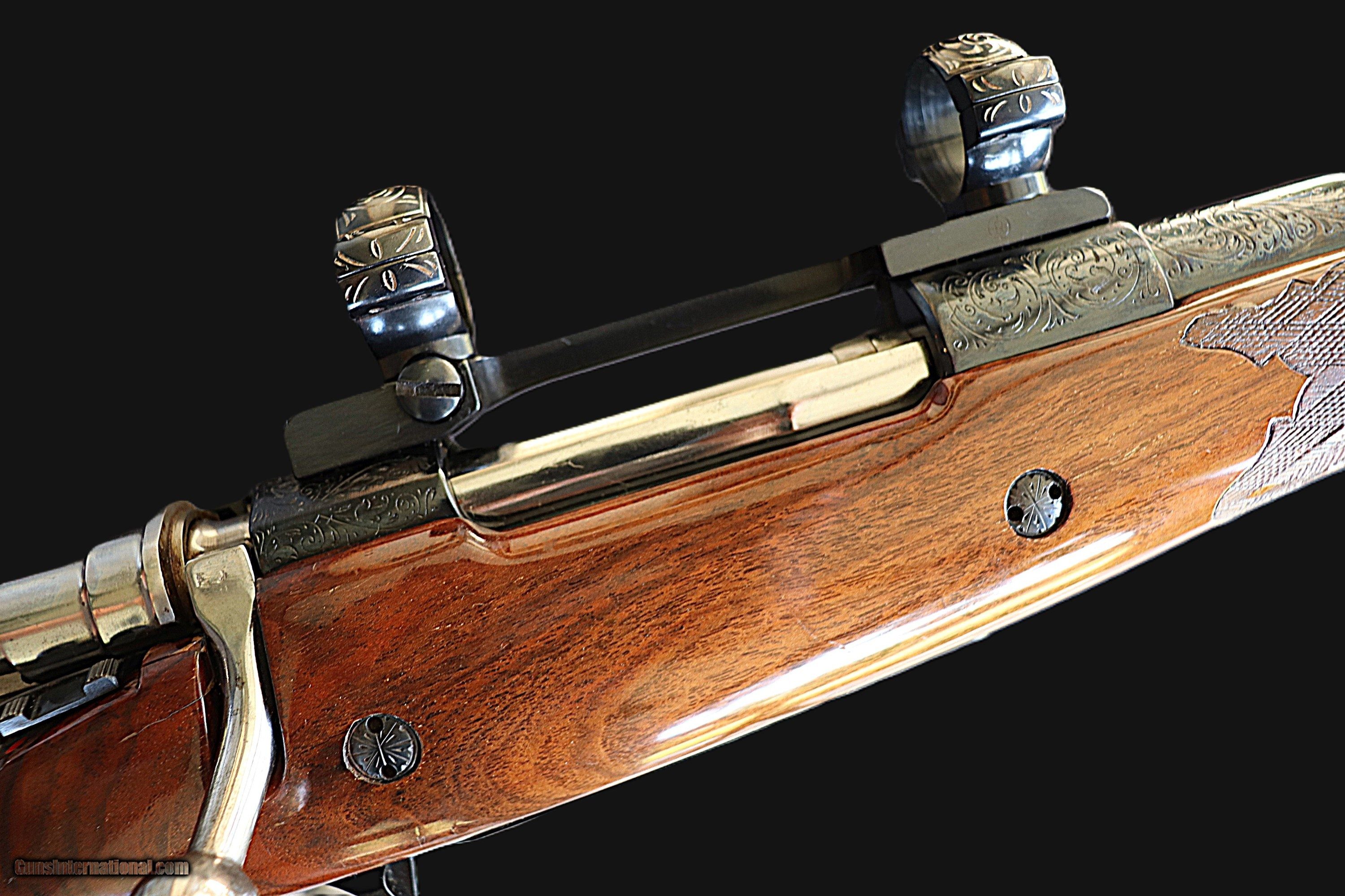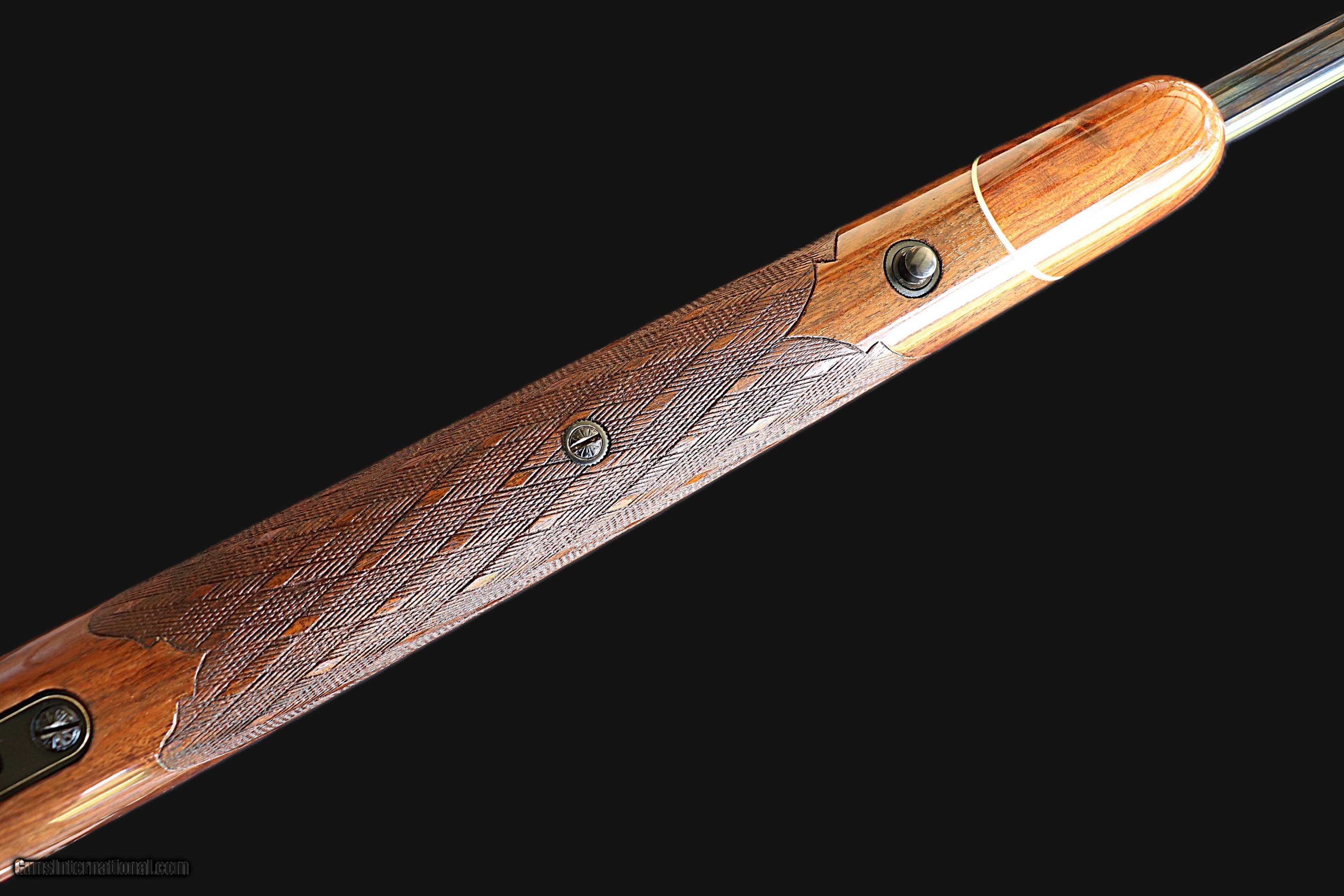 Description: On consignment we have a Belgium manufactured Browning Hi-Power Medallion bolt action rifle in .375 H&H Mag. This rifle features a finely checkered walnut stock with Monte Carlo cheekpiece, brown recoil pad, rosewood forend tip and gripcap, and blued swivel studs, a polished blued receiver with detailed scroll engraving, and 24” blued barrel. Rifle is in excellent condition with light handling marks in the stock, LOP is 13.5/8”. Gun includes Redfield one-piece scope mount and engraved scope rings. Serial number is 6X36641 SOLD Rifle Caliber: .375 H&H Magnum Manufacturer: Browning Model: High Power Medallion Serial Number: 6X36641 |