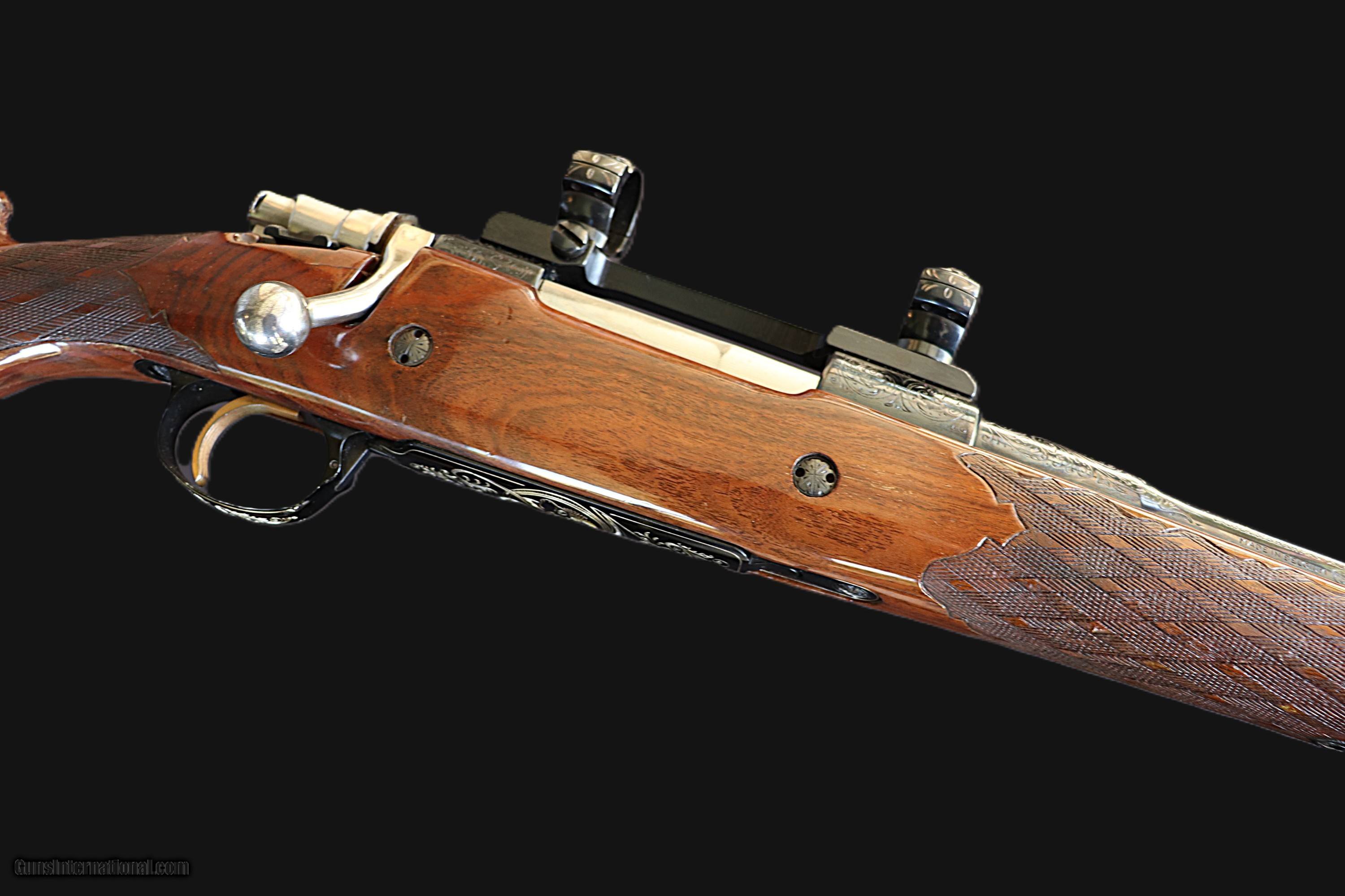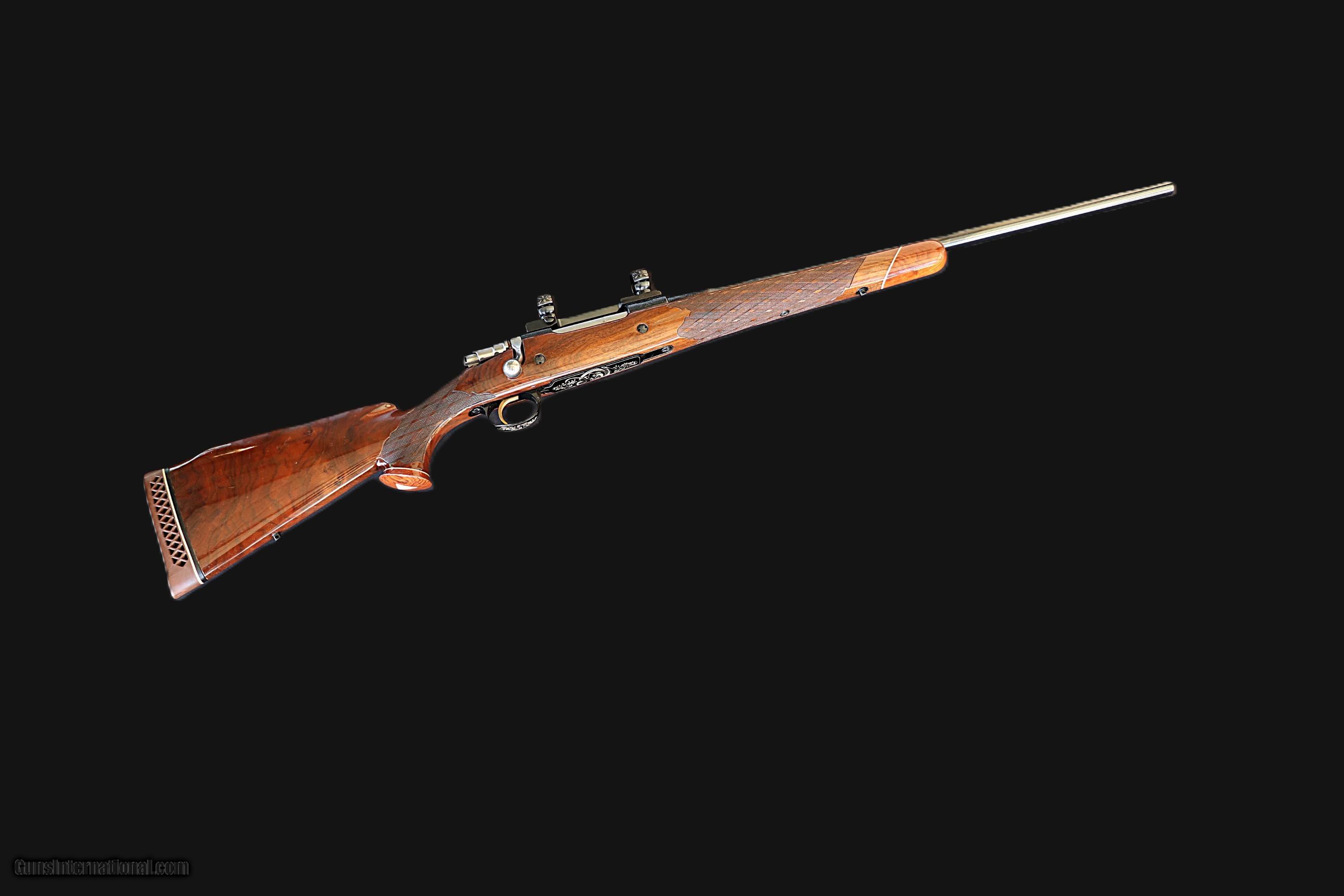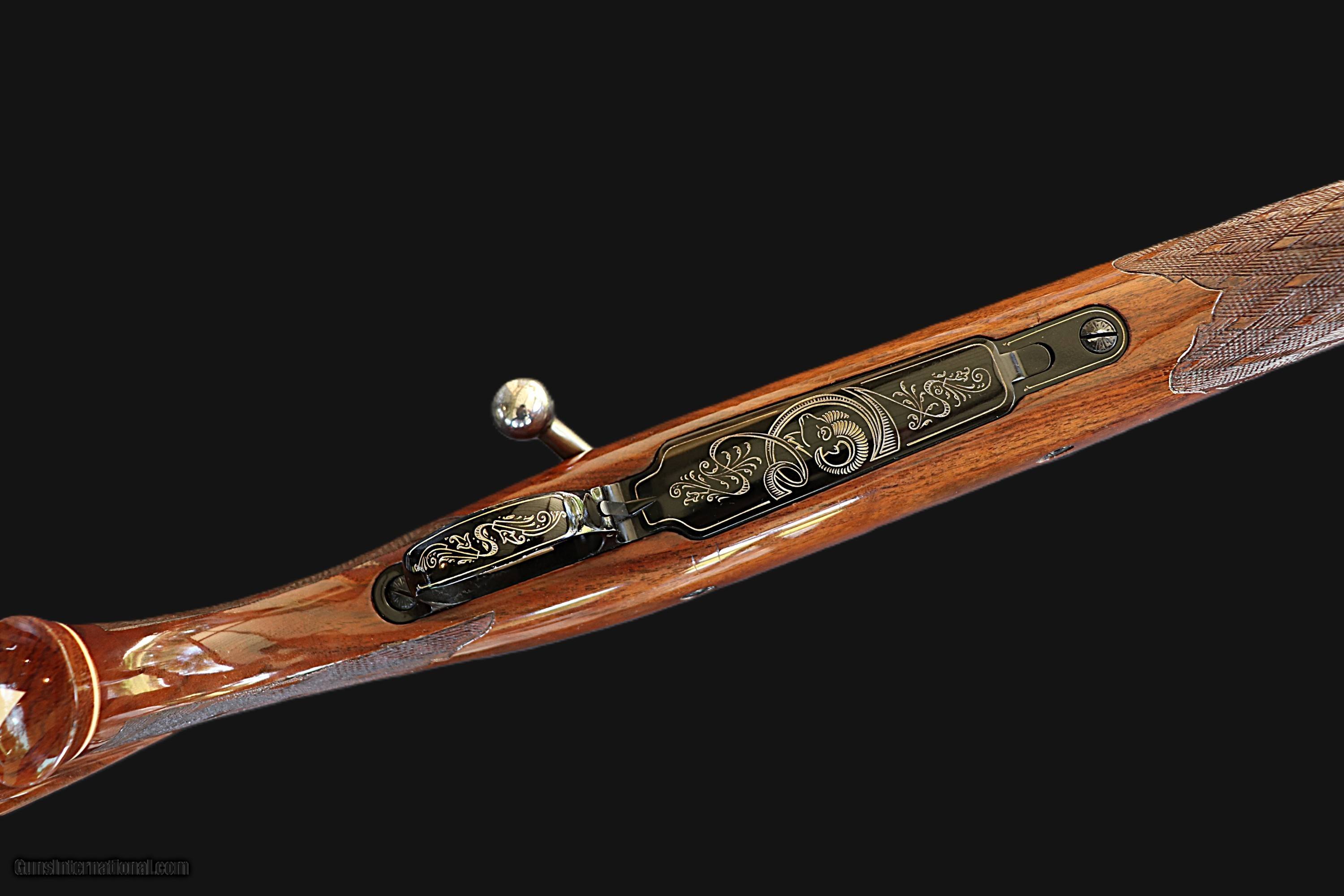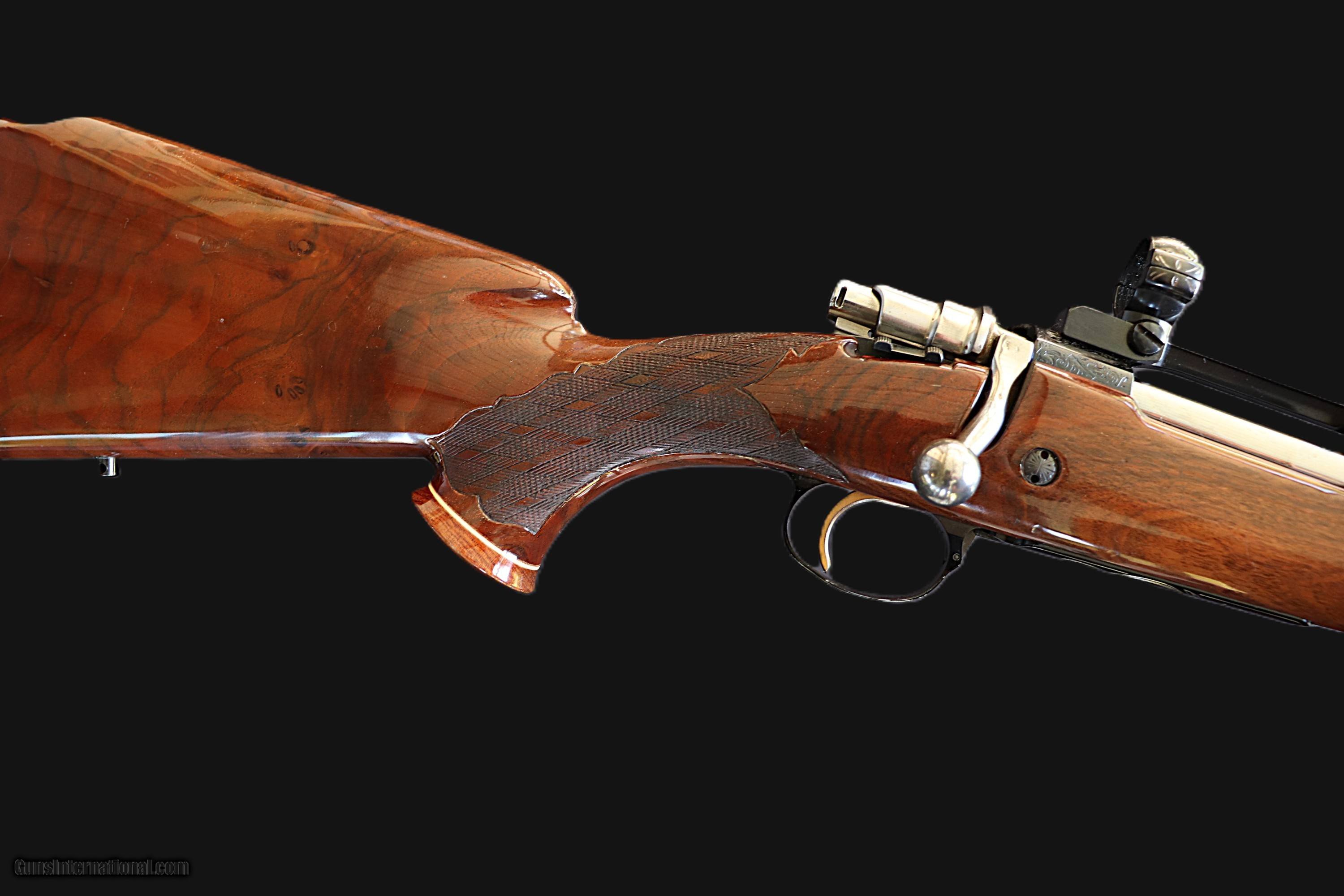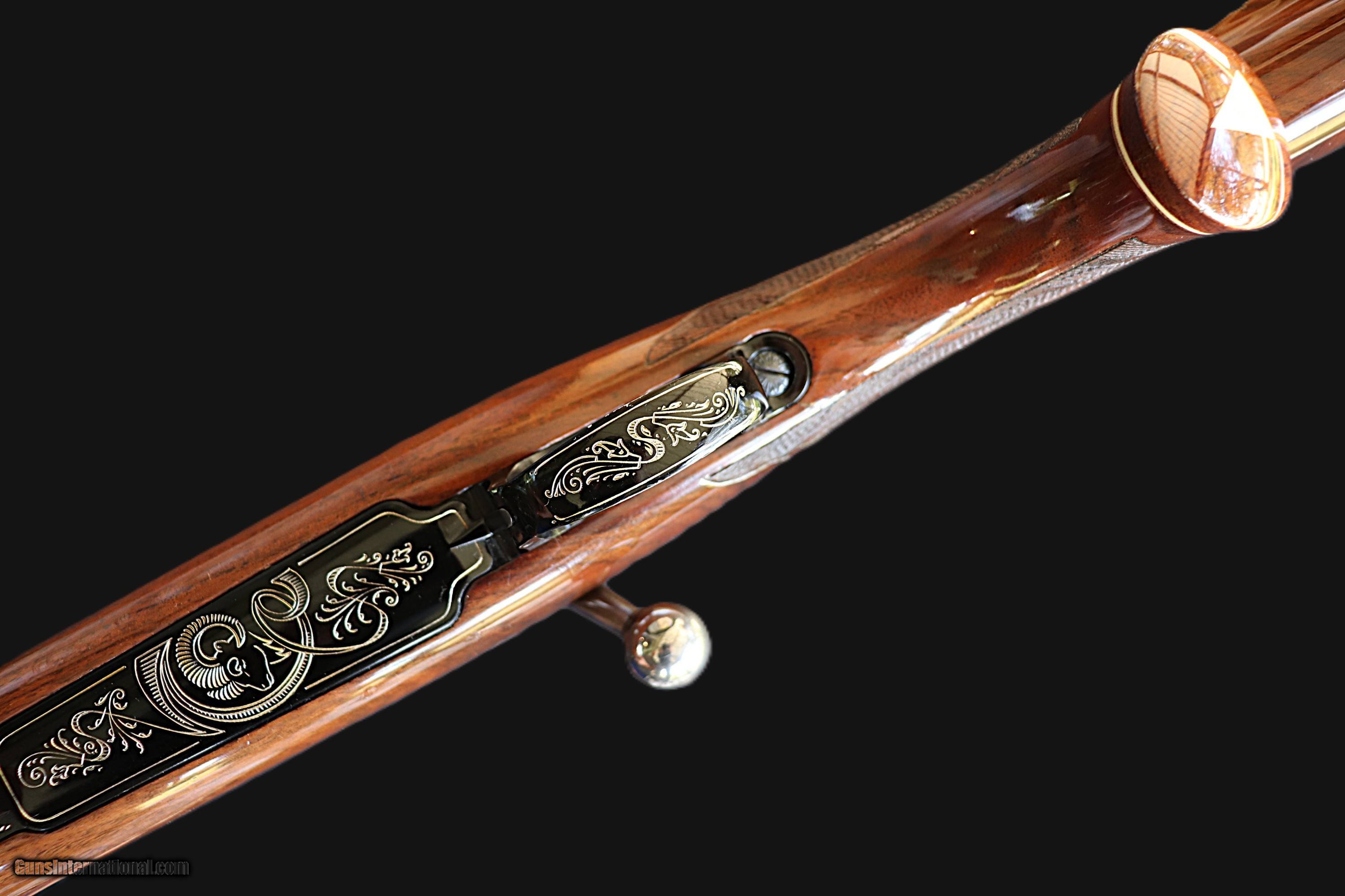 Description: On consignment we have a Belgium manufactured Browning Hi-Power Medallion bolt action rifle in .375 H&H Mag. This rifle features a finely checkered walnut stock with Monte Carlo cheekpiece, brown recoil pad, rosewood forend tip and gripcap, and blued swivel studs, a polished blued receiver with detailed scroll engraving, and 24” blued barrel. Rifle is in excellent condition with light handling marks in the stock, LOP is 13.5/8”. Gun includes Redfield one-piece scope mount and engraved scope rings. Serial number is 6X36641 SOLD Rifle Caliber: .375 H&H Magnum Manufacturer: Browning Model: High Power Medallion Serial Number: 6X36641 |