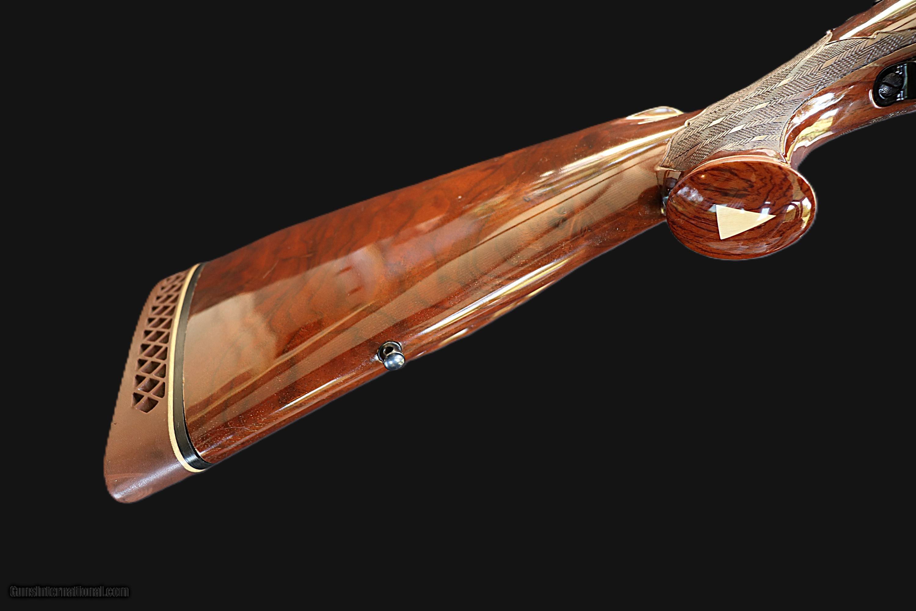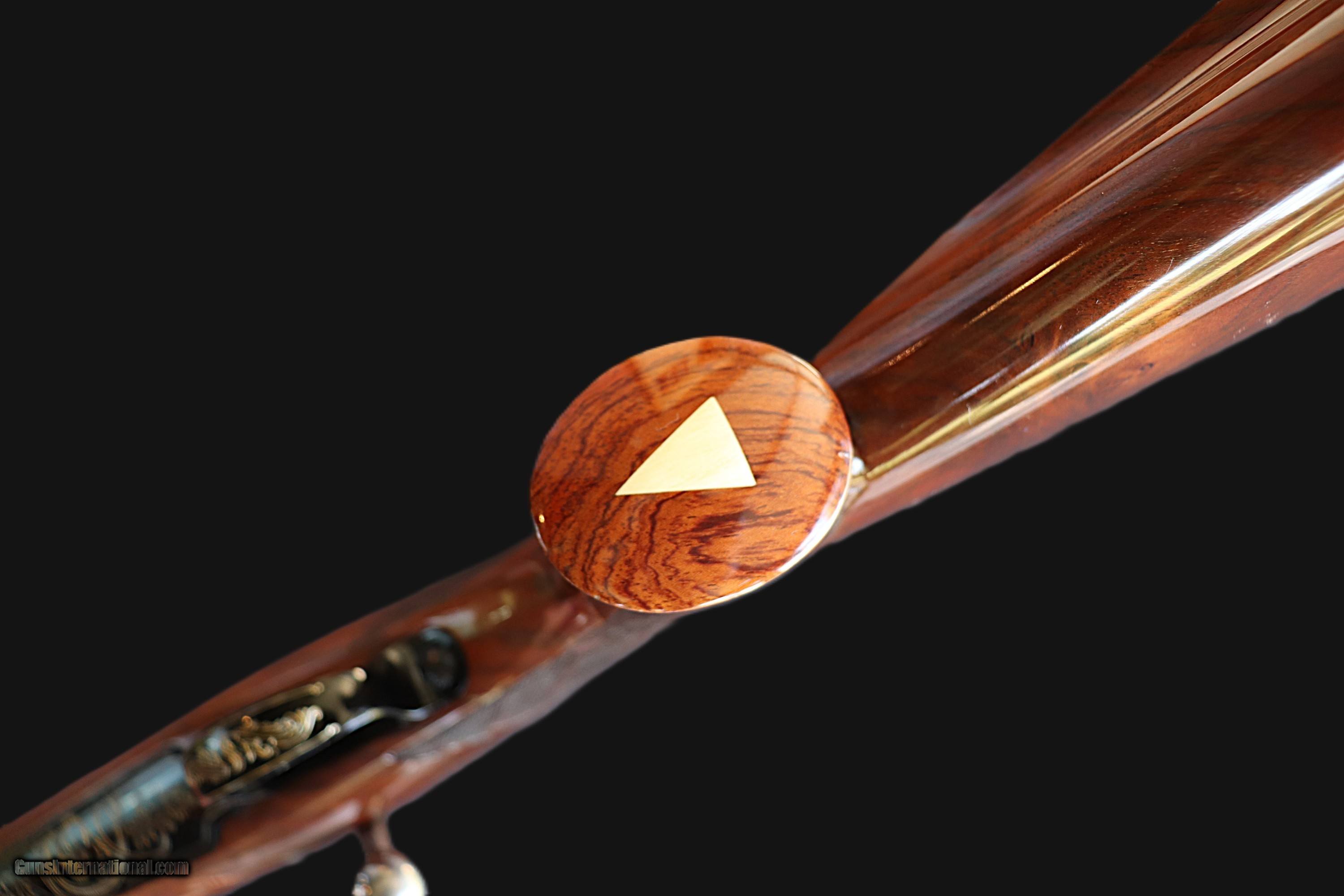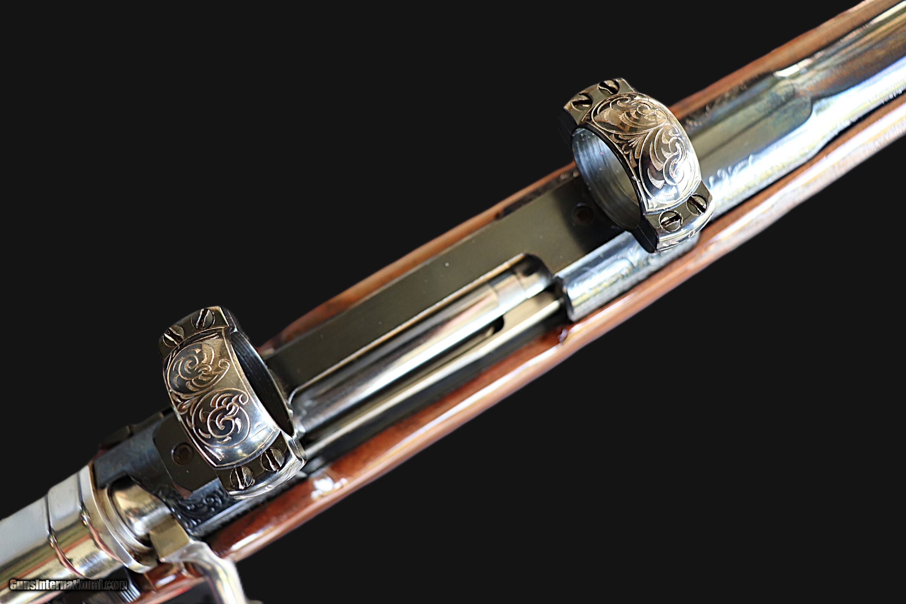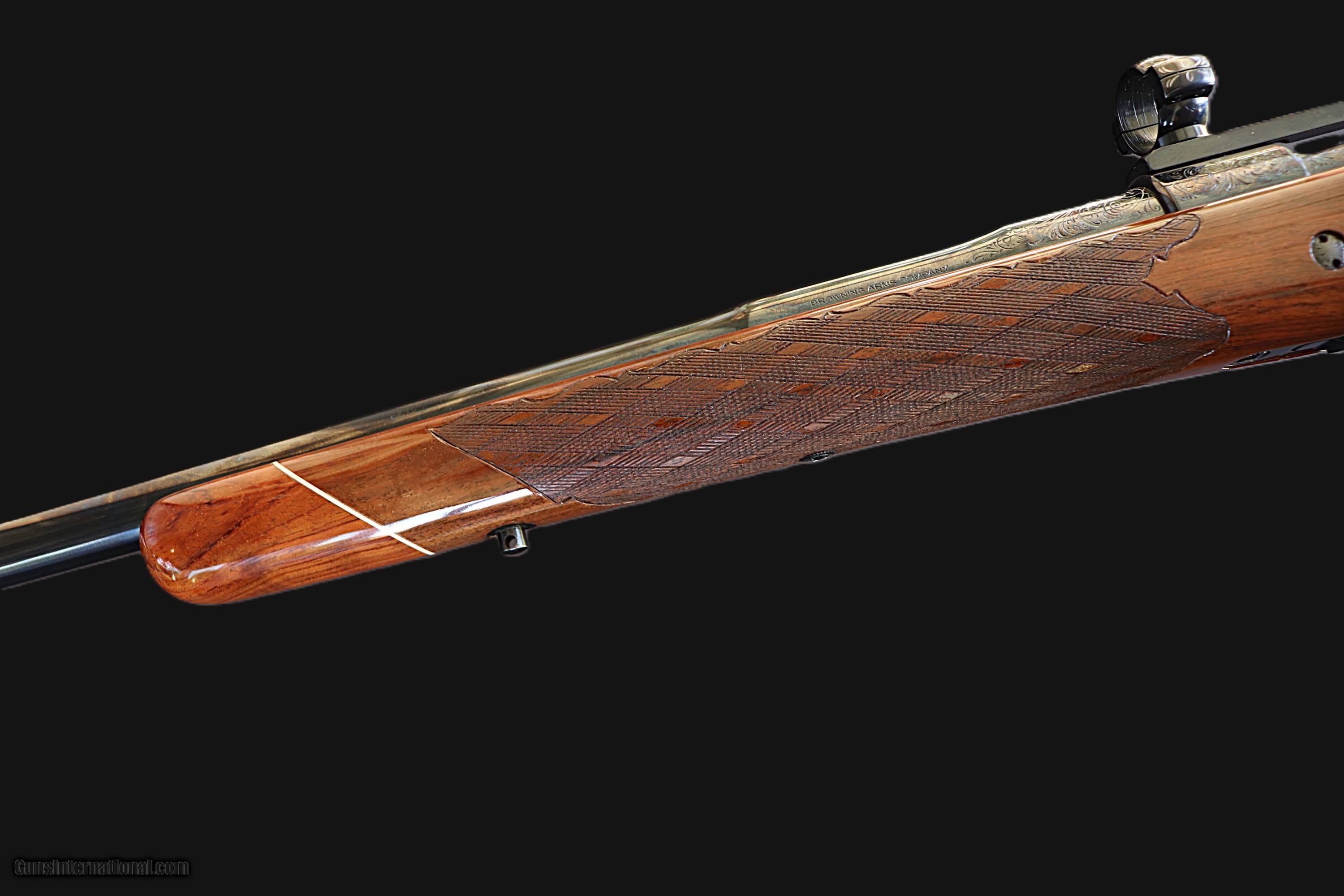 Description: On consignment we have a Belgium manufactured Browning Hi-Power Medallion bolt action rifle in .375 H&H Mag. This rifle features a finely checkered walnut stock with Monte Carlo cheekpiece, brown recoil pad, rosewood forend tip and gripcap, and blued swivel studs, a polished blued receiver with detailed scroll engraving, and 24” blued barrel. Rifle is in excellent condition with light handling marks in the stock, LOP is 13.5/8”. Gun includes Redfield one-piece scope mount and engraved scope rings. Serial number is 6X36641 SOLD Rifle Caliber: .375 H&H Magnum Manufacturer: Browning Model: High Power Medallion Serial Number: 6X36641 |