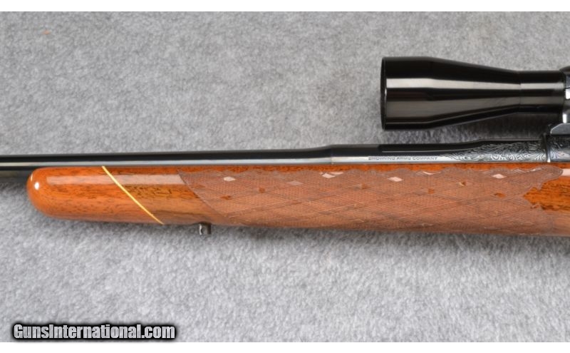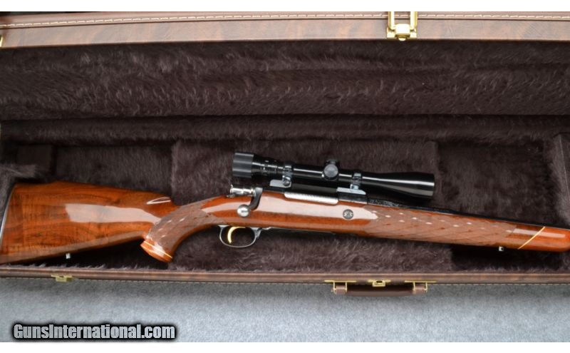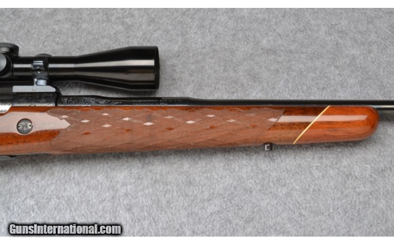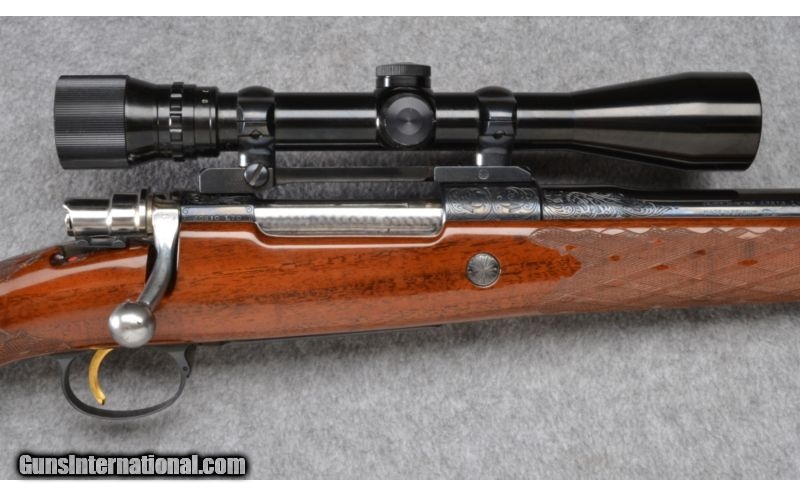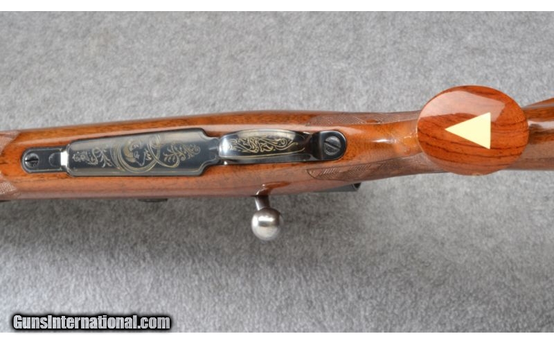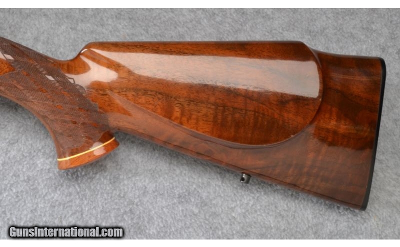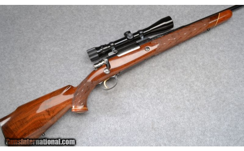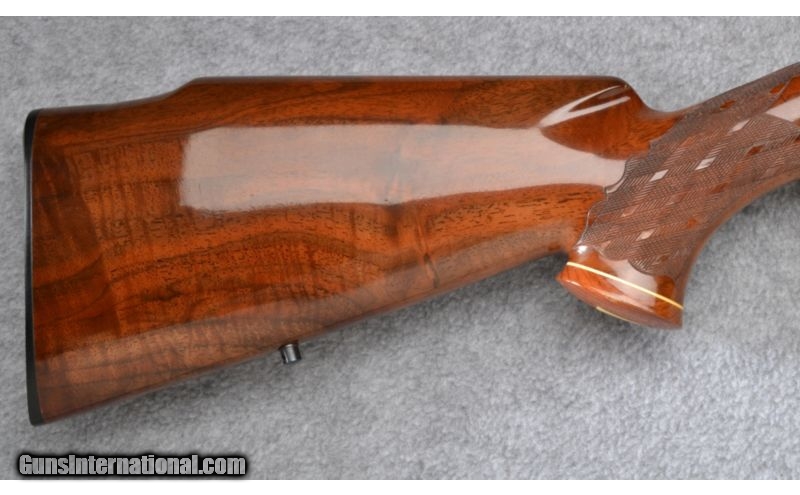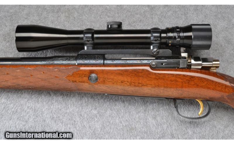 Description: Bolt handle has a few spots of old freckling. Remainder is excellent throughout complete with an older Bausch & Lomb Balvar optic. SOLD Manufacturer: S/N 60XXXL70 Caliber Info: .30-06 Metal Condition: Excellent Wood Condition: Excellent Bore Condition: Excellent Barrels: 22 Triggers: Factory Stock: Checkered Walnut Pistol Grip with Contrasting Cap Stock Dimensions: 13 3/4" LOP Fore End: Checkered Walnut with Contrasting Cap Butt Pad: Black Plastic Weight: 8 1/2 LB Sights: None - Bausch & Lomb 2.5-8x Optic Item Location: Wheeling, WV |