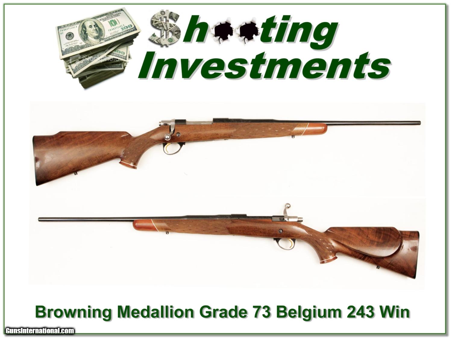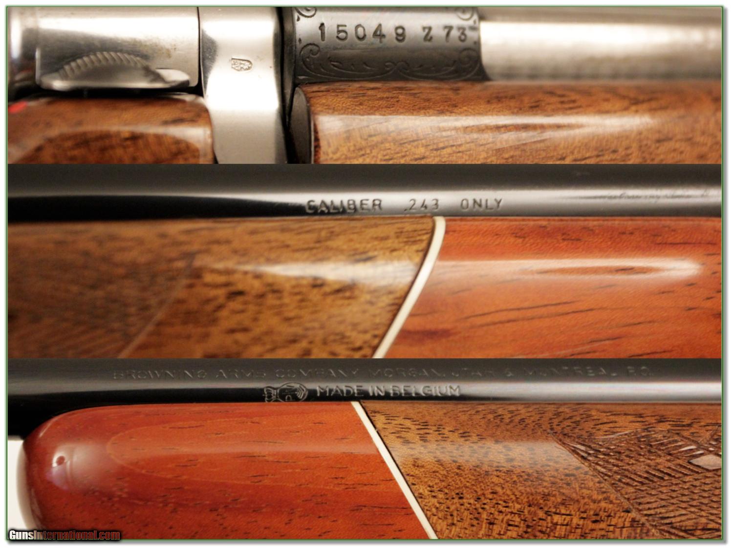 Description: Collectors, this is a 1973 Belgium made Browning Medallion grade in 243 pencil barrel. It is possible unfired as I see no evidence from the bolt face. I don’t think it ever had a scope on it. This one was made after the saltwood issues so no problem there. The blue is as new and I only see a couple insignificant storage marks on the wood. This one will make a nice addition to your collection or be a very high end gun to take to the field. Shipping and insurance is $40 or $18 more if you want it shipped in a new Plano hard case. Please email me with any questions or larger pictures. (I now consign quality firearms only 10%! Let me know if you have any you would like to sell!) [15-1135] Payment: Payment is by Money Order, Cashiers Check or Personal Check. I can now also accept MasterCard and Visa with a 3% convenience fee. PayPal can be used for some items but never firearms. Please let us know if you would like to pay via PayPal. Shipping: The shipping charge will be listed in each description. It is $30 for most guns. Some heavy guns or those insured for over $2000 may be higher. Shipments to Alaska and Hawaii are higher because air shipment is required. Most firearms are shipped within 5 days of receipt of payment. We prefer shipping at the beginning of the week to avoid firearms in transit over weekends. We package all shipments carefully and insure them for the full purchase price, rounded up to the next $100. In the unlikely event that damage occurs, it is important that you save all packaging material for the claims process. Optics are shipped Priority Mail and most other non-firearm shipments are shipped First Class. Returns: Our return policy is simple. If for any reason you are not pleased with your purchase, you may return your item for a refund. The only exception is ammunition, it cannot be returned. It is important to us that you are happy. Guns cannot be fired or dissembled before returning them and must be returned in the same condition as received. Notification of a return must occur with-in 3 days of receipt at your dealer. Shipping, convenience and dealer fees are not refundable and are the responsibility of the buyer. Lay-a-way: If needed, we offer a 60 day lay-a-way option on most firearms. It is 1/3 now, 1/3 in 30 days and 1/3 in 60 days. Lay-a-way firearm sales are final. Consigning your firearms with Shooting Investments: We will help you get top dollar for your firearms. While most local guns shops charge 20% or more, our fee is only 10% with a minimum of $50. At your local gun shop it might take months to sell. Selling on-line provides instant access to thousands of interested buyers. You won’t find any other on-line dealer willing to sell your firearms for only 10% or listing every gun on 4 separate s. Selling through an House typically costs the seller 15% and the buyer an addition 15% (so 30%) and you have to wait several months to sell and longer to receive funds. If properly priced, we will sell your firearms in a week or two. Send us an email or give us a call and we’ll explain how easy it is for you to get top dollar. Trading: We collect guns and usually just trade for guns we want to add to our collections. We often sell guns for others wanting to purchase one of ours. We find this the most fair to both of us. Our Commission is only 10% and we hold the gun you want until yours sells. Please contact us if you want to sell one of yours to buy one of ours. Help for California Buyers: We are happy to ship to California. It is the buyer’s responsibility to make sure any item you buy is legal in your state. We are also happy to help with your purchase of a firearm from someone other than us. If you see a gun you would like to buy but the seller can’t or won’t ship to California we can help. You buy the gun and have it shipped to us. We’ll then ship it to your California dealer. The cost for this service is only $30 + shipping. Let me know if we can help! SOLD |