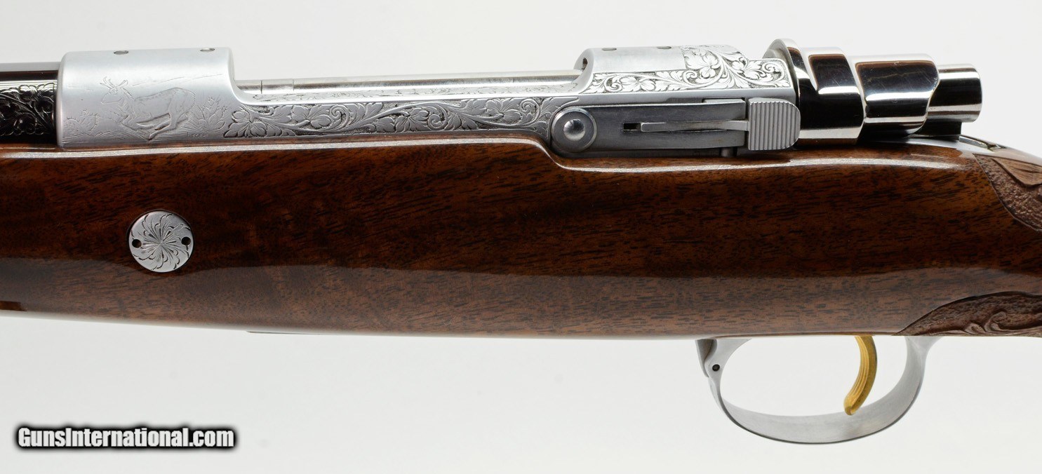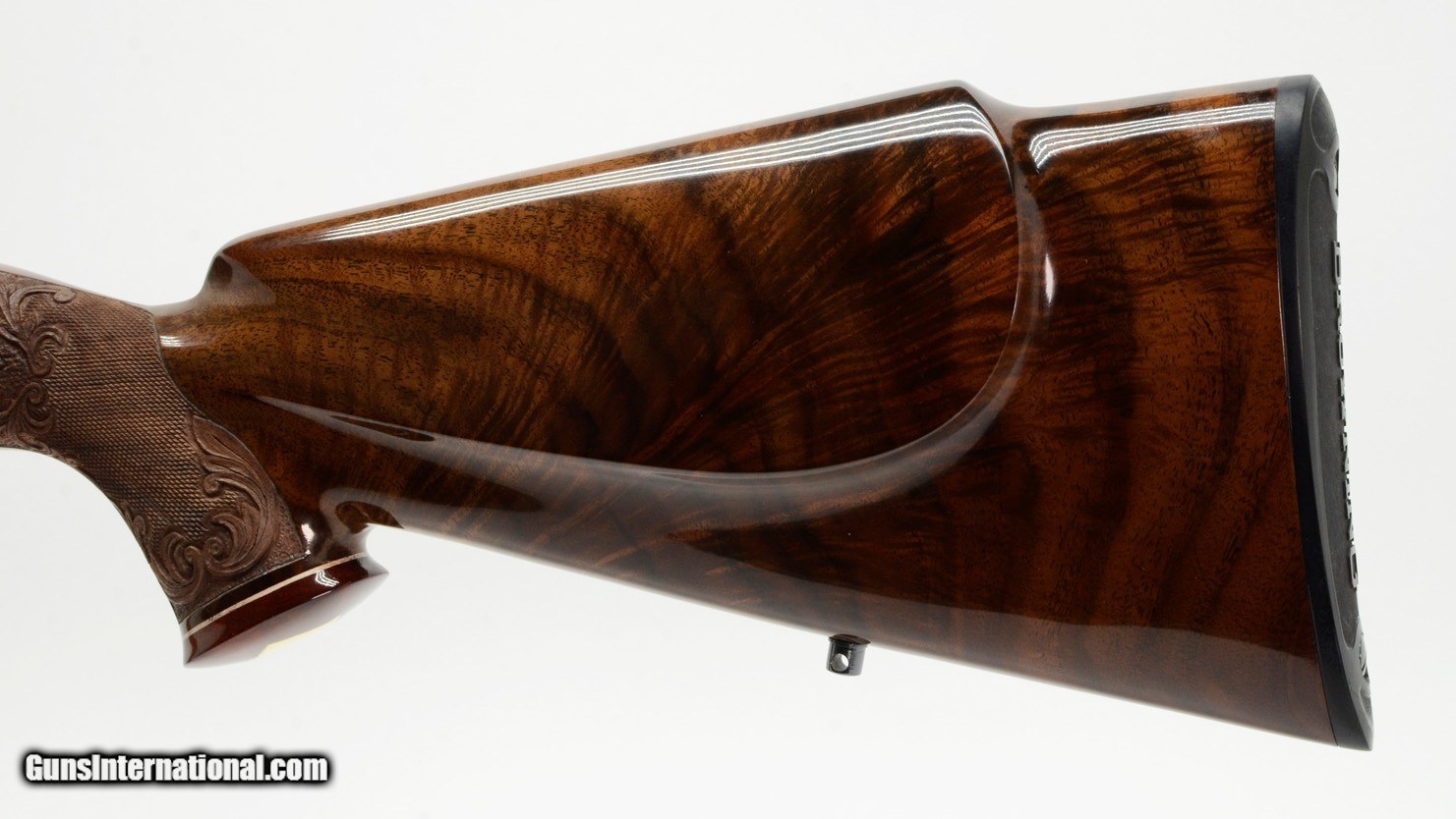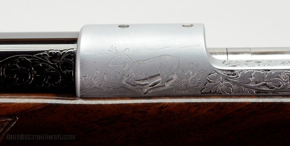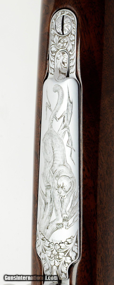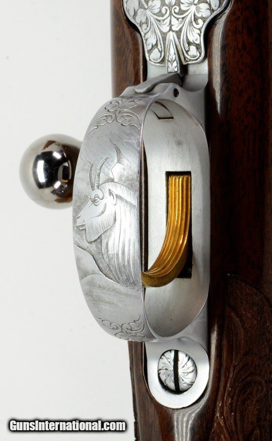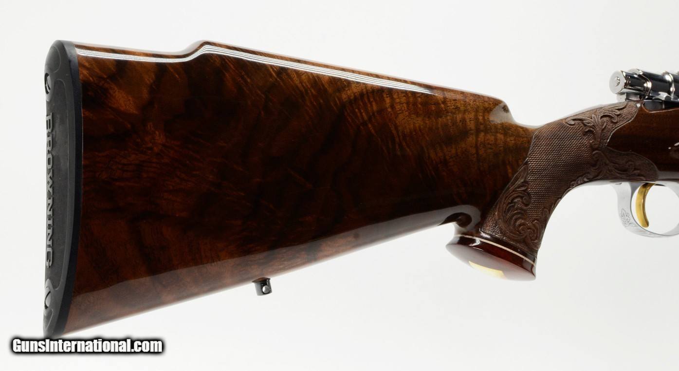 Description: Browning Belgium Olympian .243 Small Ring Mauser. Very Rare! Excellent Condition. DOM 1964 AVAILABLE FOR PURCHASE AT OUR ON-LINE STORE This Browning Belgium Olympian .243 Is In Excellent-Collector Condition. Features The Finest Figured Walnut Stock, Hand Checkered 32-Line Pattern. Hand Carved Scroll. Rosewood Grip Cap Fitted With 18-Carat Gold Medallion. Barrel Is Hand-Engraved Forward Of The Receiver And Magnificently Polished And Blued. Chrome Plated Receiver, Floor Plate And Trigger Guard In Satin Finish. Hand Engraved With Deer And Antelope On Receiver By LeGiers. Floor Plate Mountain Lion By R. Risack, Trigger Guard Mountain Goat Unsigned. Gold Plated Trigger. Jeweled Bolt.