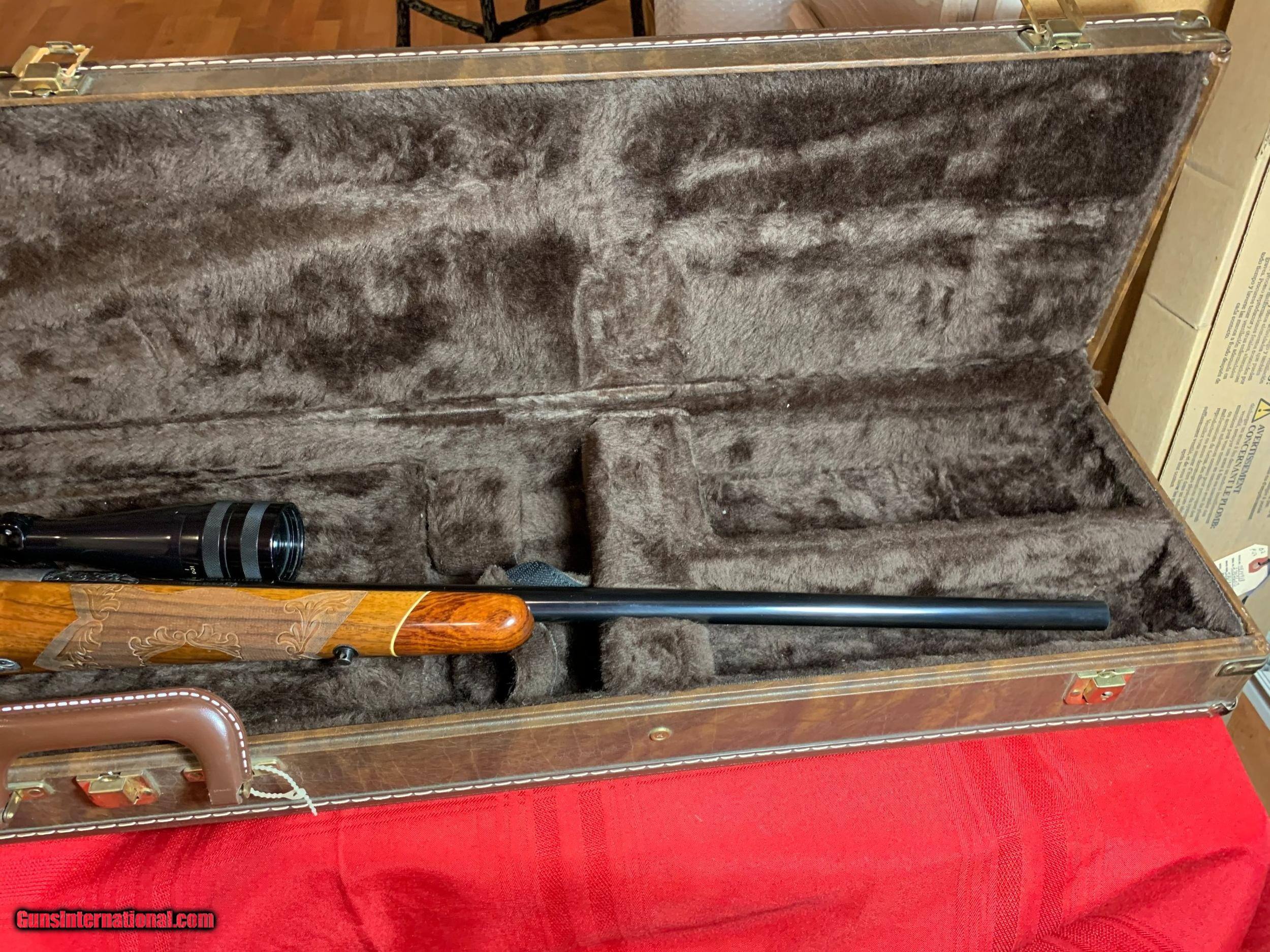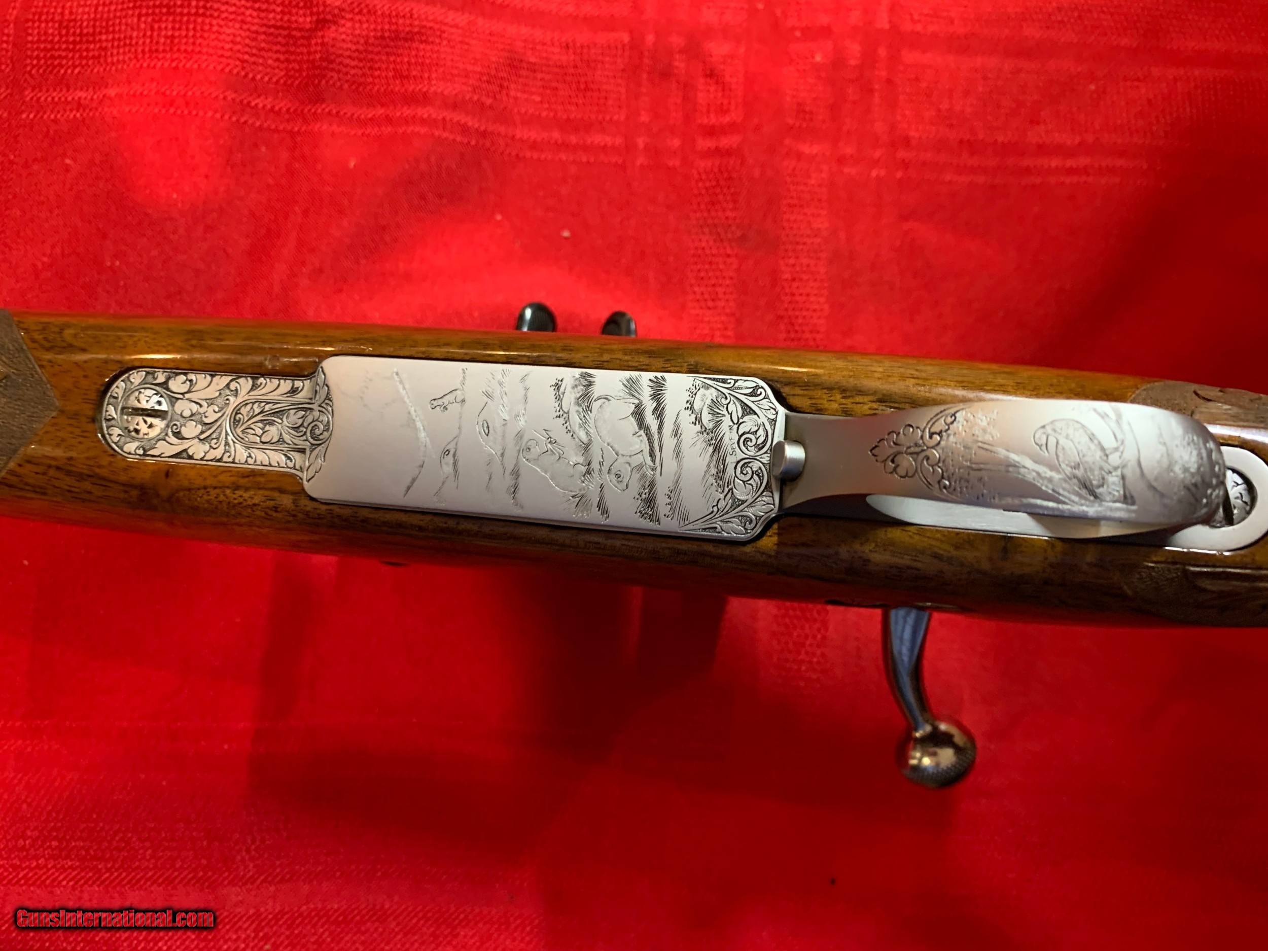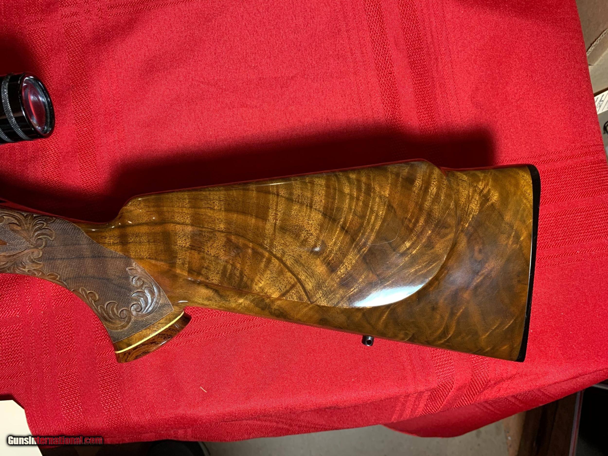 Description: Severin signed Browning Olympian 22-250 heavy barrel. Georgeous figured walnut stock with carving. Griffin and Howe side mount with Redfield 6X18 scope. Original butt plate. Browning hard case. 1962 DOM. Sako action. One small ding on left side of stock see pics. SOLD Curio/Relic: Yes |