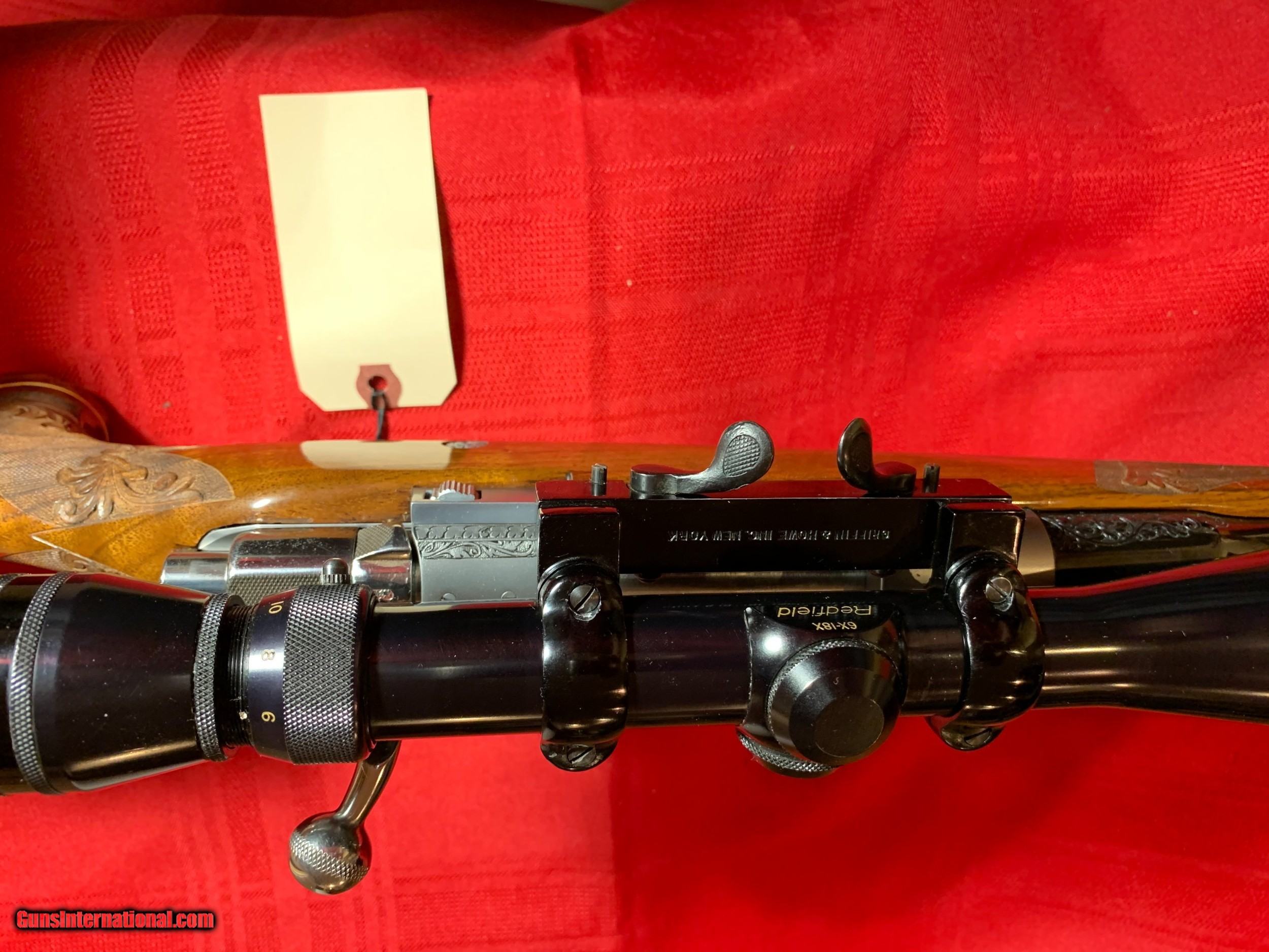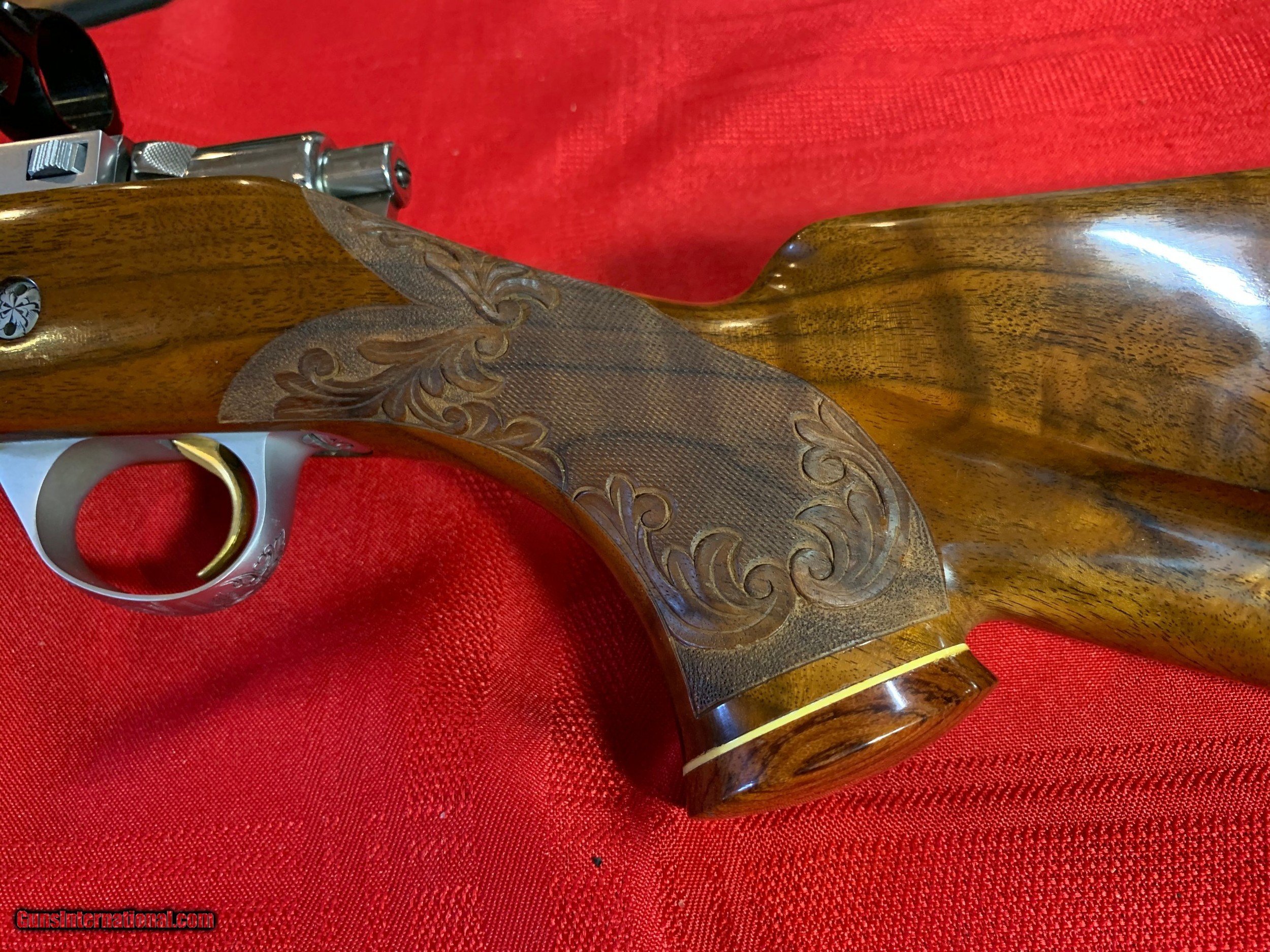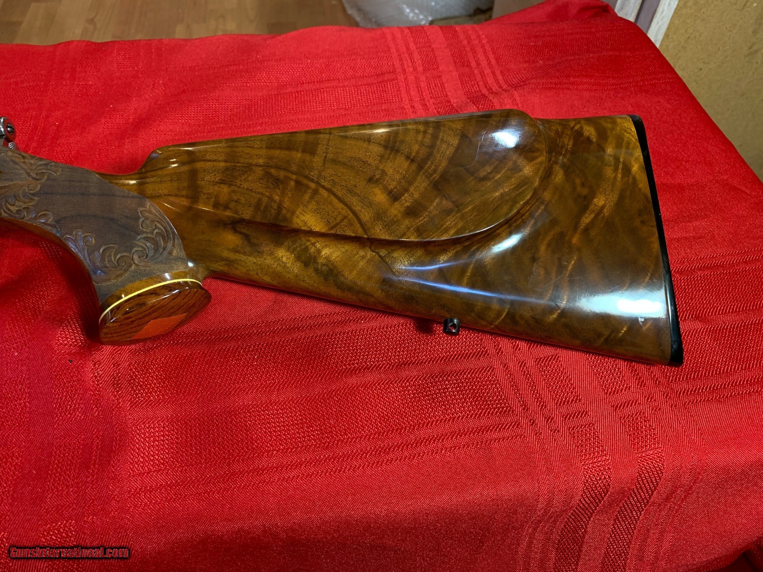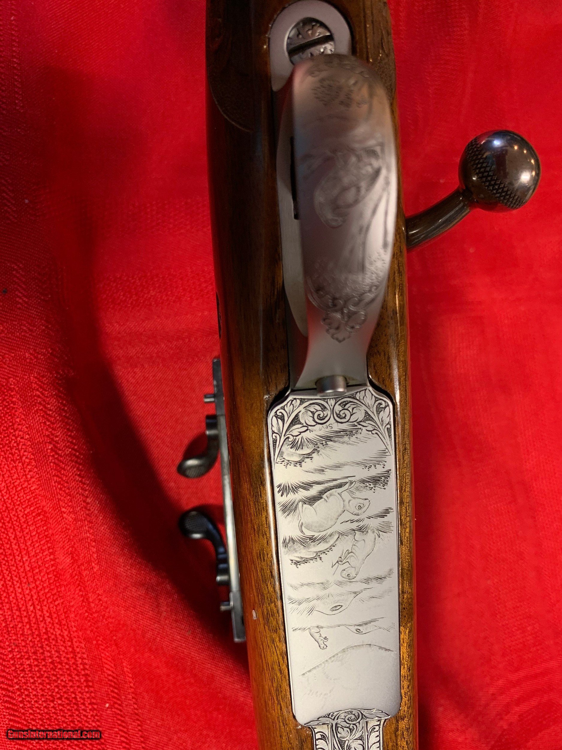 Description: Severin signed Browning Olympian 22-250 heavy barrel. Georgeous figured walnut stock with carving. Griffin and Howe side mount with Redfield 6X18 scope. Original butt plate. Browning hard case. 1962 DOM. Sako action. One small ding on left side of stock see pics. SOLD Curio/Relic: Yes |