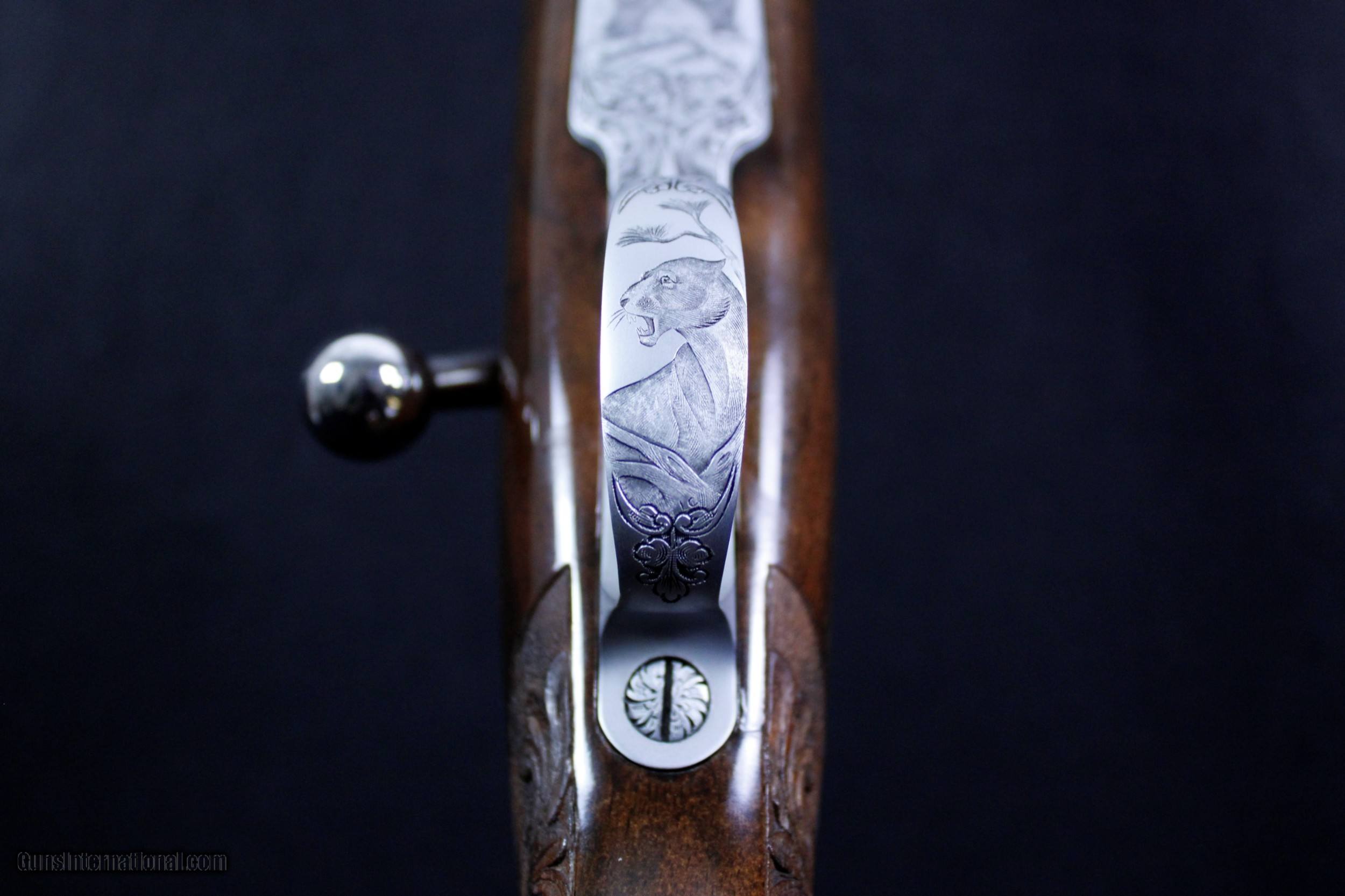 Description: Beautiful Browning Olympian chambered in 7 M/M Rem. Mag. with short action extractor. Manufactured in 1970, this rifle's craftsmanship is just breathtaking, featuring some of the finest walnut that was meticulously hand checkered and carved. These beautiful rifles were manufactured from 1964 through 1977. In 1970, this model was one of forty-six manufactured that year, and one of 251 made in the thirteen years of production.(An overall of 14.20% of Olympians were in this caliber) Game scenes were engraved by Master Engravers L. Severn, Lilly Cortis, and Angelo Bee. This rifle is in 98% condition and appears never to have been fired, making it a perfect addition to any collection and one that can be passed on for many generations to come. Dimensions are as follows: Barrel: 24", L.O.P. 13 1/2", Weight: 8lb. 12oz. On Sale!! Was $10,995 Now $8,799.95 SOLD |