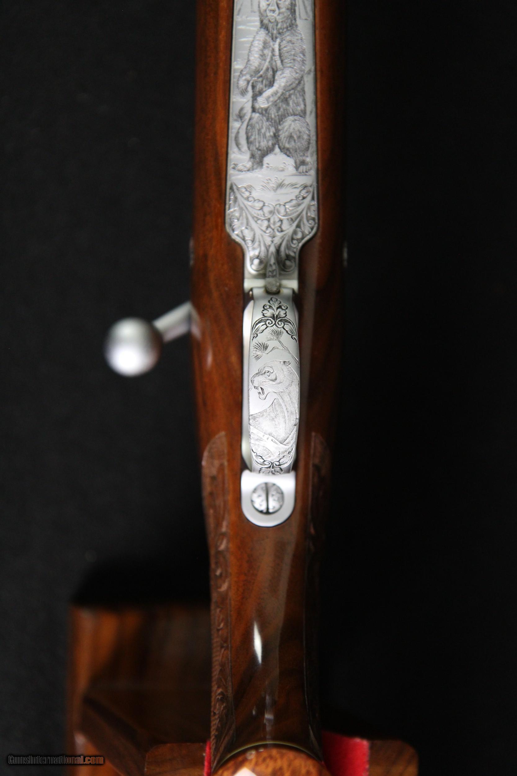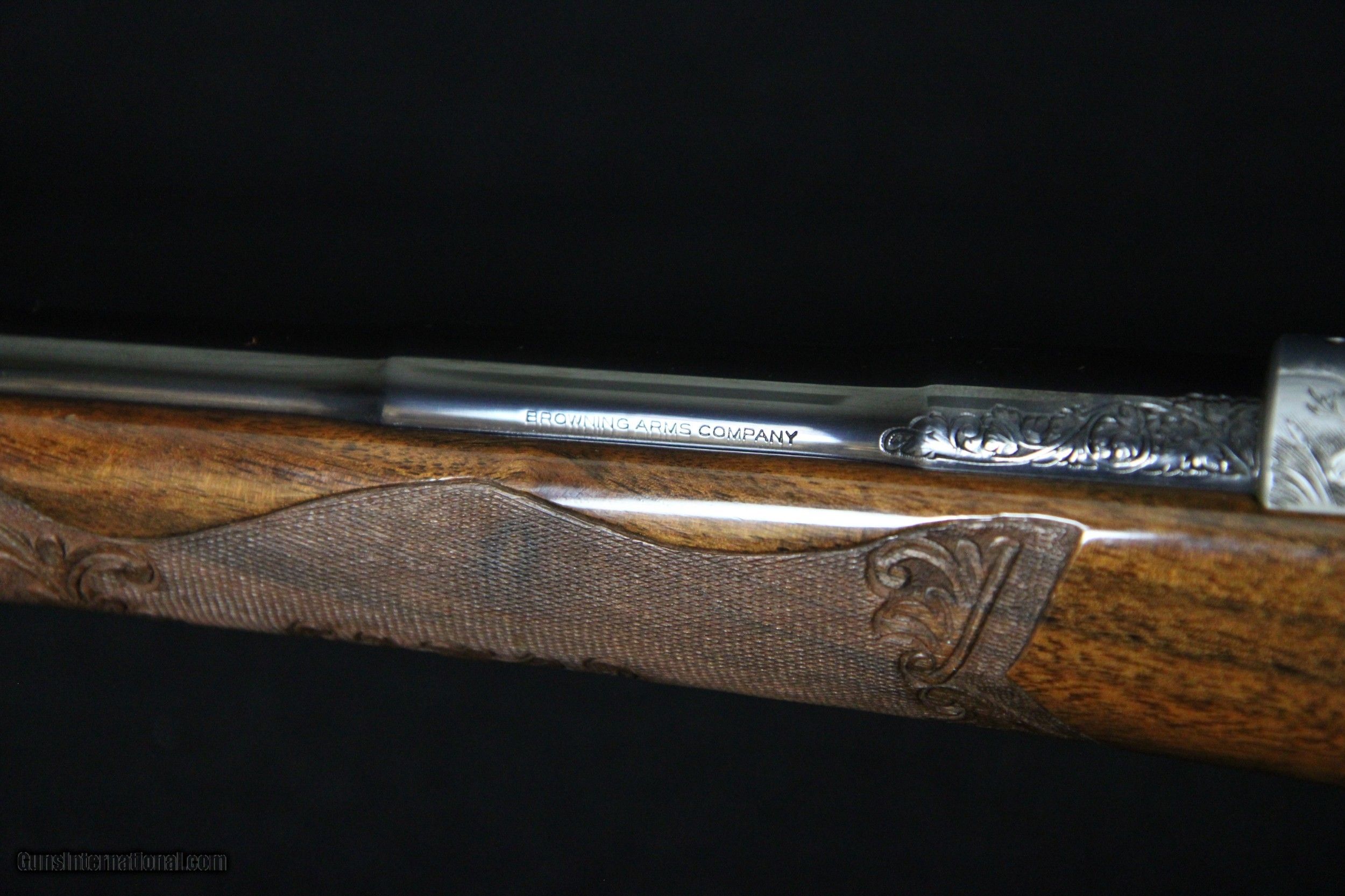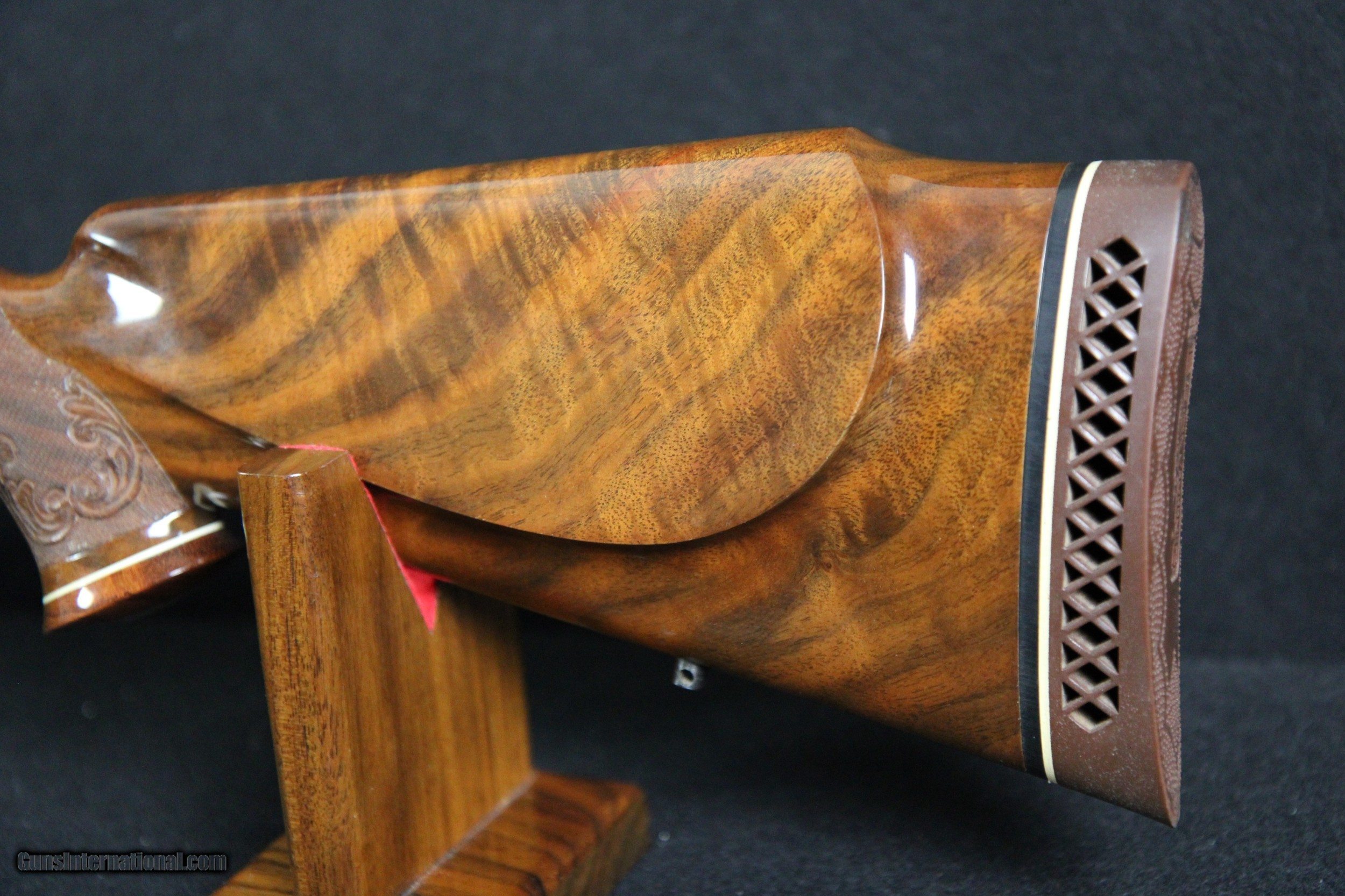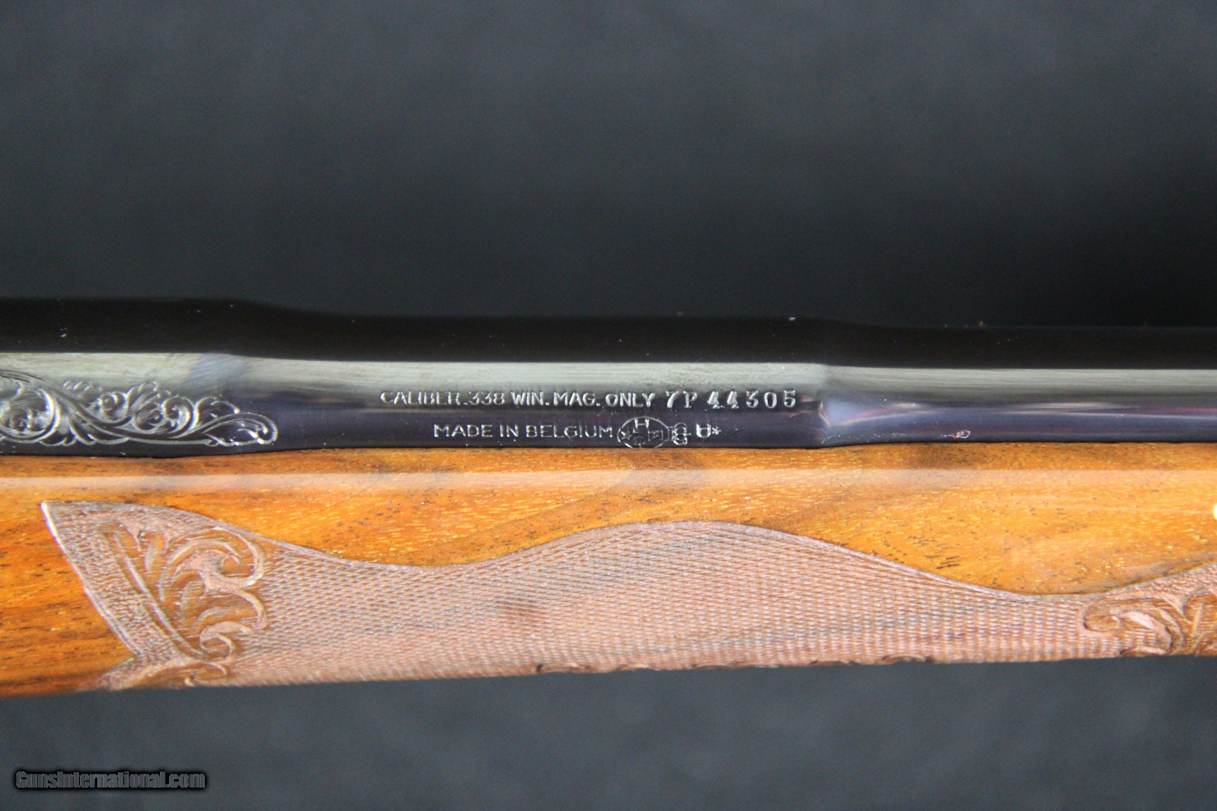 Description: A fabulous 1967 production Browning "Olympian" in the scarce .338 Win. Mag. caliber with desirable "Long Extractor" Fabrique Nationale "Mauser" action. The 24" barrel is without sights and has a pristine bore as the rifle appears to be unfired, bluing is 100%, the action, floorplate and trigger guard feature game scene vignettes and is "triple signed" by Greco, Dewil and Baerten. The walnut stock shows beautiful figure and color with intricate carving and checkering, a rosewood fore-end tip and pistol-grip cap ( complete with a gold diamond inlay ) the stock being finished with a length of pull of 13-1/2" by a Browning ventilated recoil pad. A very close to 100% condition "Olympian" in one of the least produced calibers, a really exceptional hard-to-come-by rifle befitting all the superlatives! With a Browning luggage case. $16,950.00 SOLD Rifle Caliber: .338 Winchester Magnum |