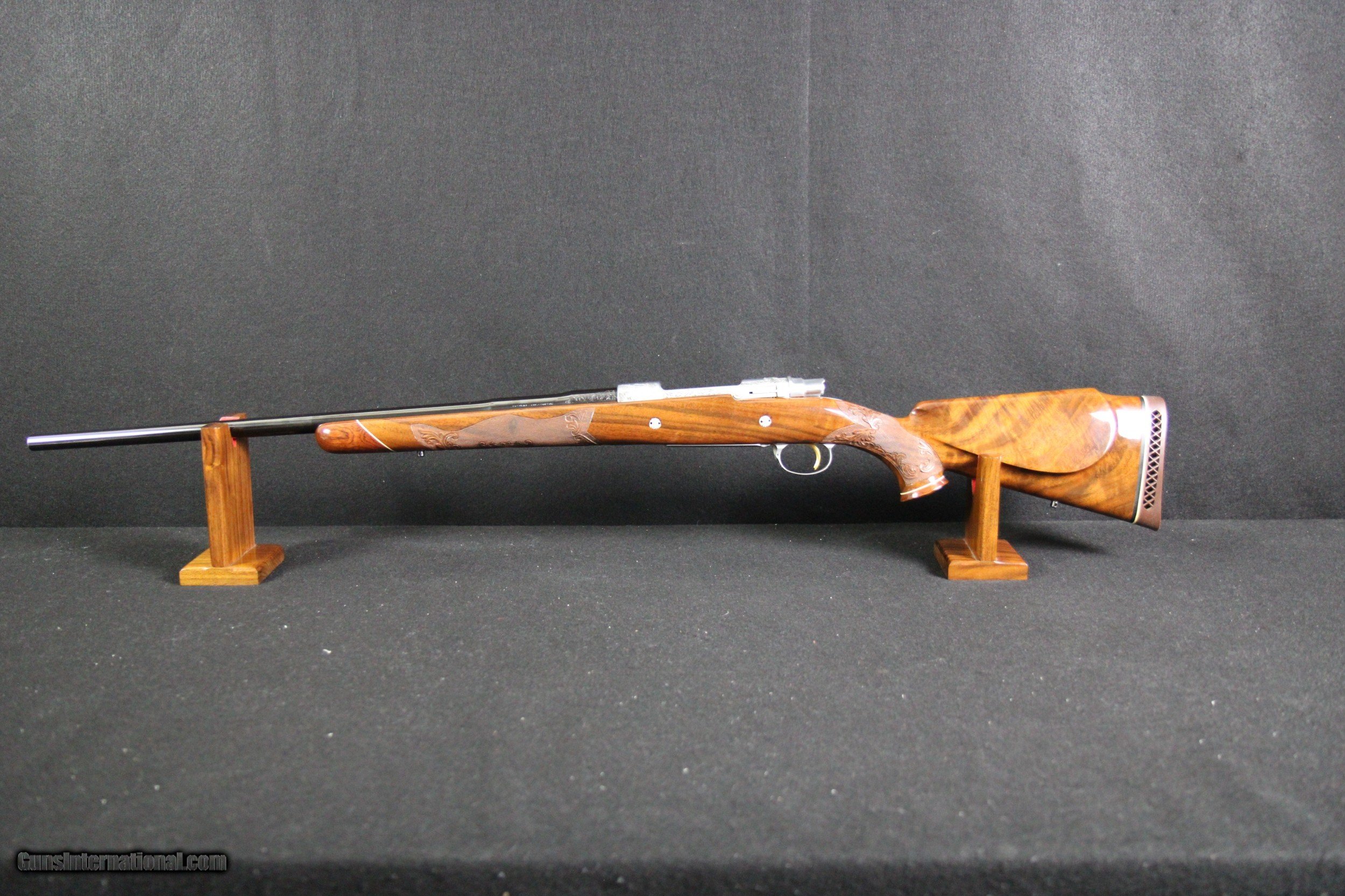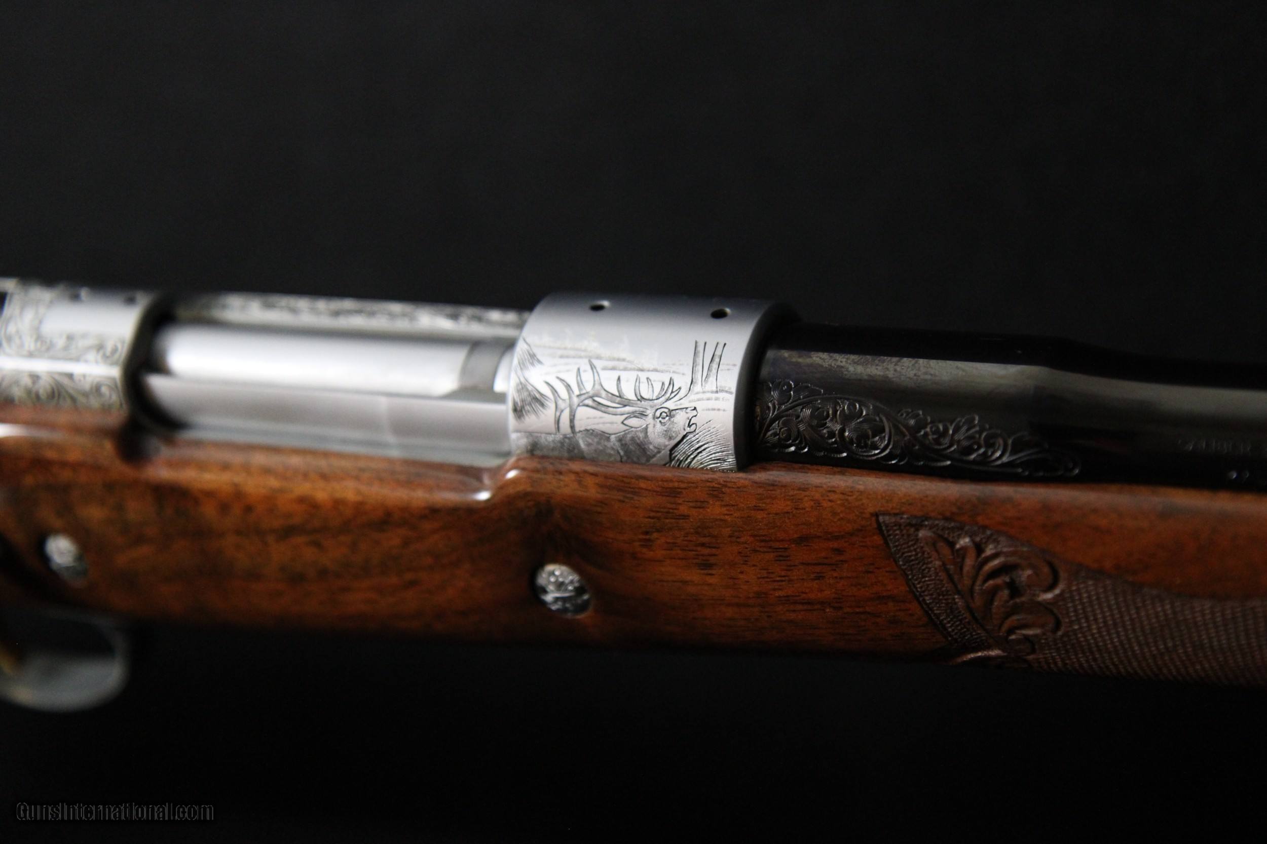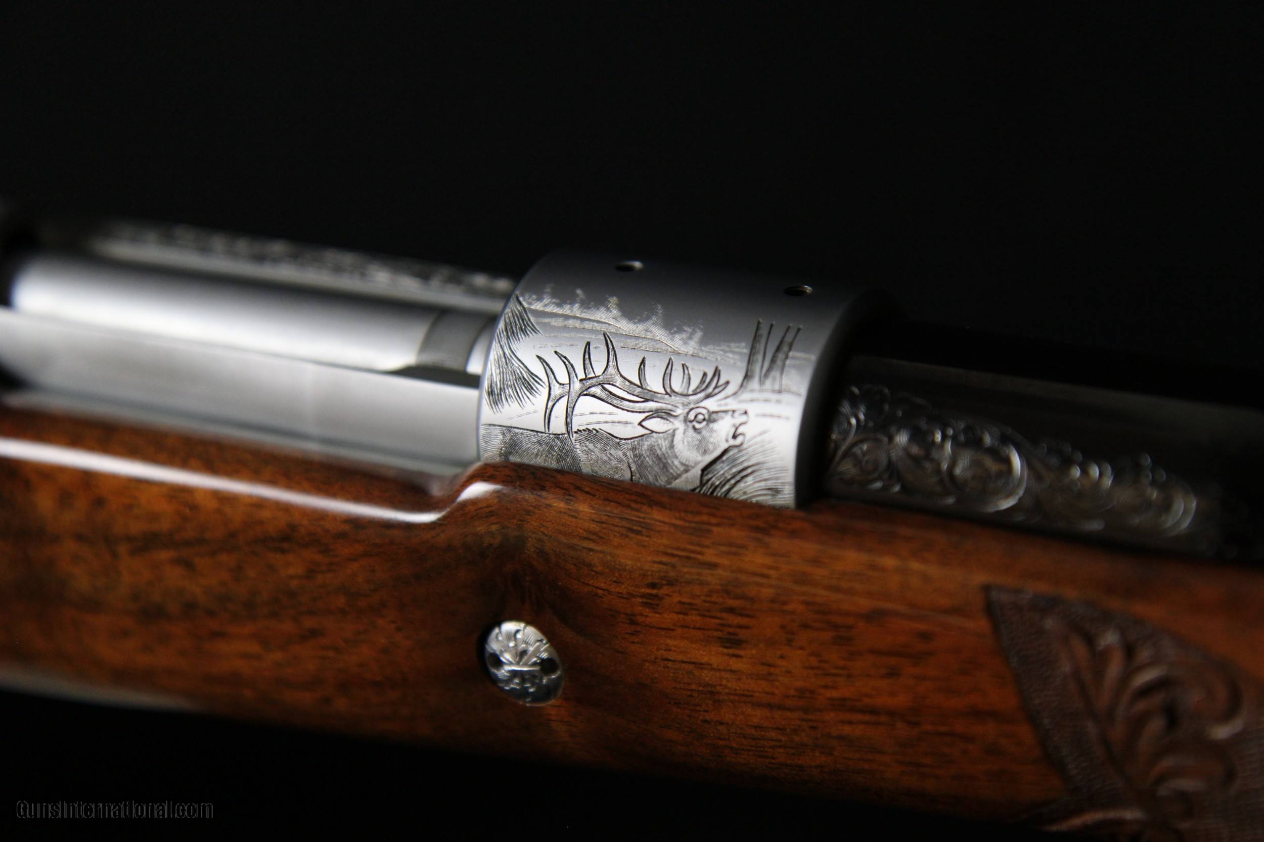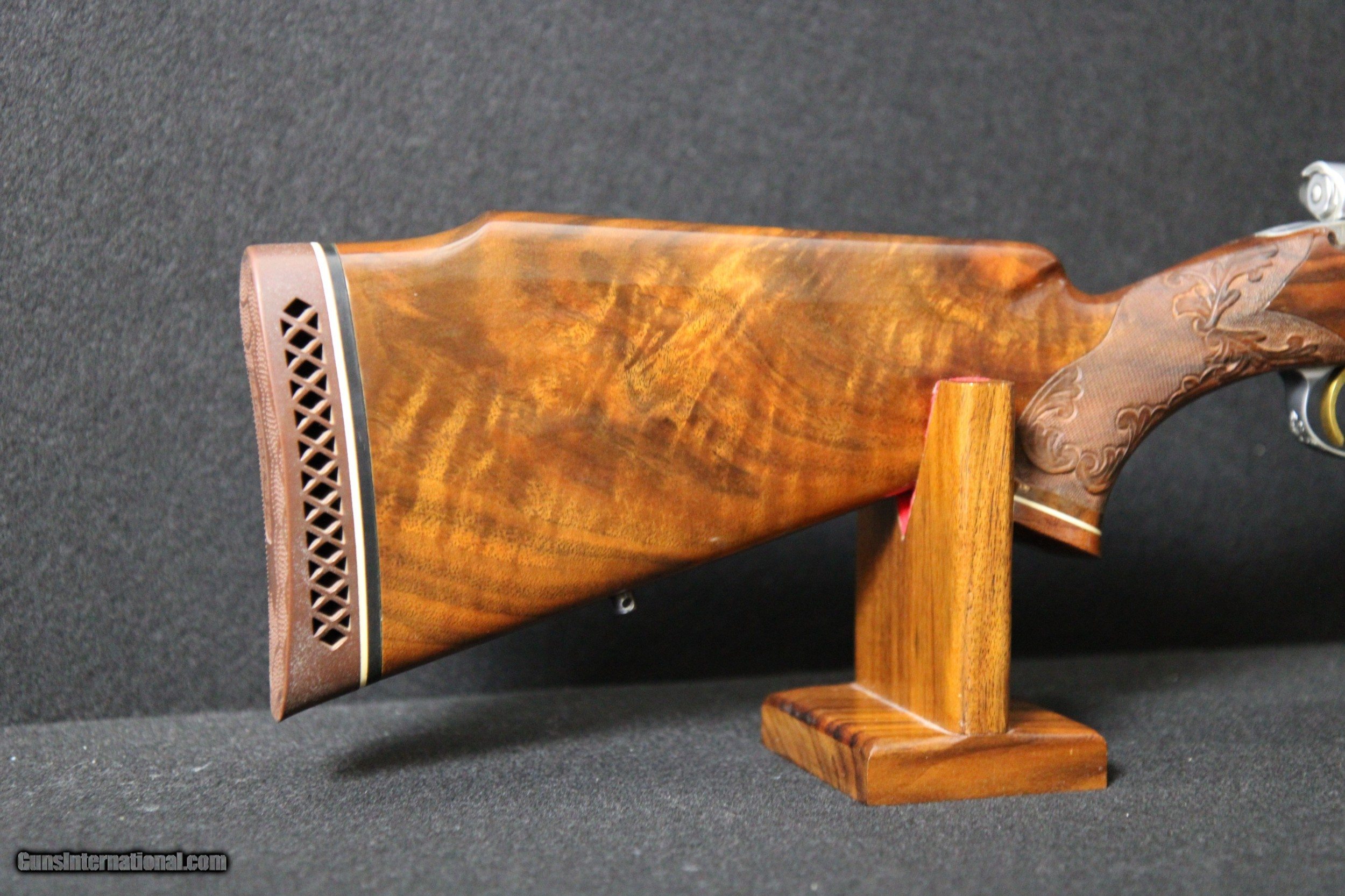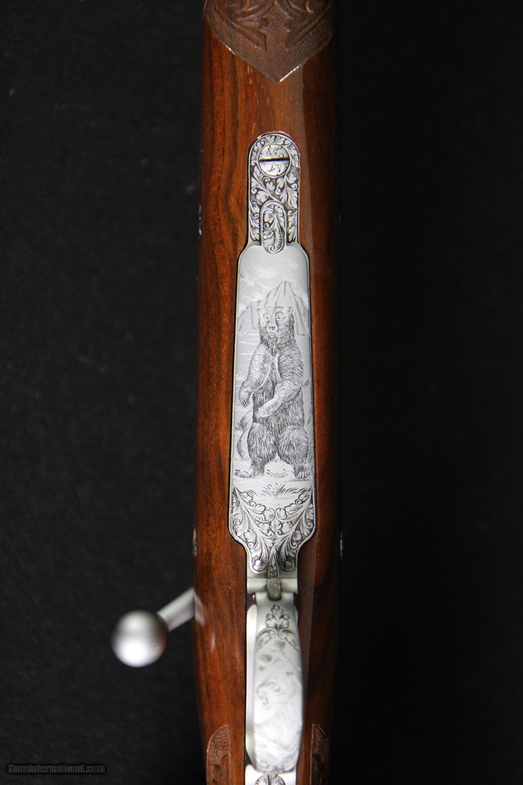 Description: A fabulous 1967 production Browning "Olympian" in the scarce .338 Win. Mag. caliber with desirable "Long Extractor" Fabrique Nationale "Mauser" action. The 24" barrel is without sights and has a pristine bore as the rifle appears to be unfired, bluing is 100%, the action, floorplate and trigger guard feature game scene vignettes and is "triple signed" by Greco, Dewil and Baerten. The walnut stock shows beautiful figure and color with intricate carving and checkering, a rosewood fore-end tip and pistol-grip cap ( complete with a gold diamond inlay ) the stock being finished with a length of pull of 13-1/2" by a Browning ventilated recoil pad. A very close to 100% condition "Olympian" in one of the least produced calibers, a really exceptional hard-to-come-by rifle befitting all the superlatives! With a Browning luggage case. $16,950.00 SOLD Rifle Caliber: .338 Winchester Magnum |