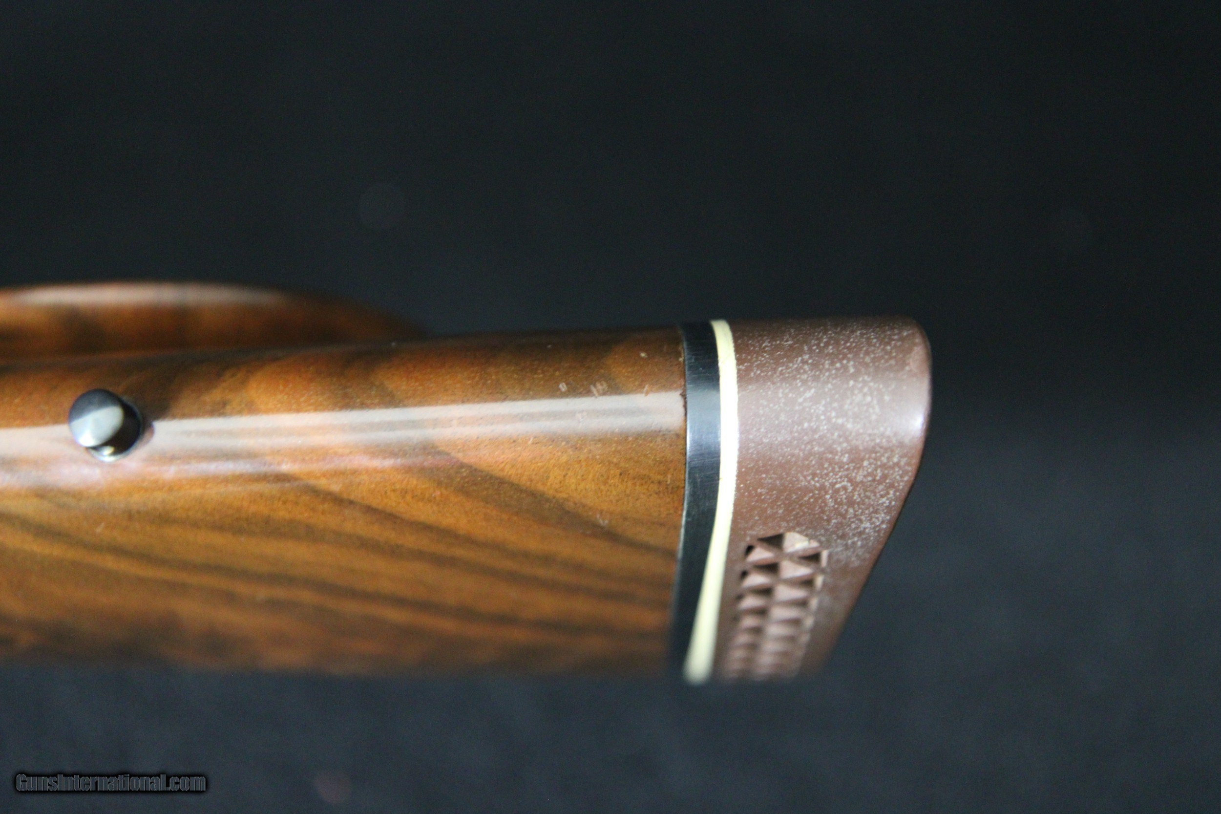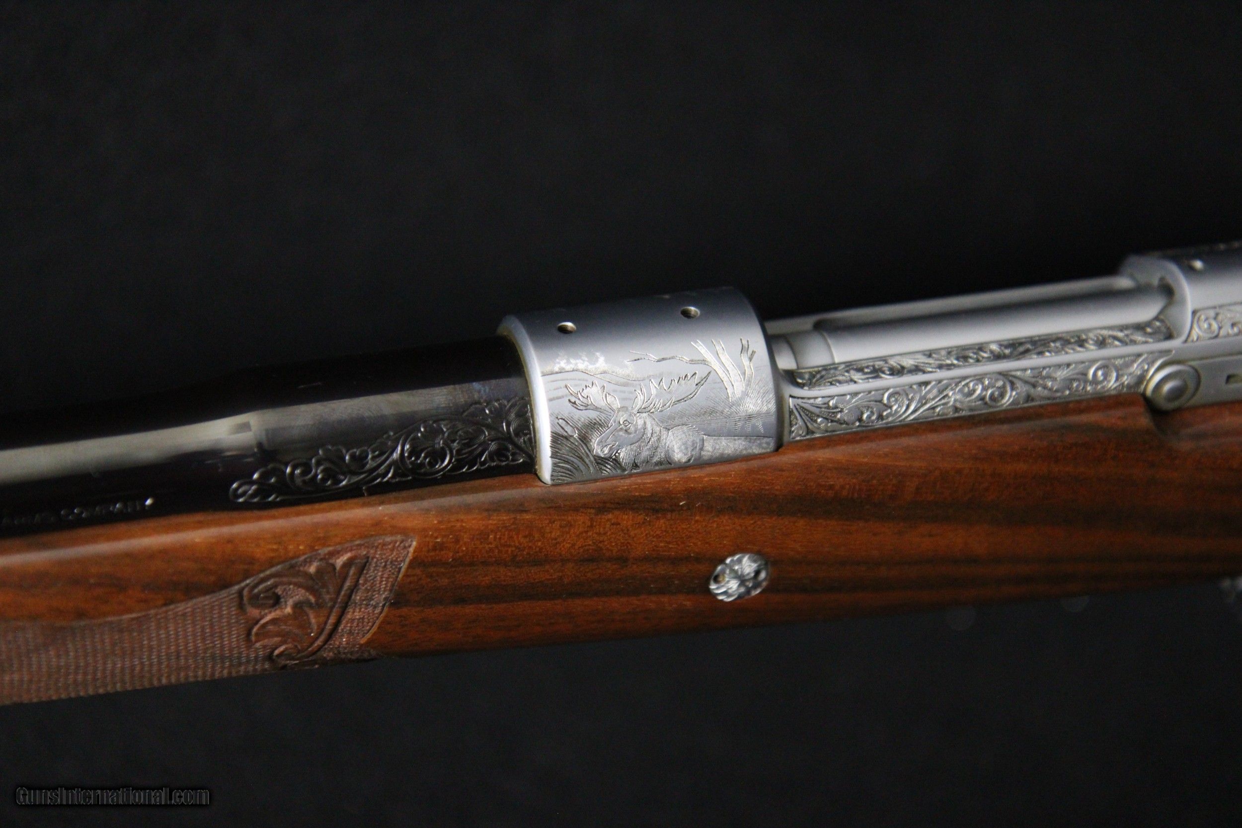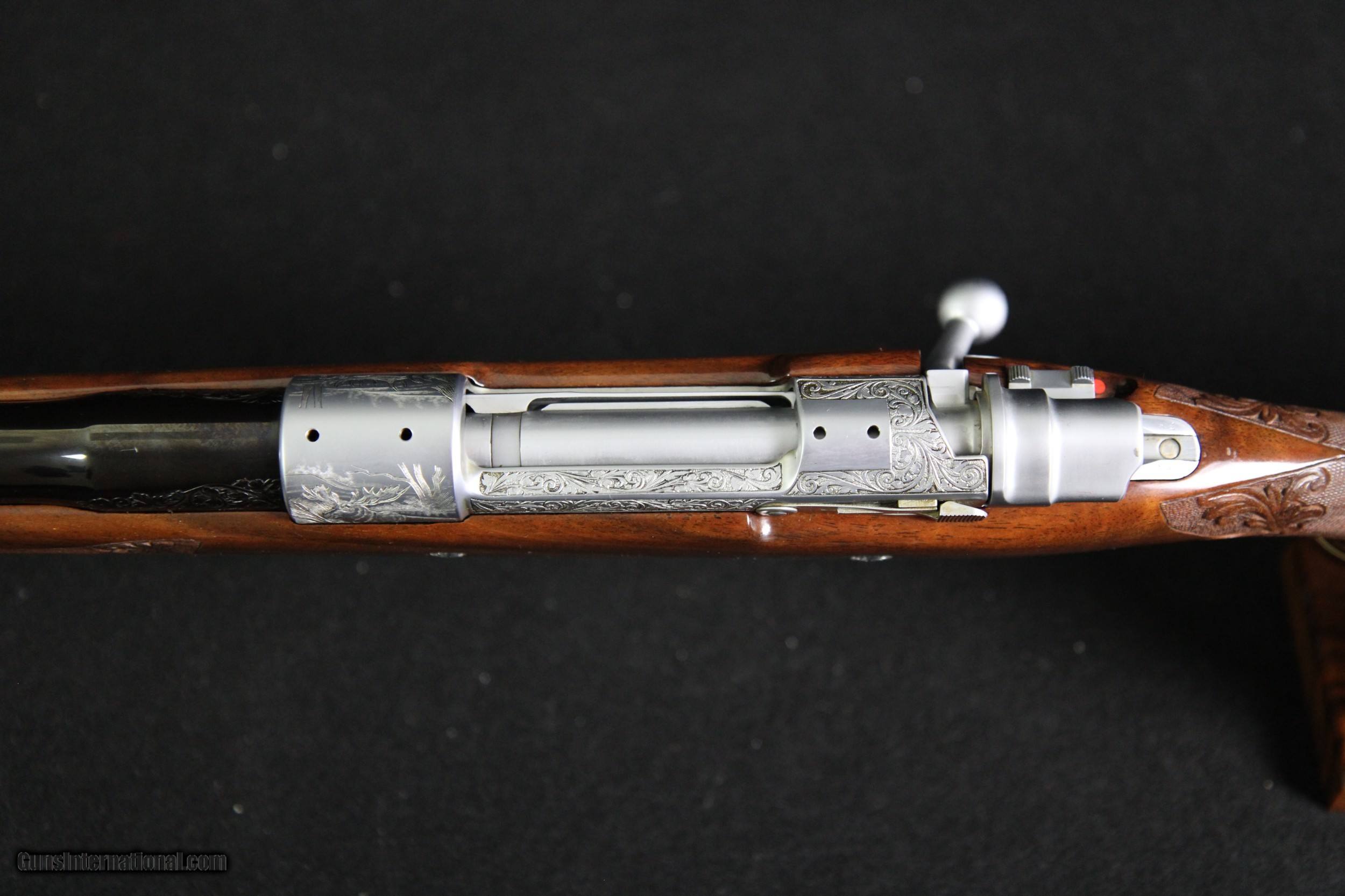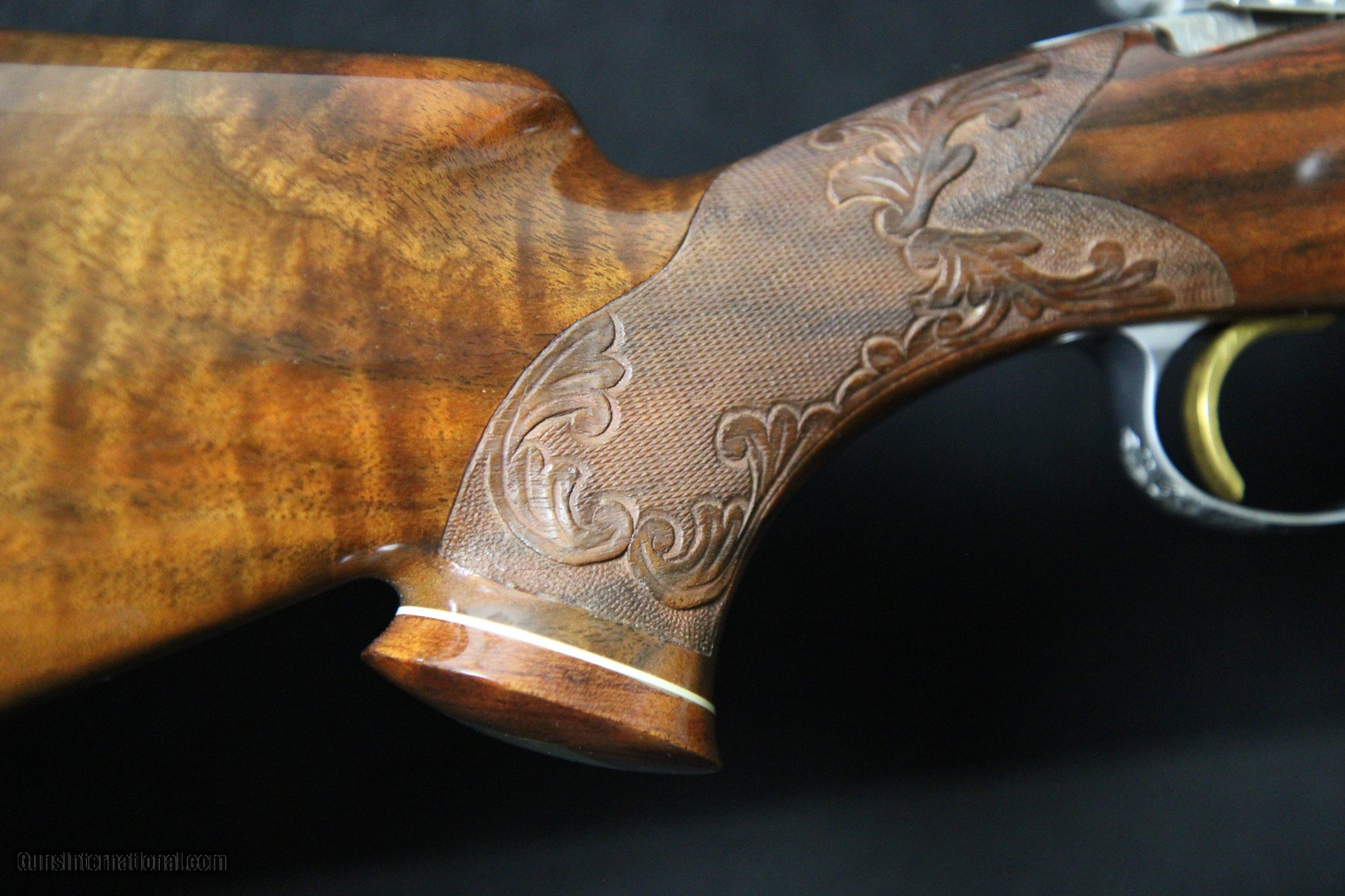Description: A fabulous 1967 production Browning "Olympian" in the scarce .338 Win. Mag. caliber with desirable "Long Extractor" Fabrique Nationale "Mauser" action. The 24" barrel is without sights and has a pristine bore as the rifle appears to be unfired, bluing is 100%, the action, floorplate and trigger guard feature game scene vignettes and is "triple signed" by Greco, Dewil and Baerten. The walnut stock shows beautiful figure and color with intricate carving and checkering, a rosewood fore-end tip and pistol-grip cap ( complete with a gold diamond inlay ) the stock being finished with a length of pull of 13-1/2" by a Browning ventilated recoil pad. A very close to 100% condition "Olympian" in one of the least produced calibers, a really exceptional hard-to-come-by rifle befitting all the superlatives! With a Browning luggage case. $16,950.00 SOLD Rifle Caliber: .338 Winchester Magnum |