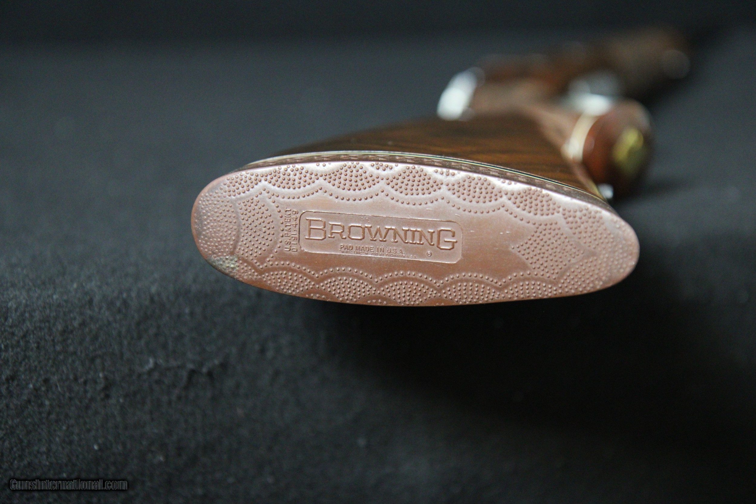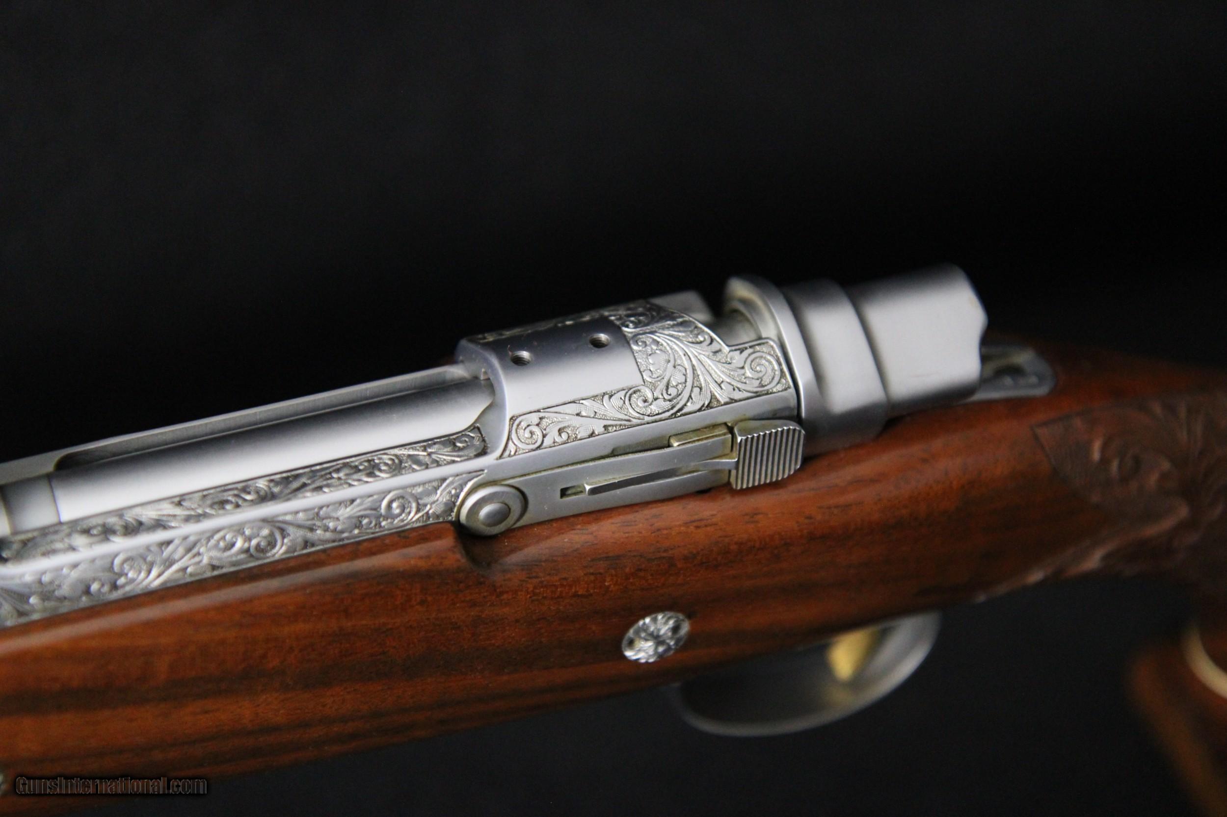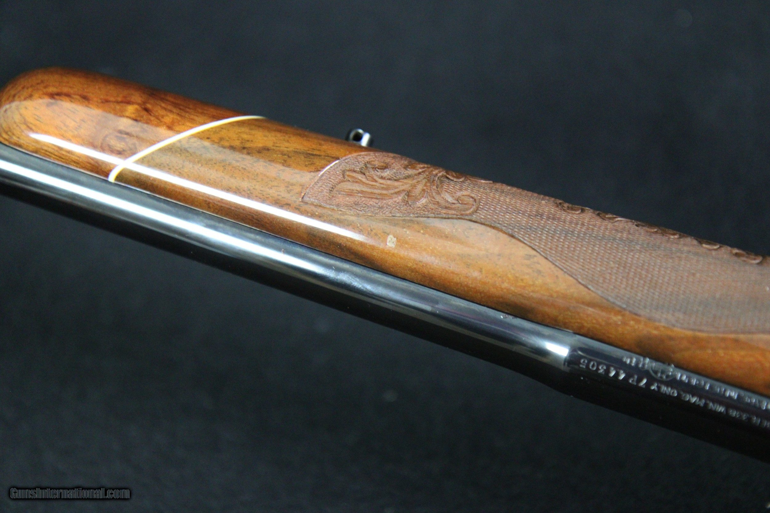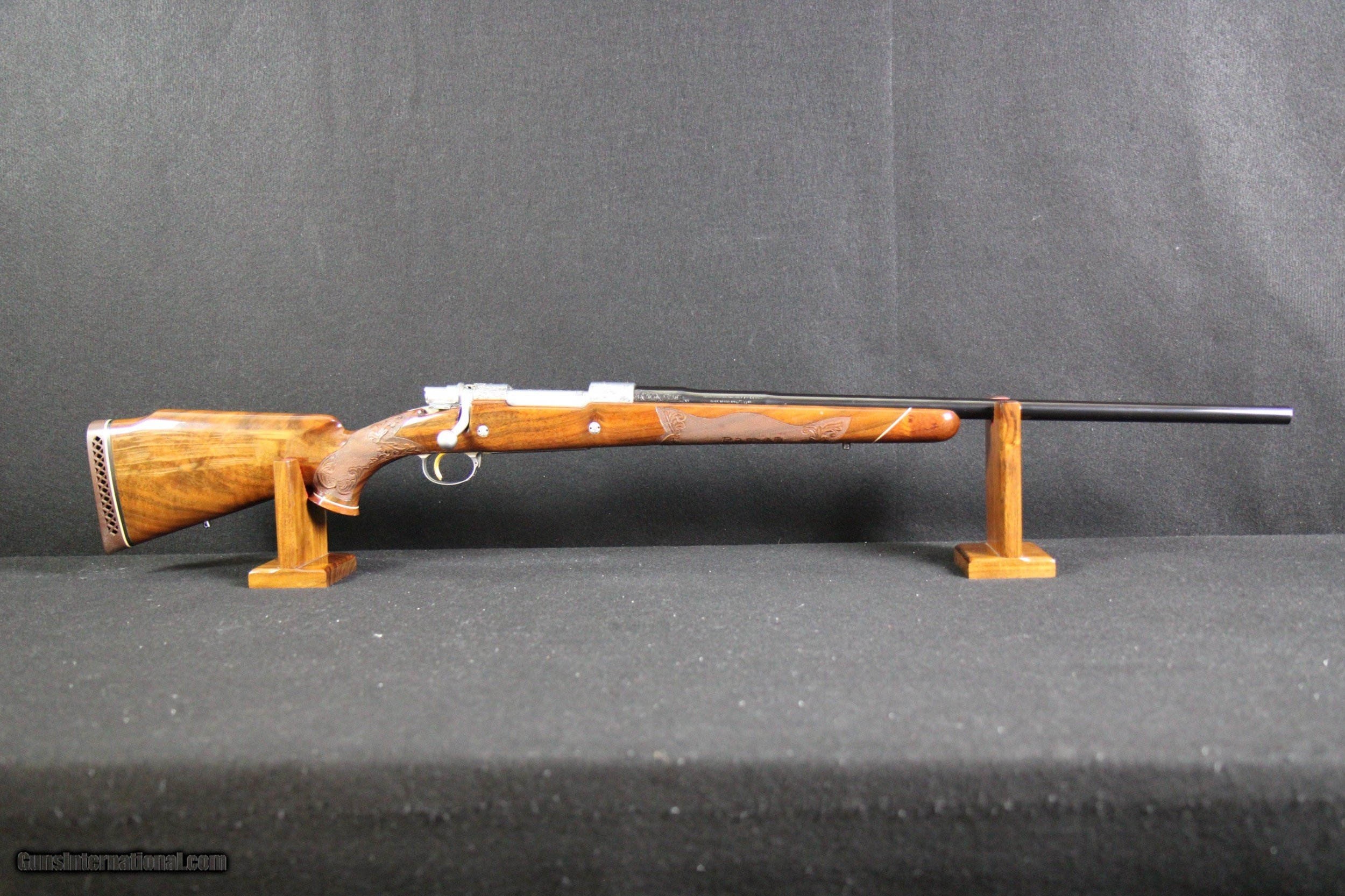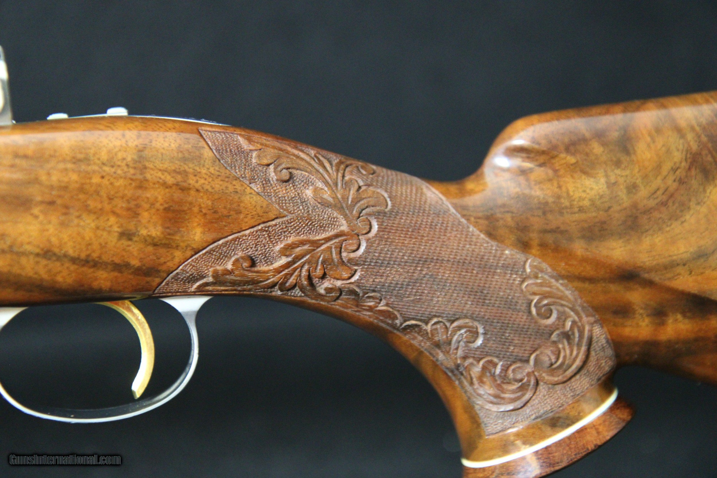 Description: A fabulous 1967 production Browning "Olympian" in the scarce .338 Win. Mag. caliber with desirable "Long Extractor" Fabrique Nationale "Mauser" action. The 24" barrel is without sights and has a pristine bore as the rifle appears to be unfired, bluing is 100%, the action, floorplate and trigger guard feature game scene vignettes and is "triple signed" by Greco, Dewil and Baerten. The walnut stock shows beautiful figure and color with intricate carving and checkering, a rosewood fore-end tip and pistol-grip cap ( complete with a gold diamond inlay ) the stock being finished with a length of pull of 13-1/2" by a Browning ventilated recoil pad. A very close to 100% condition "Olympian" in one of the least produced calibers, a really exceptional hard-to-come-by rifle befitting all the superlatives! With a Browning luggage case. $16,950.00 SOLD Rifle Caliber: .338 Winchester Magnum |