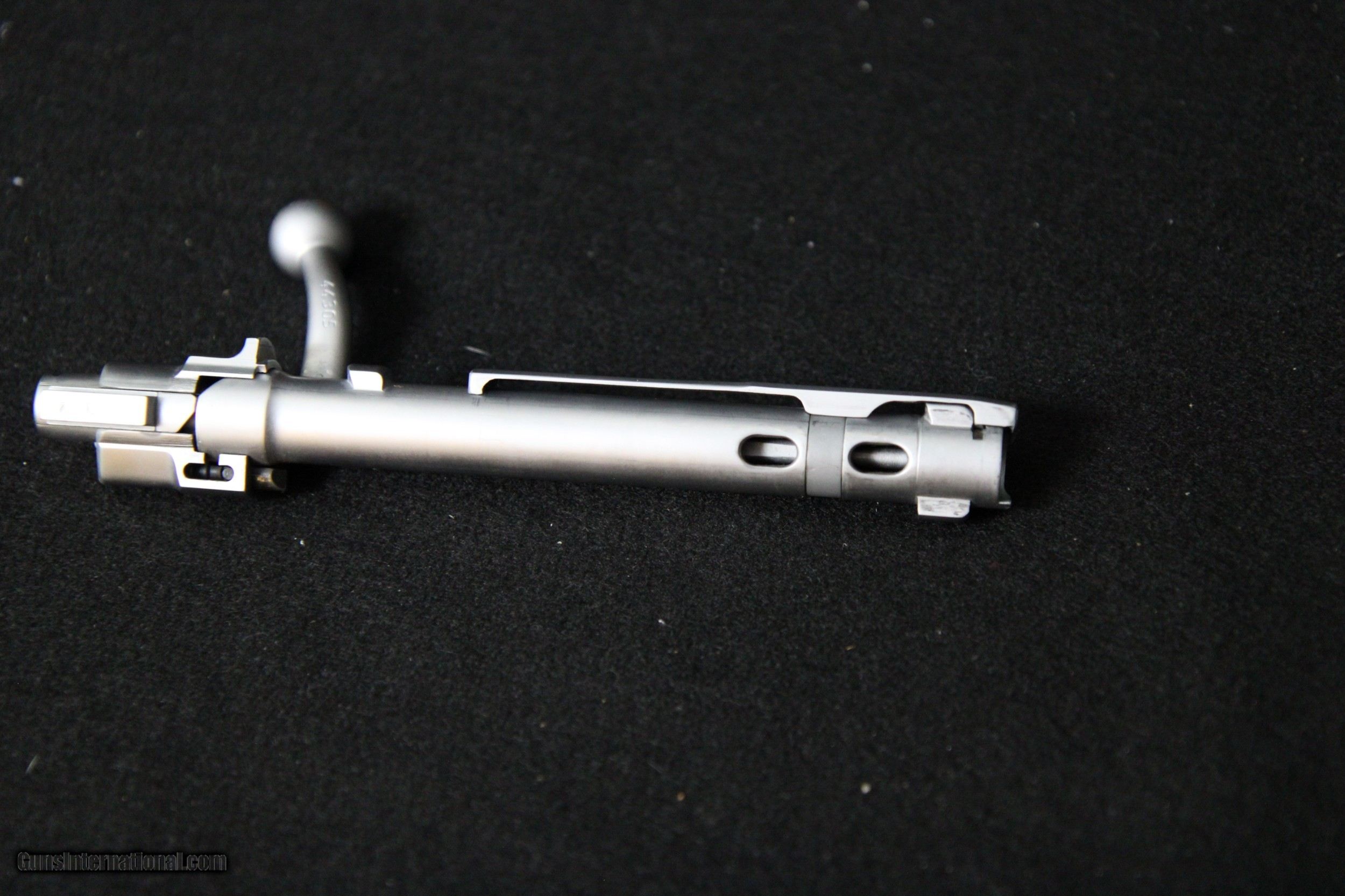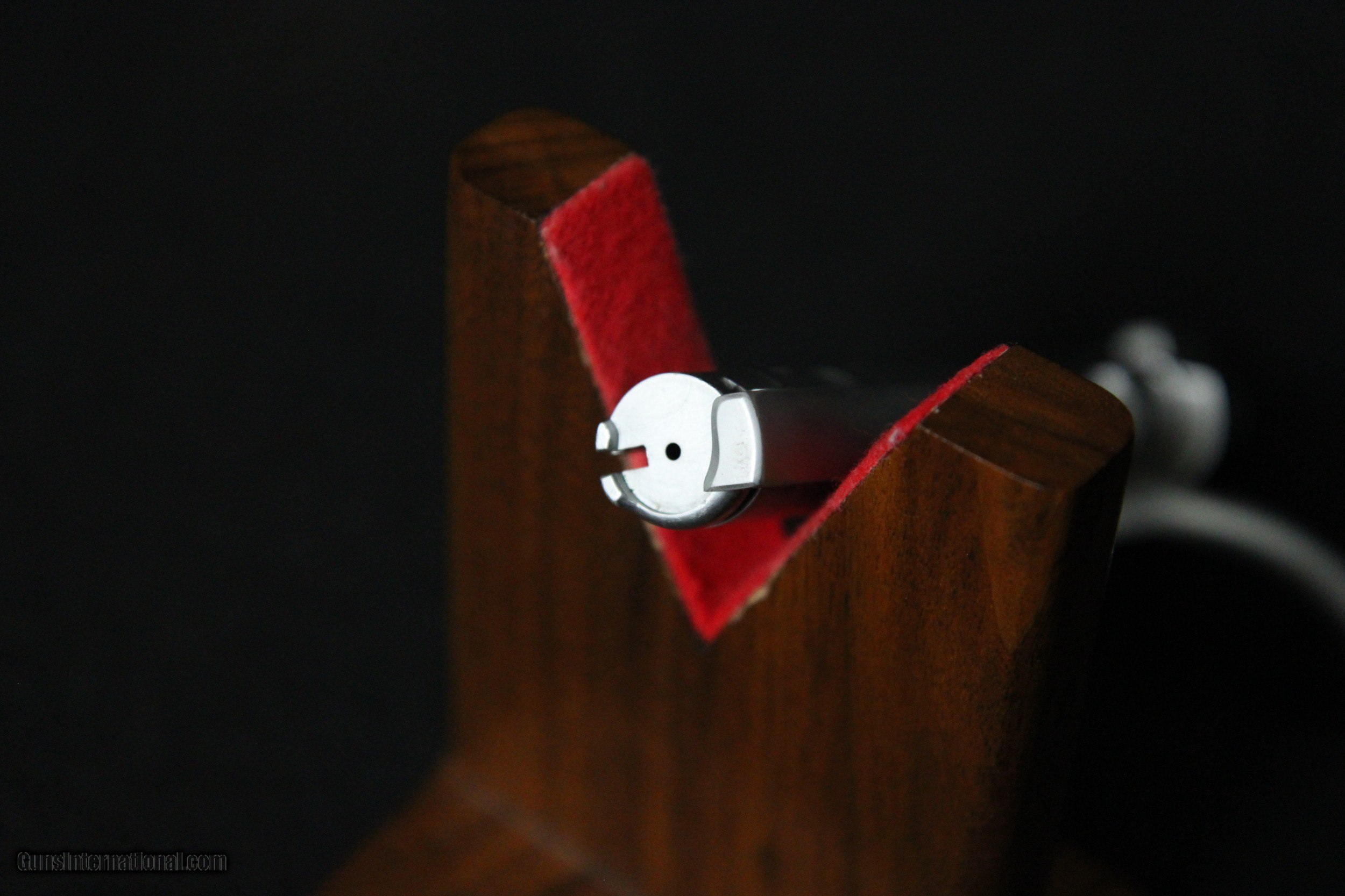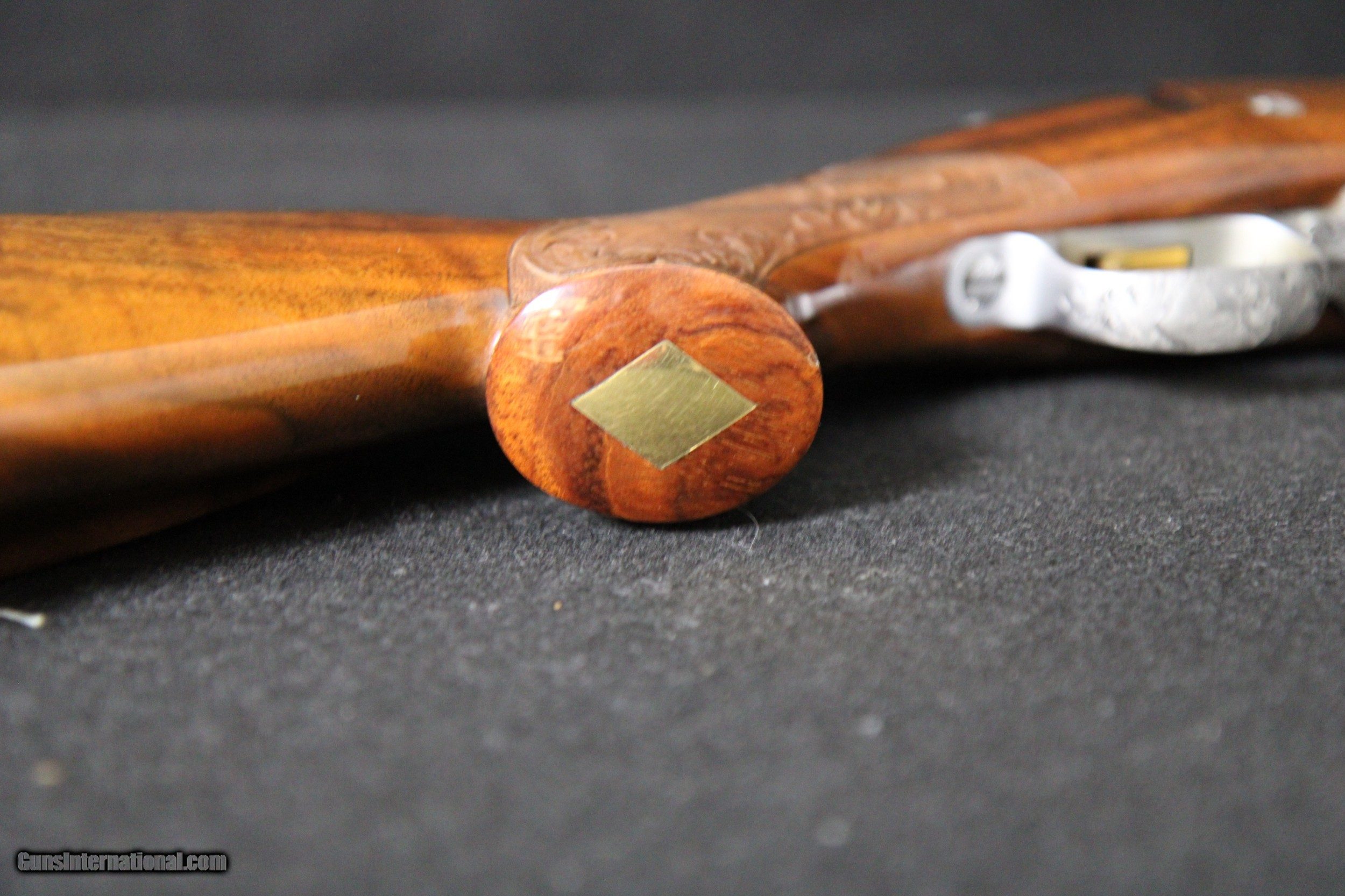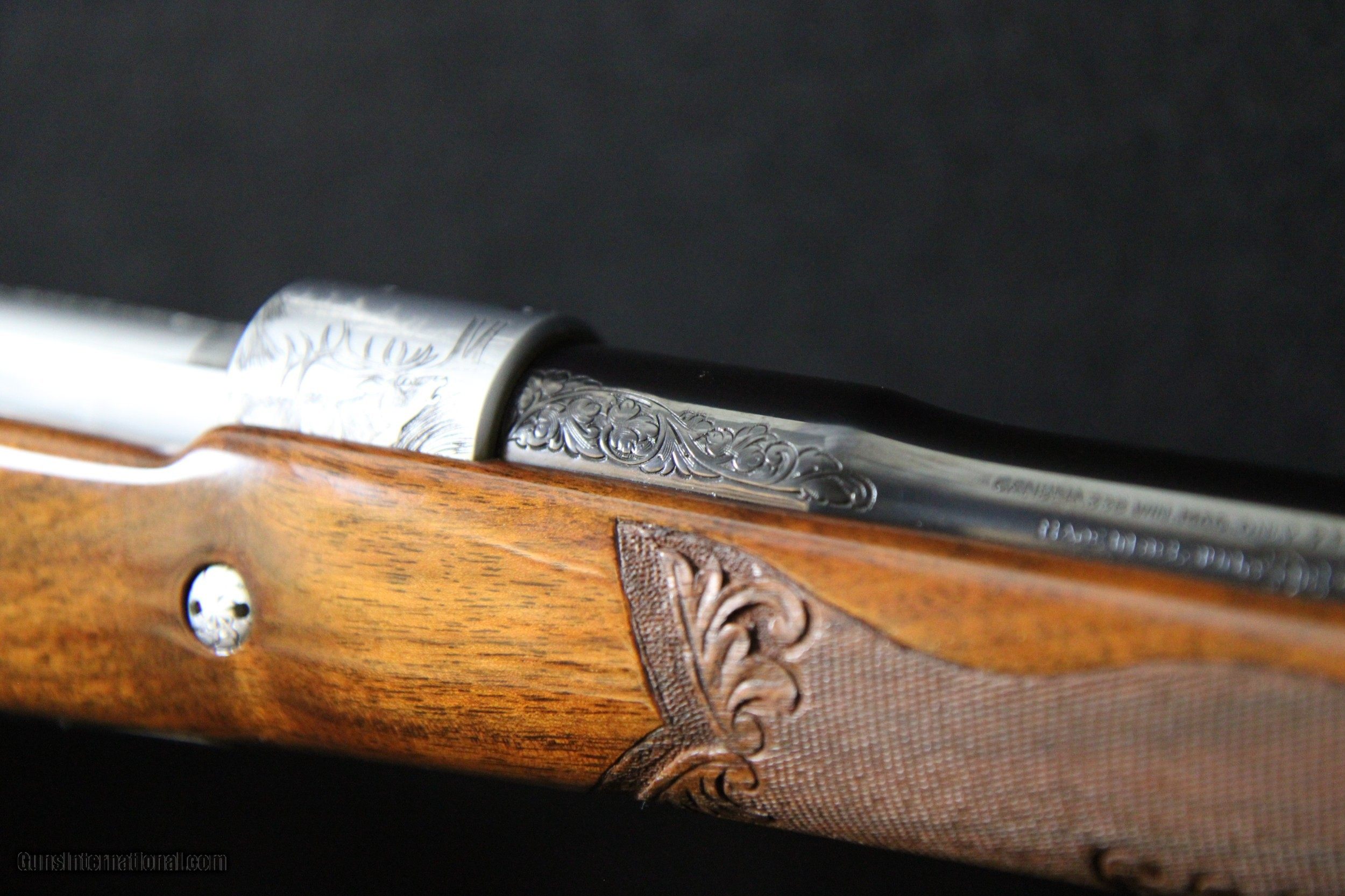 Description: A fabulous 1967 production Browning "Olympian" in the scarce .338 Win. Mag. caliber with desirable "Long Extractor" Fabrique Nationale "Mauser" action. The 24" barrel is without sights and has a pristine bore as the rifle appears to be unfired, bluing is 100%, the action, floorplate and trigger guard feature game scene vignettes and is "triple signed" by Greco, Dewil and Baerten. The walnut stock shows beautiful figure and color with intricate carving and checkering, a rosewood fore-end tip and pistol-grip cap ( complete with a gold diamond inlay ) the stock being finished with a length of pull of 13-1/2" by a Browning ventilated recoil pad. A very close to 100% condition "Olympian" in one of the least produced calibers, a really exceptional hard-to-come-by rifle befitting all the superlatives! With a Browning luggage case. $16,950.00 SOLD Rifle Caliber: .338 Winchester Magnum |