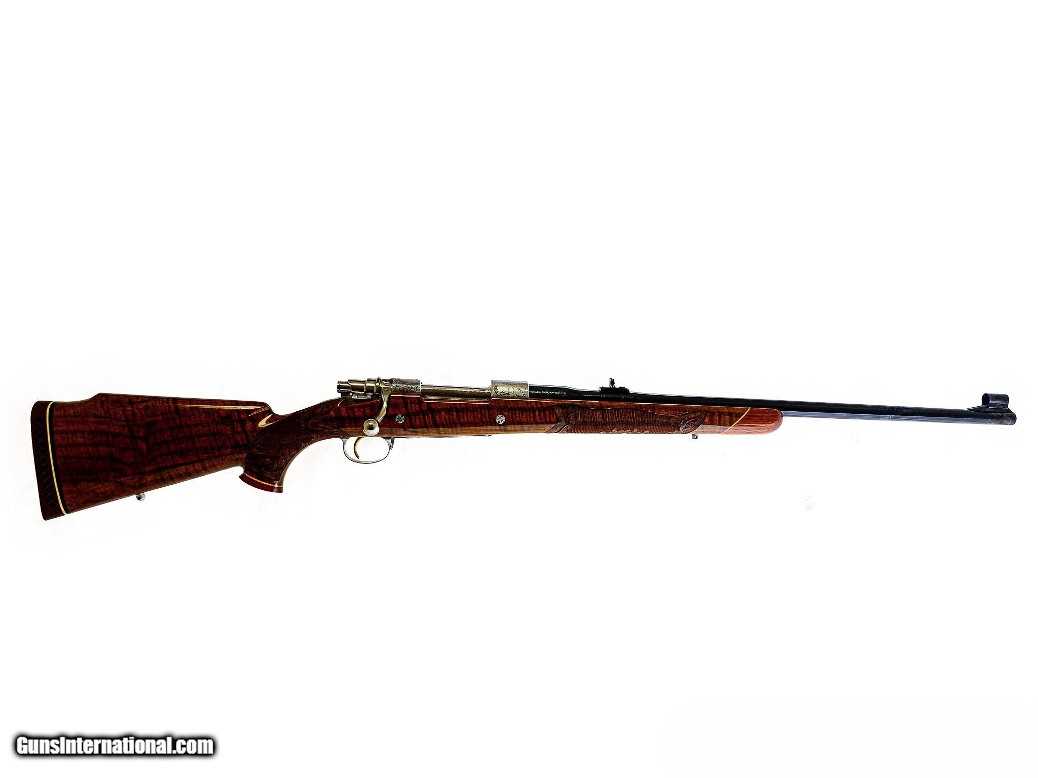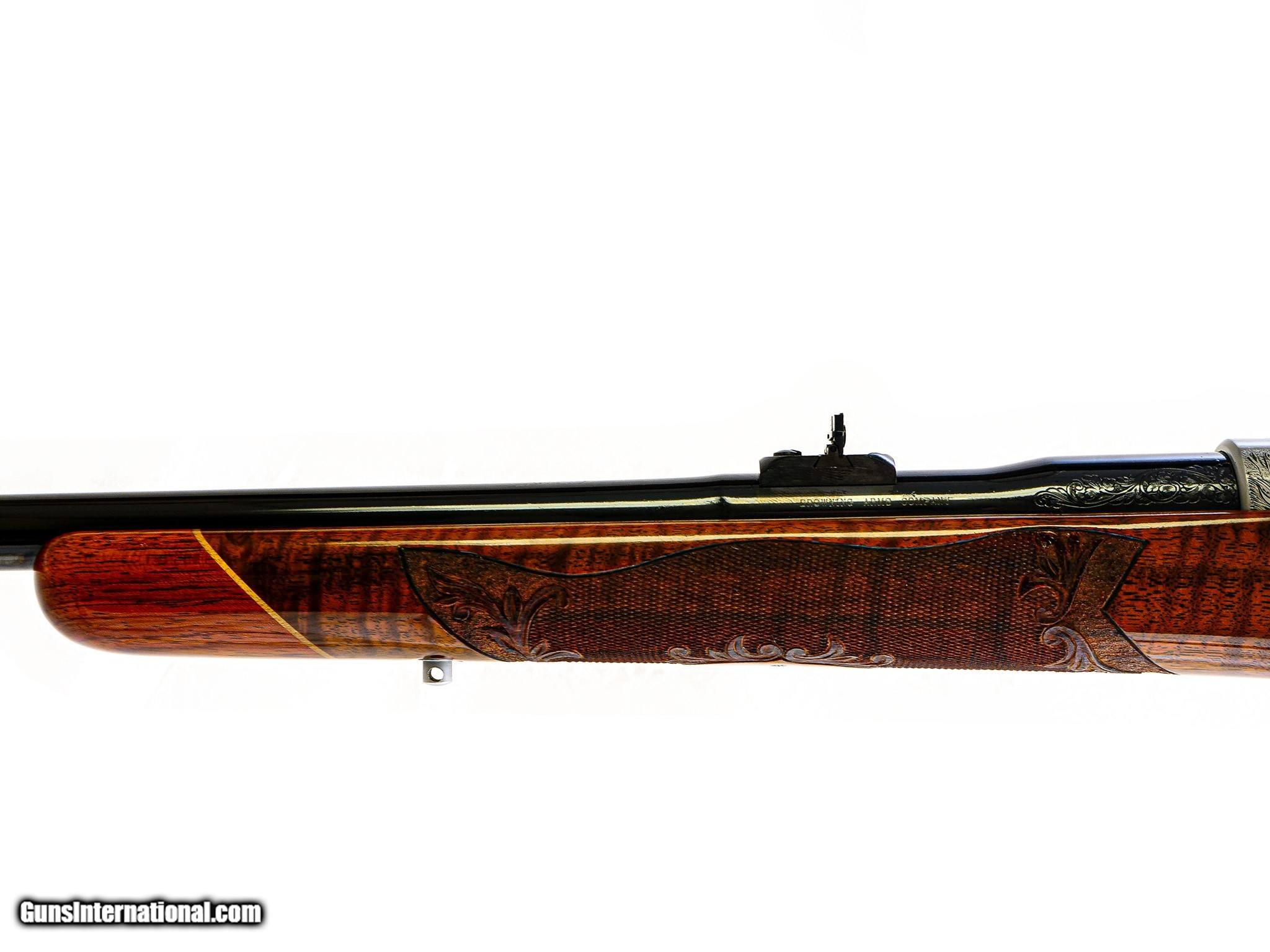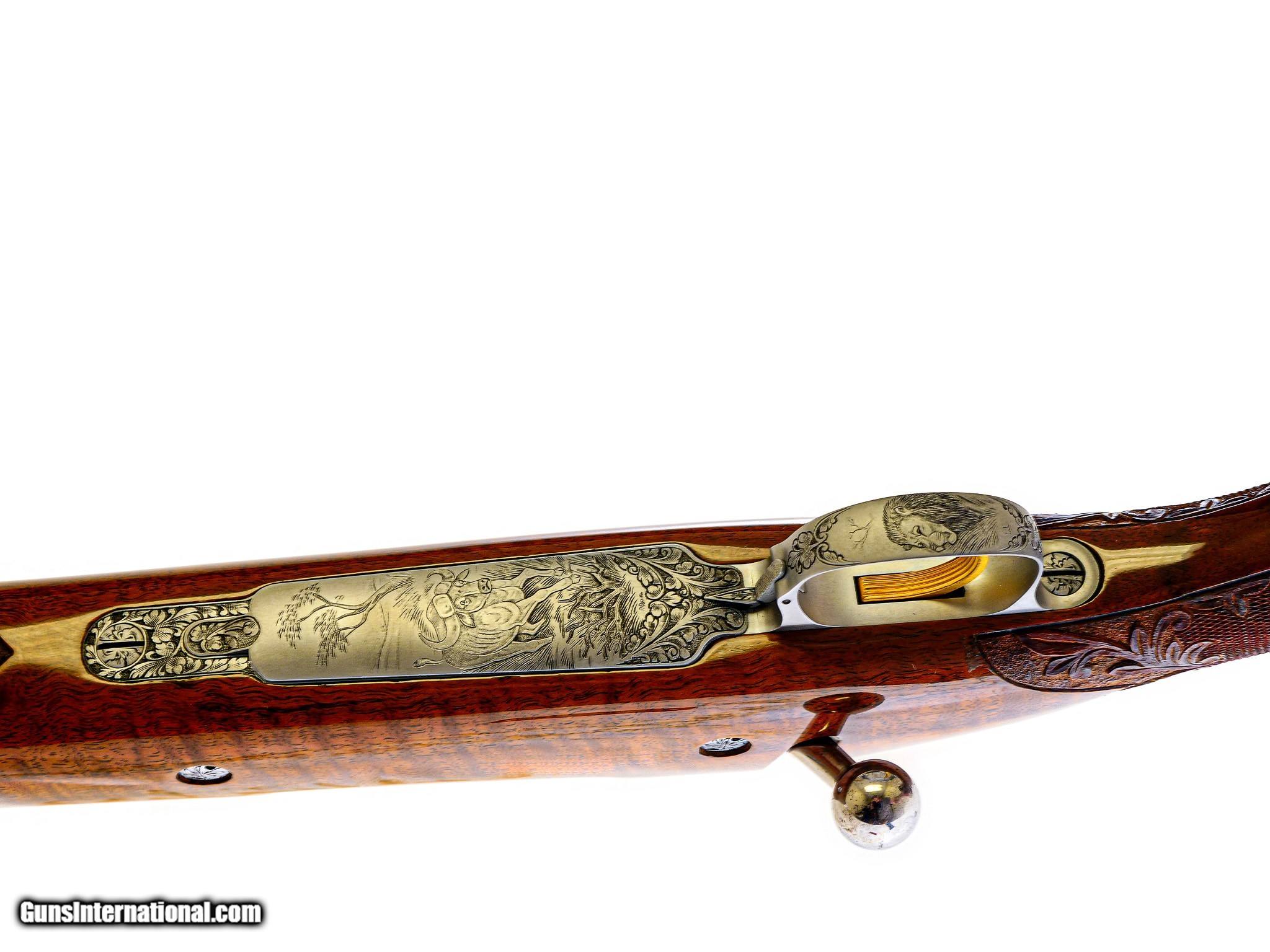 Description: Browning - Olympian, Made In Belgium, .458 Winchester Magnum. 24" Barrel. Made in 1967, round barrel, rhino and elephant surrounded by scroll and game scene, engraved by DeWil and signed "LL". Super fancy high gloss walnut. This gun is brand new, perfect in every way, very rare and hard to come by big bore Olympian rifles. Inv: 66563 $14,500.00 SOLD |
