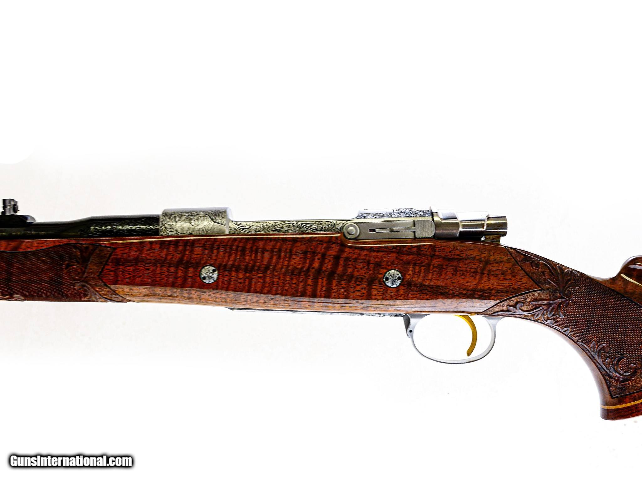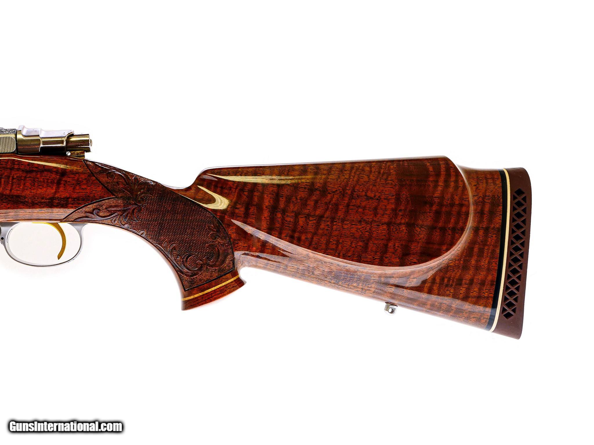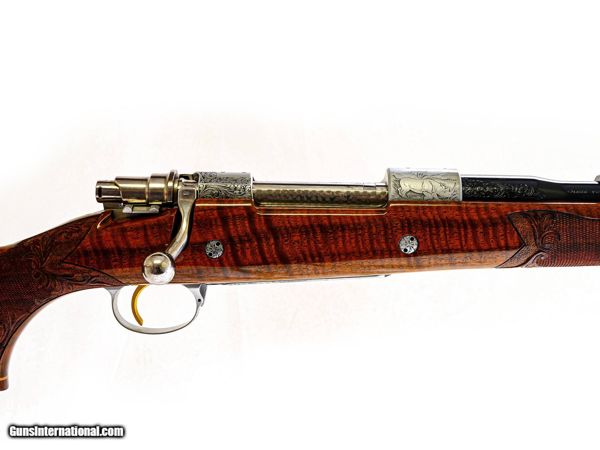 Description: Browning - Olympian, Made In Belgium, .458 Winchester Magnum. 24" Barrel. Made in 1967, round barrel, rhino and elephant surrounded by scroll and game scene, engraved by DeWil and signed "LL". Super fancy high gloss walnut. This gun is brand new, perfect in every way, very rare and hard to come by big bore Olympian rifles. Inv: 66563 $14,500.00 SOLD |
