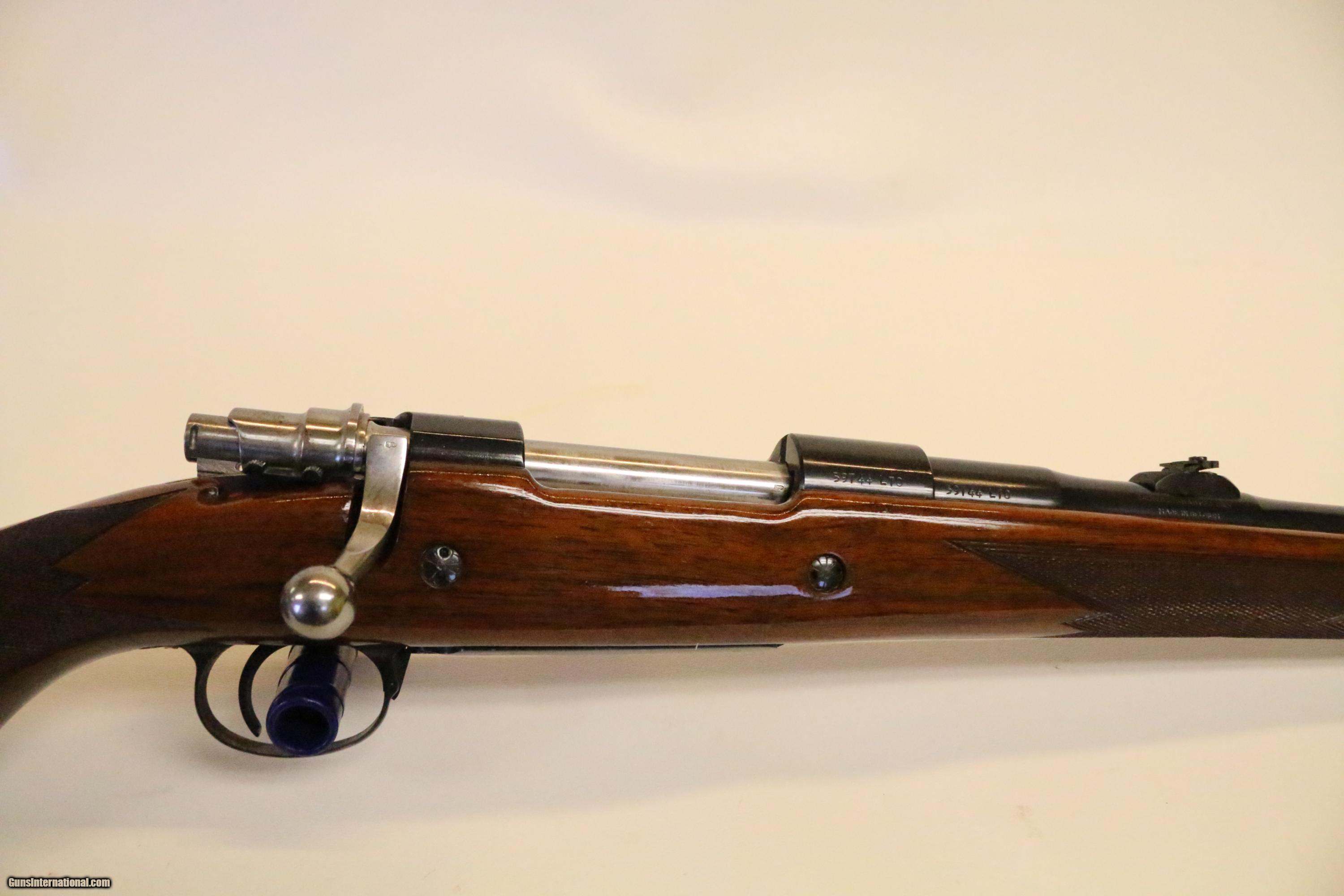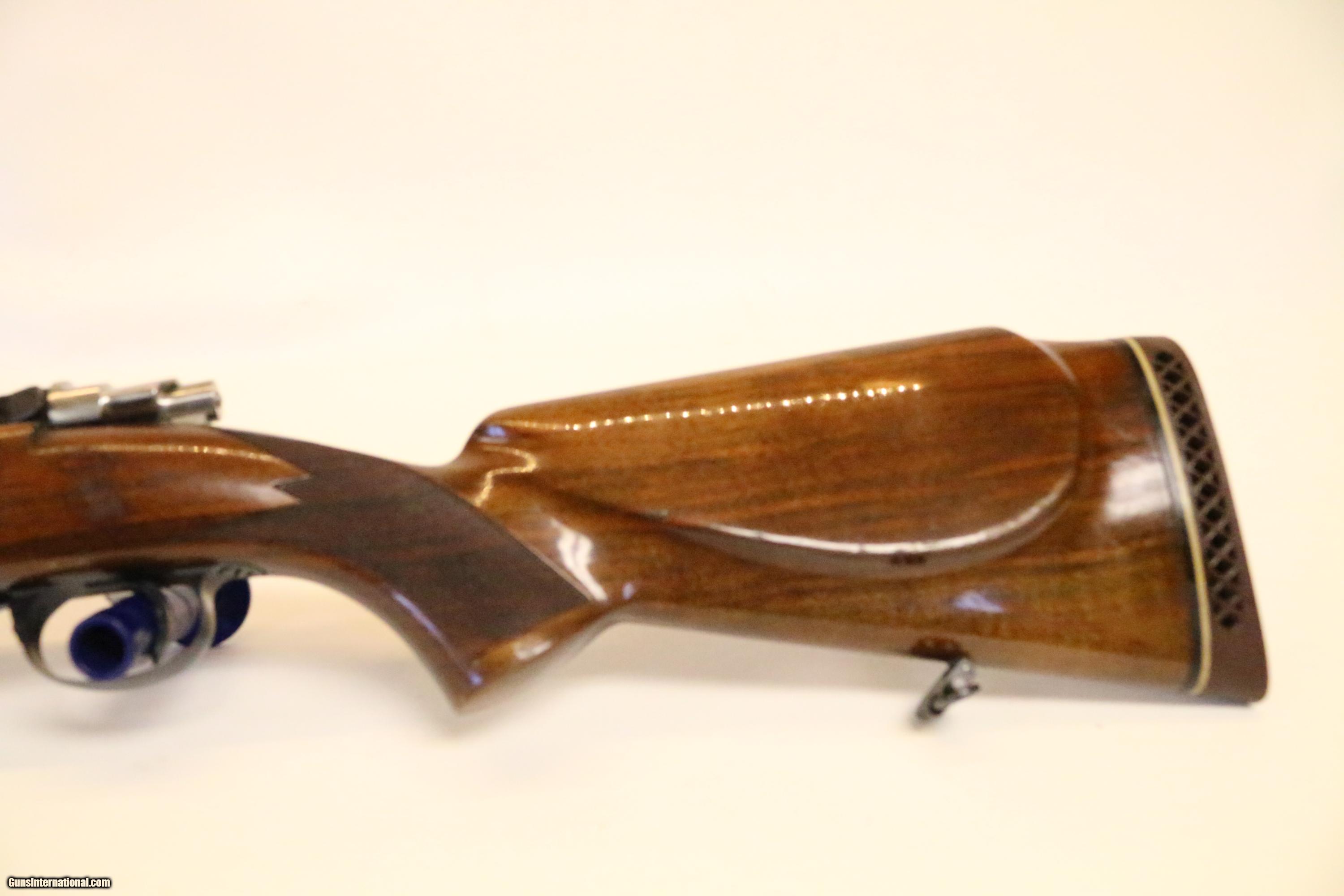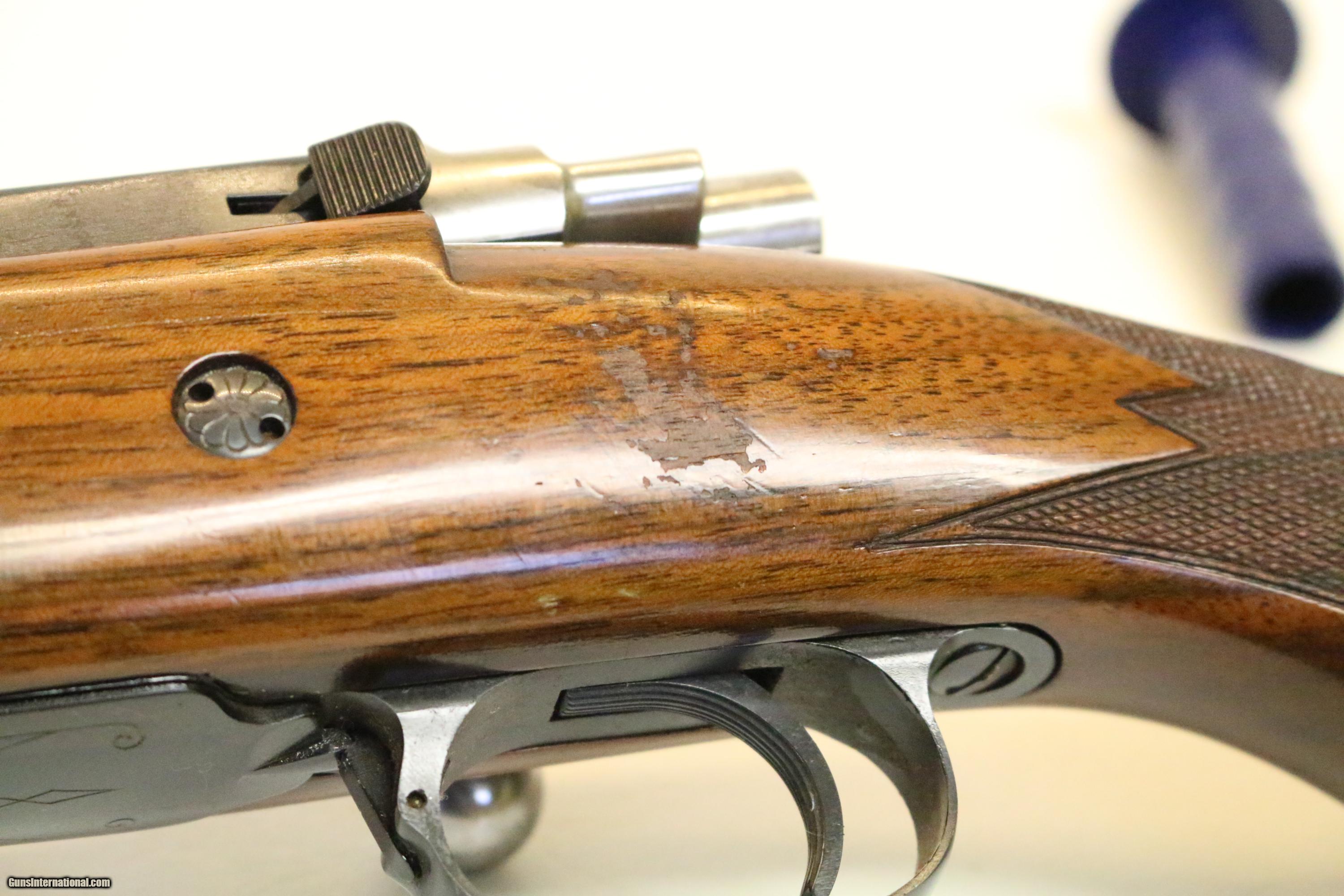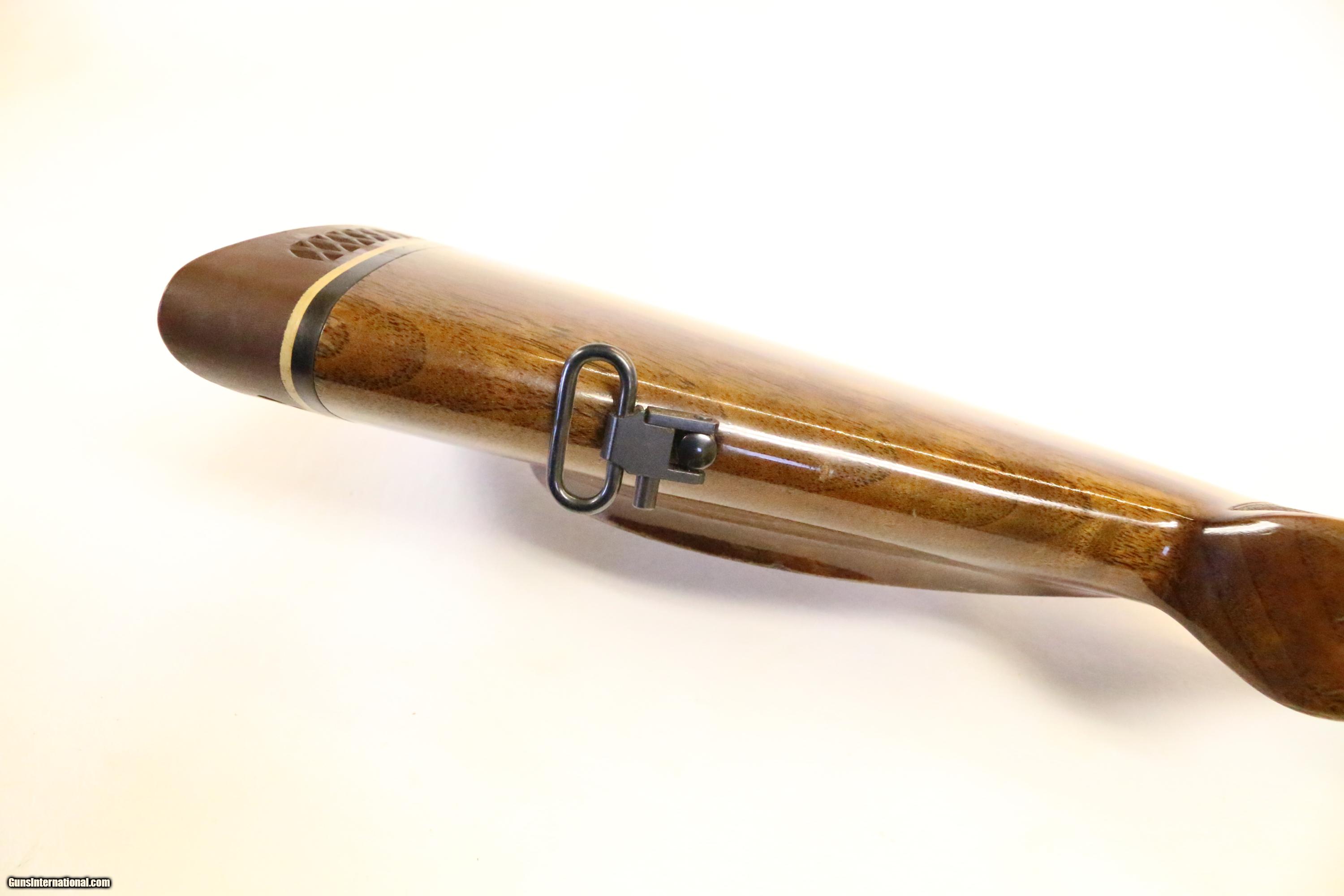 Description: Salt Era gun that shows minimal damage and remains in good condition and very functional. Pristine bore on the 24" barrel chambered in .375 H&H magnum Cal. At some point it had a scope, it retains its original rear and front sights with the front ramp hood., original blue, original recoil pad and sling swivels. The wood finish is showing some grain checking which is to be expected at 47 years of age. There is one blemish left side that is pictured. this is a gun that was hunted with but taken care of Not perfect but a very nice affordable Browning safari in the scare .375 Cal. SOLD |