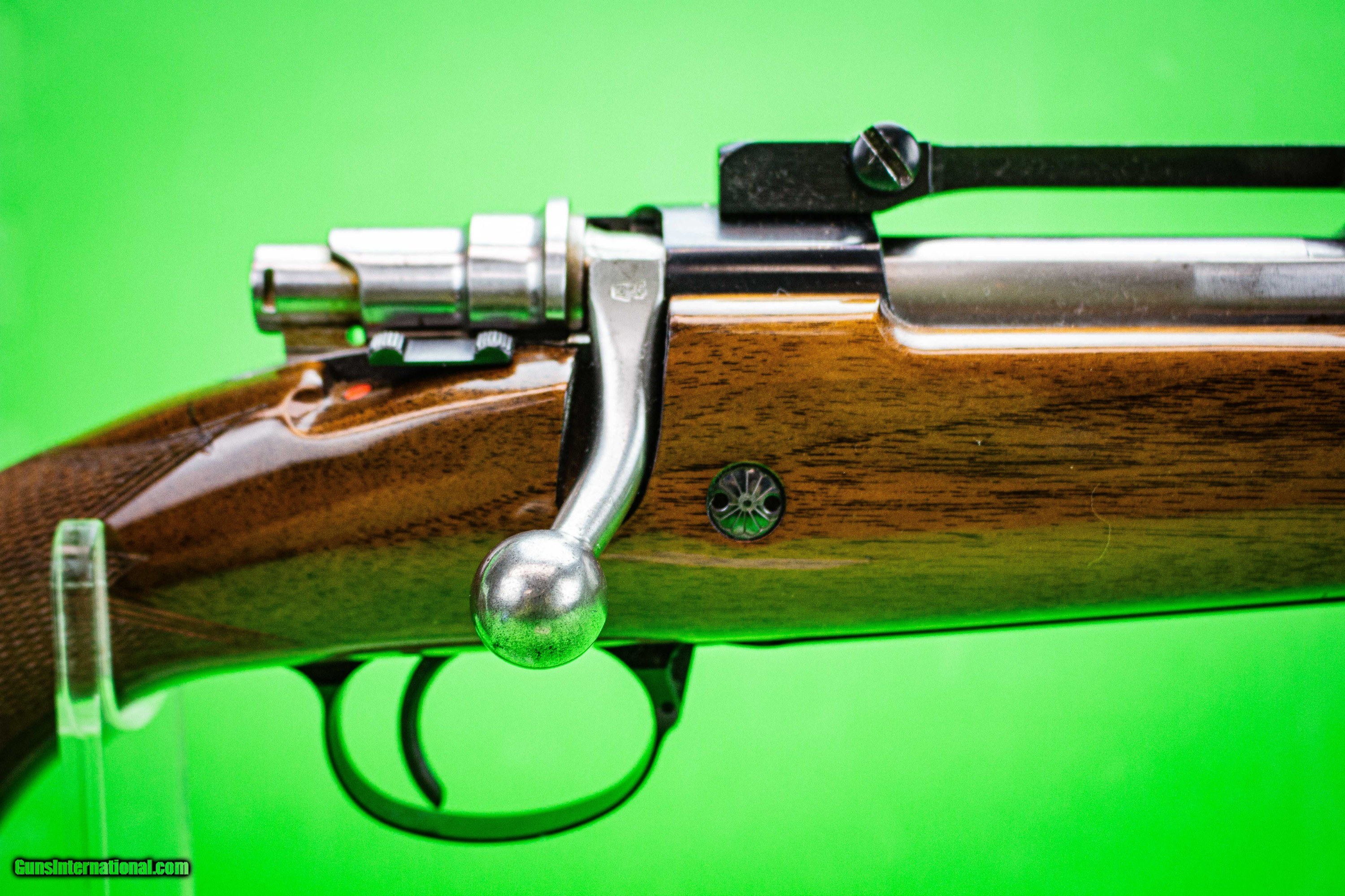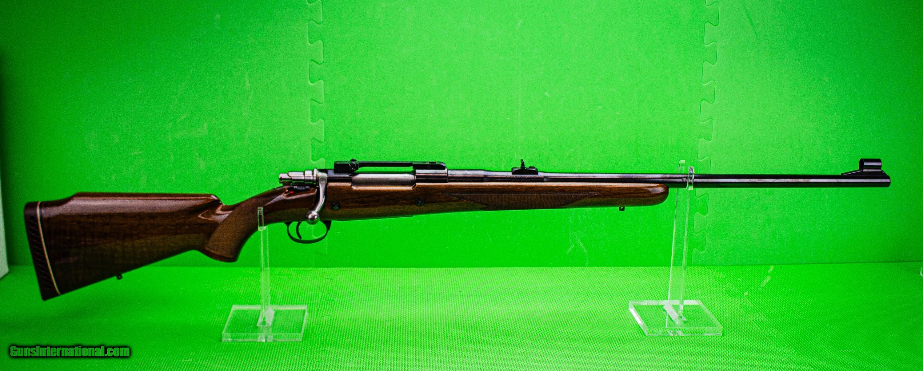 Description: Stunning Belgian Browning Safari Bolt Action rifle chambered in .375 H&H. Serial number 4L 279xx. 24” barrel. Long extractor. One-piece Leupold type scope base.; original iron sights; front sight hood. 13 ½” LOP over Browning pad. Gold filled engraved magazine floor plate. 95% plus, plus condition with a few handling bumps to stock. NO SALT. Locks up tight and functions as it should. Excellent bore. A real beauty. $1599.00 SOLD Curio/Relic: Yes Rifle Caliber: .375 H&H Magnum Manufacturer: Browning-Belgium Model: Safari Serial Number: 4L 29xx Barrel Length: 24 Action: Bolt LOP: 13 12 Item Location: Madison, MS |