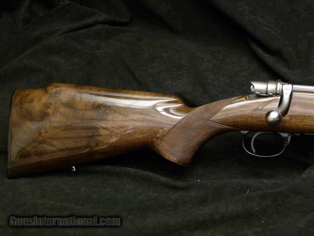 Description: Browning FN Mauser Safari .270 Win. Belgium mfg. serial number: 2L13043 (ca. 1962) .270 Win. 22 1/2" stepped Sporter weight barrel w/ early style fully adustable rear sight and hooded ramp front sight. Right hand Monte Carol cheekpiece stock w/ point checkering pattern w/ smooth dimond in center, single blue steel, engraved cross bolt, and contrasting Rosewood forend tip. Blue steel FN Mauser actionand blue steel floorplate w/ simple line engraving. Gun's wood is 97% w/ some evidence of "crazing" but its hard to find. Steel is 97% w/ some marks here there, bore is perfect. Overall a solid, nice rifle. SOLD Manufacturer: Browning/FN Mauser Model: Safari Serial Number: 2L13043 Caliber Info: .270 Win. Condition: Good ++ Metal Condition: 97% Wood Condition: 97% Bore Condition: excellent Barrels: 22 1/2 Barrel Type: stepped sporter weight Action: Muaser Bolt Action Triggers: factory Stock Dimensions: 13 3/8" lop Fore End: Rosewood Butt Pad: Browning Butt Plate LOP: 13 3/8 Finish: blue Weight: 7 lbs. 6 oz. Sights: early sights Manufacture Date: 1962 |