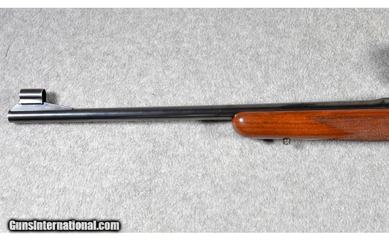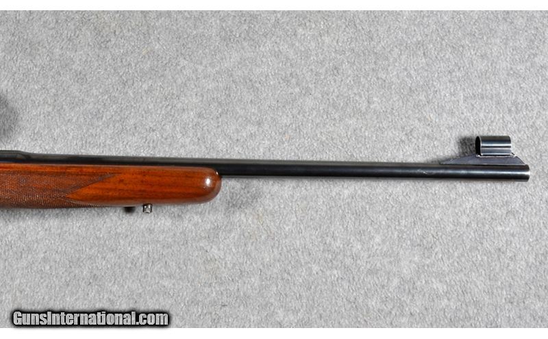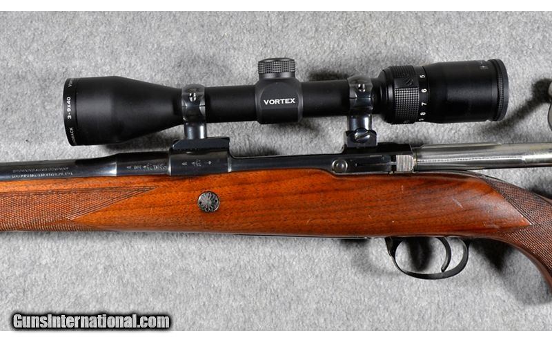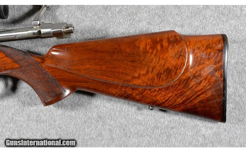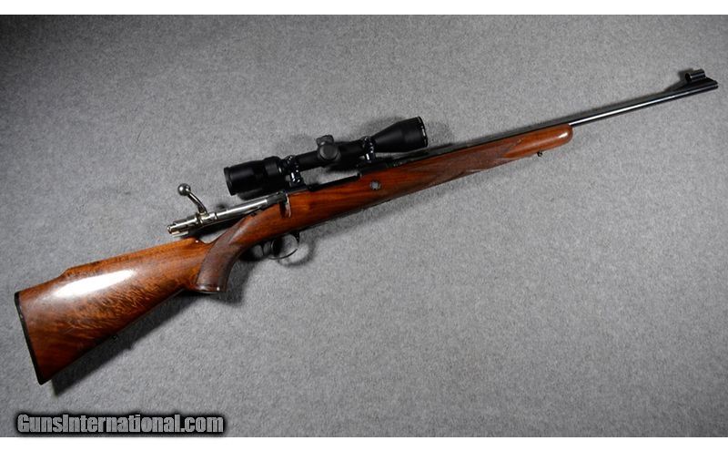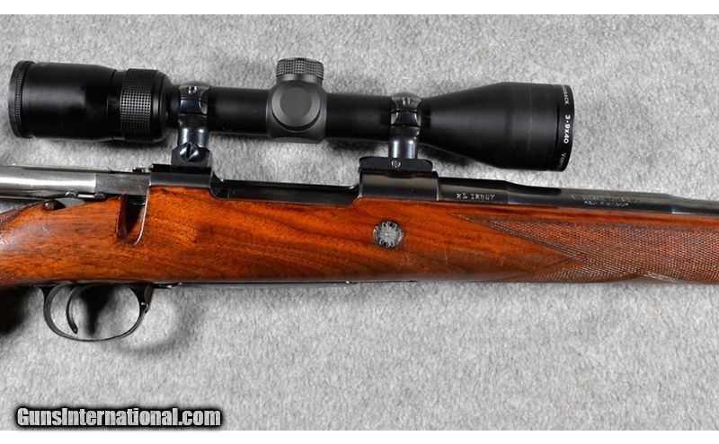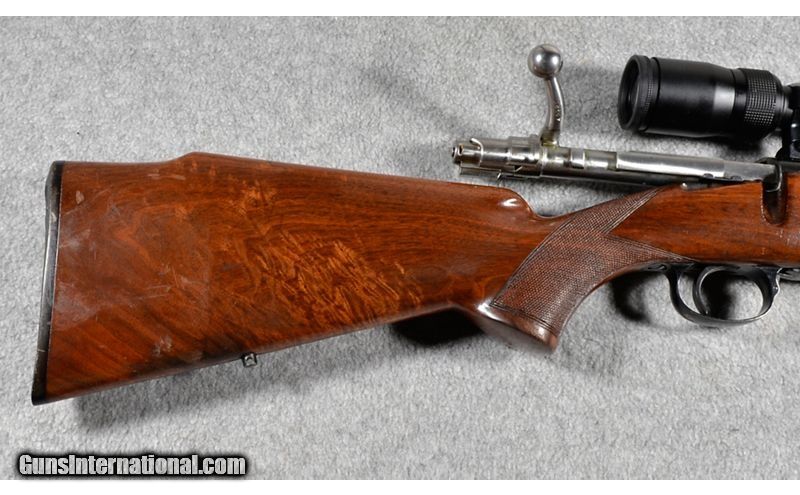 Description: Fabrique Nationale (FN) of Belgium began importing Mauser 1898-pattern rifles and actions to the U.S. by 1947 in three variations that included the Sporter Deluxe, Presentation Grade and Supreme Magnum. These rifles featured actions with special "high tensile" steel to handle the pressures associated with modern cartridges and to increase durability. Tolerances were held to much tighter specifications than were military actions. This helped eliminate much of the "slop" between the bolt body and receiver and also assured that the lugs and breech face were true. Machining and finish work were of top quality. .264 Winchester Magnum SOLD Metal Condition: Very Good Wood Condition: Good Bore Condition: Good Barrels: 22 Weight: 7 lbs Item Location: Lacey, WA |