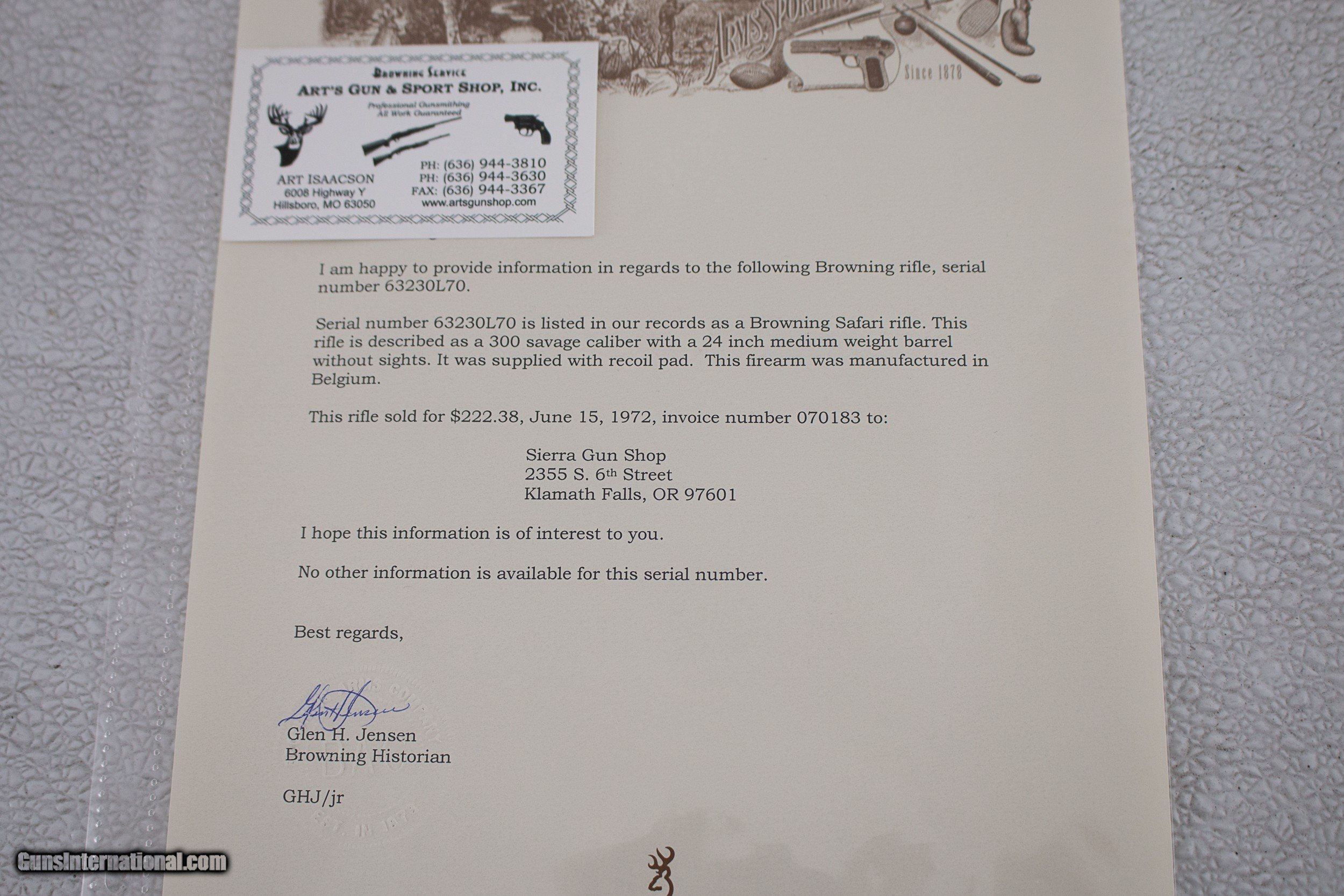 Description: MADE IN BELGIUM IN 1970. 24'' BARREL WITH NO SIGHTS. FACTORY RECOIL PAD. ALL FACTORY AND CLEAN. PLEASE ADD $100 FOR SHIPPING. SOLD Curio/Relic: Yes Manufacturer: BROWNING Model: SAFARI Condition: EXCELLENT Metal Condition: EXCELLENT Wood Condition: EXCELLENT Bore Condition: EXCELLENT LOP: 13 3/4'' Extras: FACTORY LETTER |