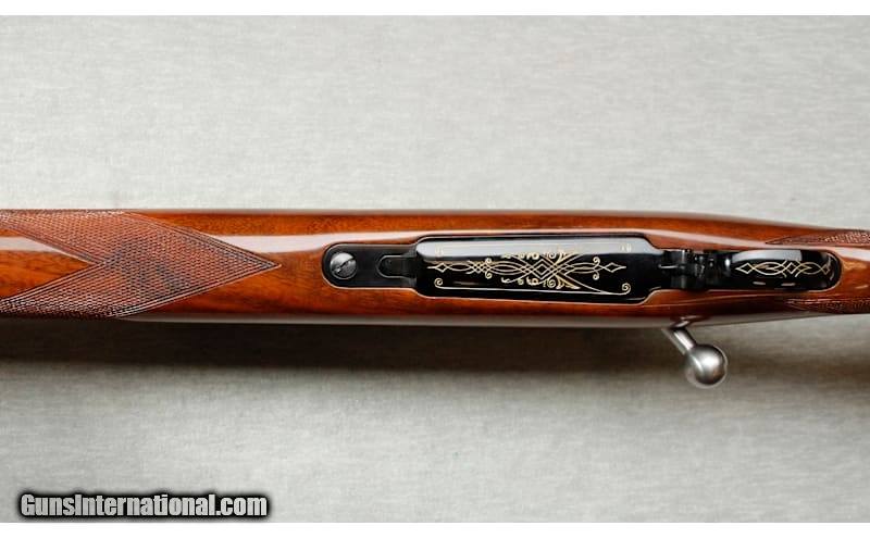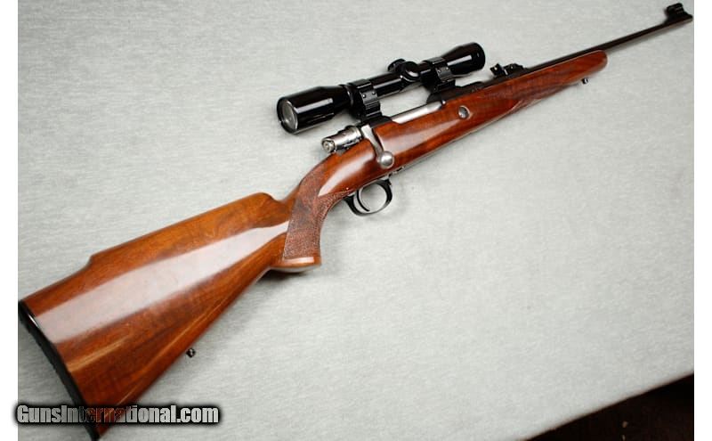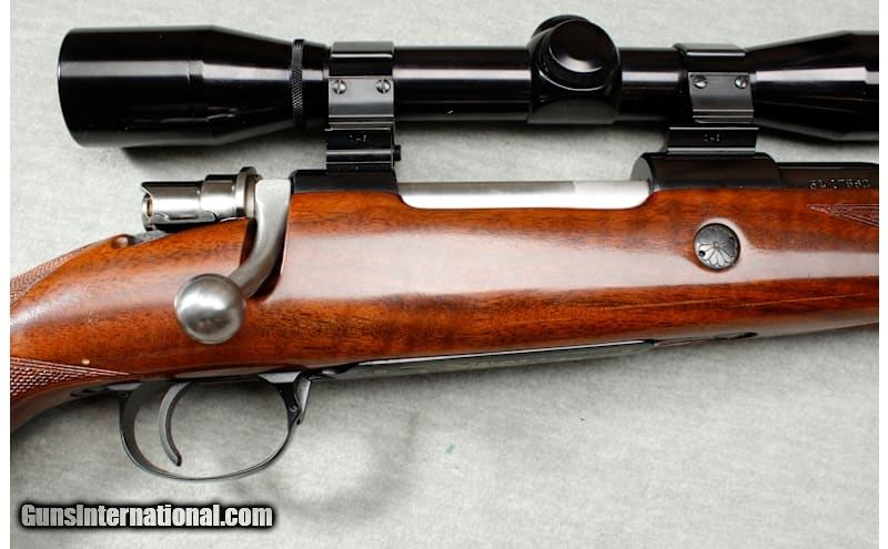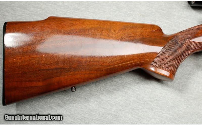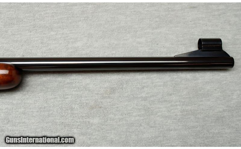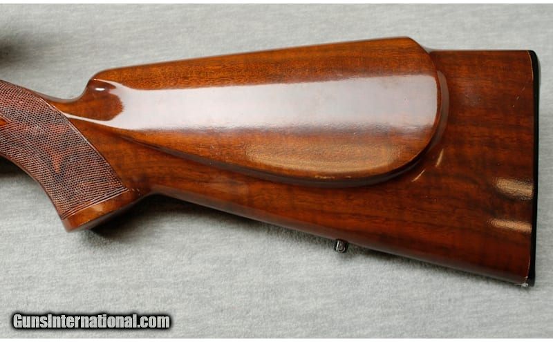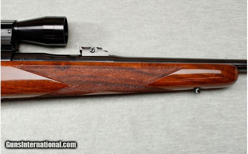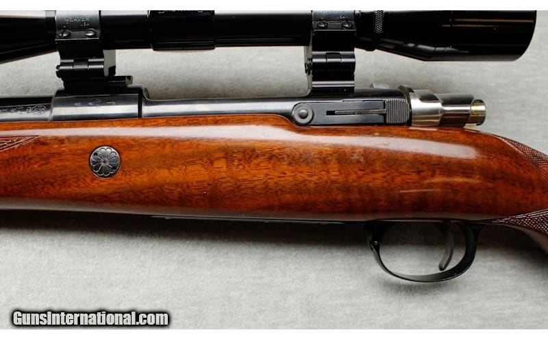 Description: BROWNING SAFARI GRADE BOLT ACTION RIFLE. Receiver mounted Browning 4x scope. Scope has duplex crosshair reticle & optics that are a bit cloudy. Matching numbers on bbl. & bolt. Belgian made Safari grade rifle. Blued finish with gold colored engraving on bottom metal. Glossy finished checkered walnut Monte Carlo stock with bottom mounted sling studs. CONDITION: stock shows some light flaking & scattered handling marks. Metal retains nearly all its original blue with some light handling wear. Action functions properly when hand cycled. Bright near excellent bore. .30-06 Springfield SOLD Metal Condition: very good Wood Condition: very good Bore Condition: bright Barrels: 22.5" barrel Stock Dimensions: 13.5 Fore End: Checkered wood Butt Pad: Browning plastic Weight: 7 lb - 14 oz incl scope Sights: Ramped bead front sight with hood. Adjustable u-notch rear sight. Browning 4x scope Item Location: La Vista, NE |