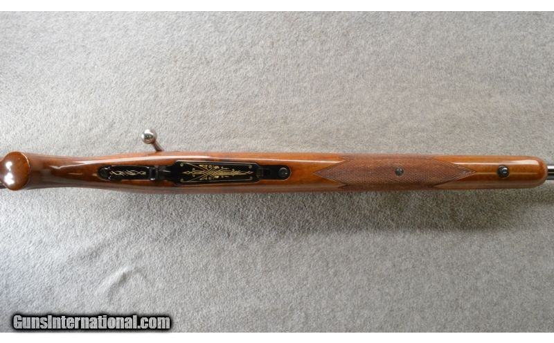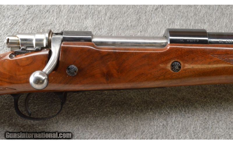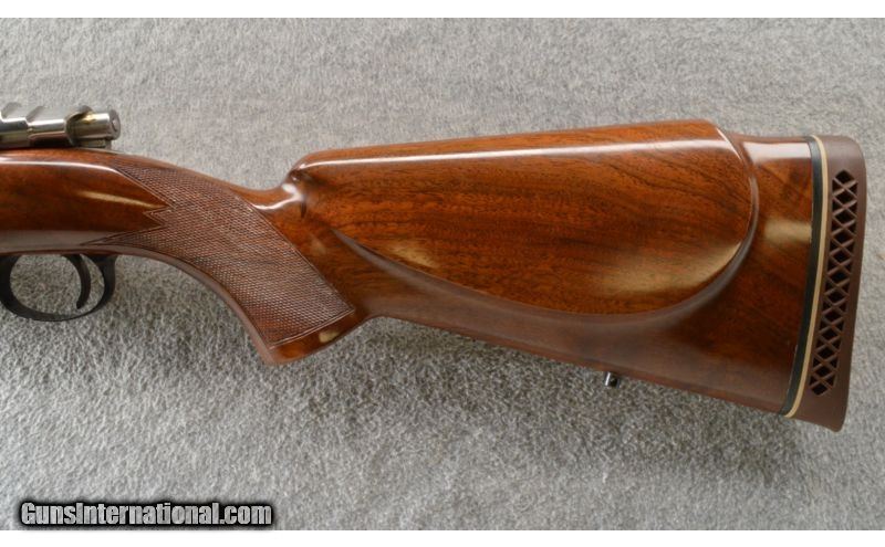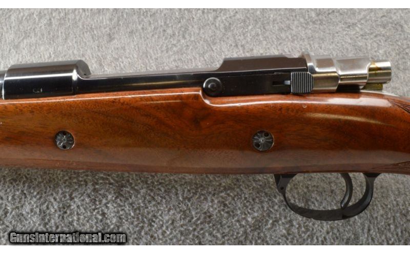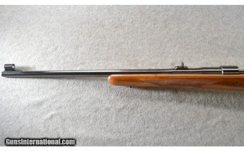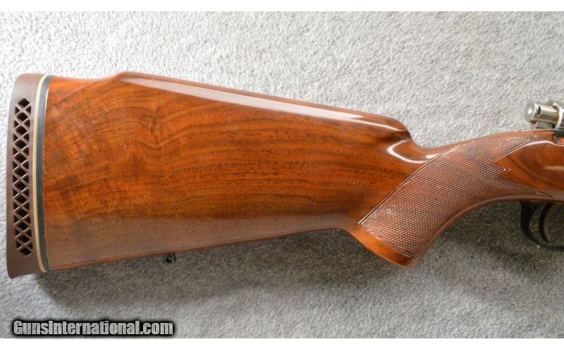 Description: This is a very nice Belgian Browning Safari Grade bolt action rifle manufactured in 1959?. The rifle has a ramped beaded blade front and flip up adjustable notch rear sights, standard barrel markings and Belgian commercial proofs. The rifle is also drilled and tapped on top of the receiver with filler screws in place. The floor plate and trigger guard have light scroll engraving with gold fill. Checkered pistol grip stock with vented Browning recoil pad. This is a very nice and close to new looking rifle. SOLD Manufacturer: 9L 49XXX Caliber Info: .458 Win Mag/ Chambers: Bolt action repeater. Metal Condition: Excellent with no visable issues. Wood Condition: Excellent with a few tiny dings you have to look for. Bore Condition: Bright and shiny. Barrels: 24 inch blue with sights. Triggers: Single blue. Stock: Very nice walnut with a checkered pistol grip, Monty Carlo cheek and sling studs. Stock Dimensions: 13 1/2 inch LOP. Fore End: Matching checkered walnut with a sling stud. Butt Pad: Browning brown rubber butt pad. Weight: 7 Lbs. 12 Oz. Sights: Ramped beaded blade front and flip up adjustable notch rear sights Item Location: Owatonna, MN |