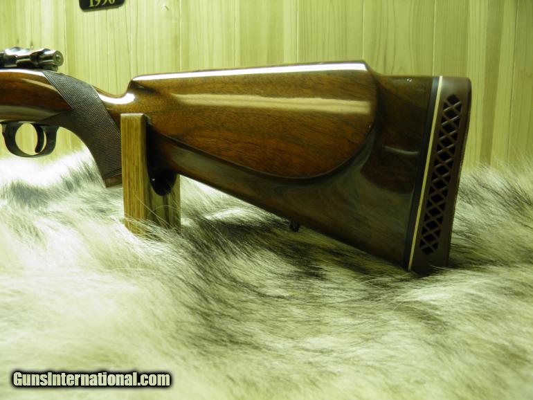 Description: BROWNING SAFARI GRADE RIFLE CAL. 308 NORMA MAGNUM LONG EXTRACTOR MANF: 1963 BARREL LENGTH 24", WITH A 1- 12" TWIST, OVERALL LENGTH 45", APPROX. WEIGHT 8LBS 4OZ, LENGTH OF PULL TO FACTORY RECOIL PAD IS 13 5/8", SIGHTS, FRONT- GOLD BEAD HOODED AND RAMPED, REAR- FOLDING LEAF DESIGN, WITH FINE CLEAR CALIBRATIONS, PROVIDED FOR BOTH HORIZONTAL AND VERTICAL ADJUSTMENT, CARTRIDGE CAPACITY 4 ROUNDS, RECEIVER IS DRILLED AND TAPPED FOR SCOPE MOUNTING, TRIGGER, SMOOTH, SHORT AND CRISP, THUMB SAFTEY THREE POSITION, STEEL TRIGGER GUARD AND HINDGED FLOOR PLATE, ARE HAND ENGRAVED AND GOLD FILLED, SELECT AMERICAN WALNUT STOCK, WITH MONT-CARLO CHEECK-PIECE, HAND CUT CHECKERING, ATTACHED SWIVEL STUDS, HAND FINISHED IN HIGH GLOSS, BOLT, EXTRACTOR, SHROUD, AND COCKING PIECE ARE HIGHLY POLISHED FOR SMOOTH AND EASE OPERATION, METAL SURFACES, ARE HIGHLY POLISHED AND RICHLY BLUED, METICULOUS BELGIUM QUALITY RIFLE! "CONDITION" WOOD AND BLUEING 99%+ "COLLECTOR QUALITY SOLD |
