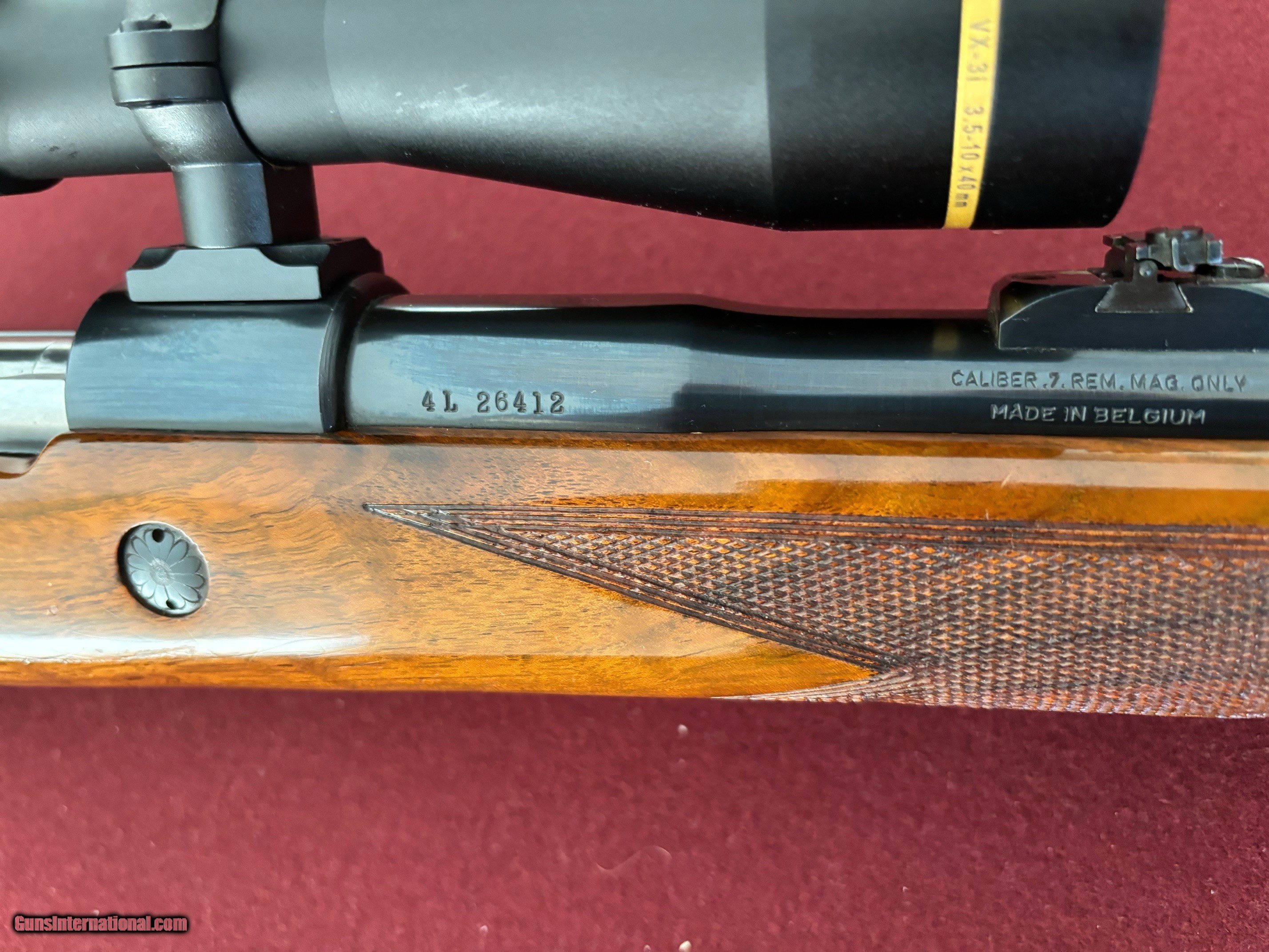 Description: I have spent decades as a Browning collector buying and trading to improve the condition of my collection. As I get older it is time to downsize a bit. This is a Browning Safari grade rifle in 7mm Remington Magnum from 1964. Serial number is 4L 26412. Given the date of manufacture, there will be no issues with a salt wood stock. The rifle is all original including recoil pad. LOP is 13.5 inches to the pad edge. The wood has scattered dent, dings and scratches with a notable cluster along the underside of the forend. The metal finish is in great shape. The scope mounts are included. The relatively new Leupold VariX III scope in 3.5 x 10 power can be included for an additional $300. Shipping and handling is $100. SOLD Curio/Relic: Yes Rifle Caliber: 7mm Remington Magnum |