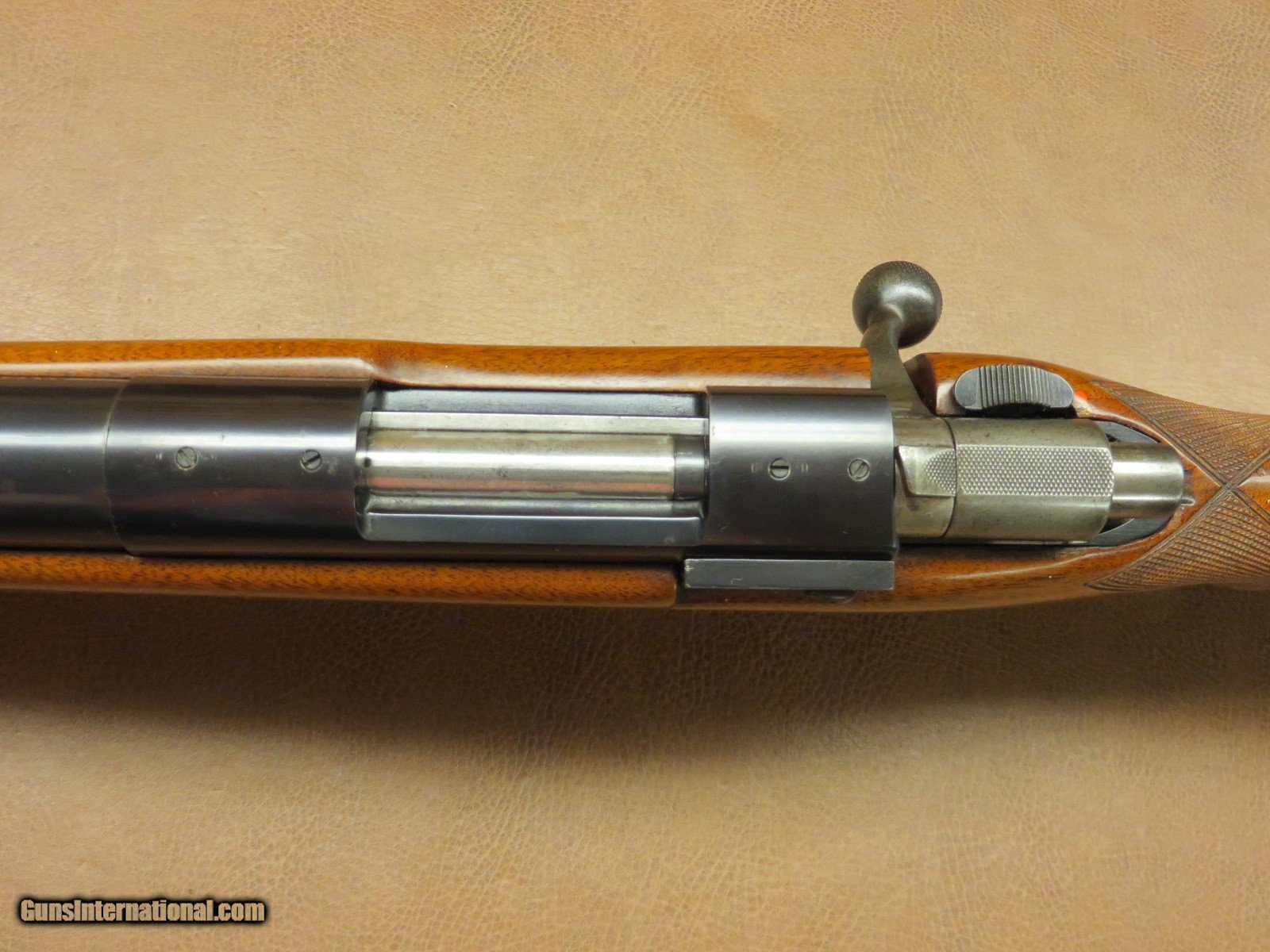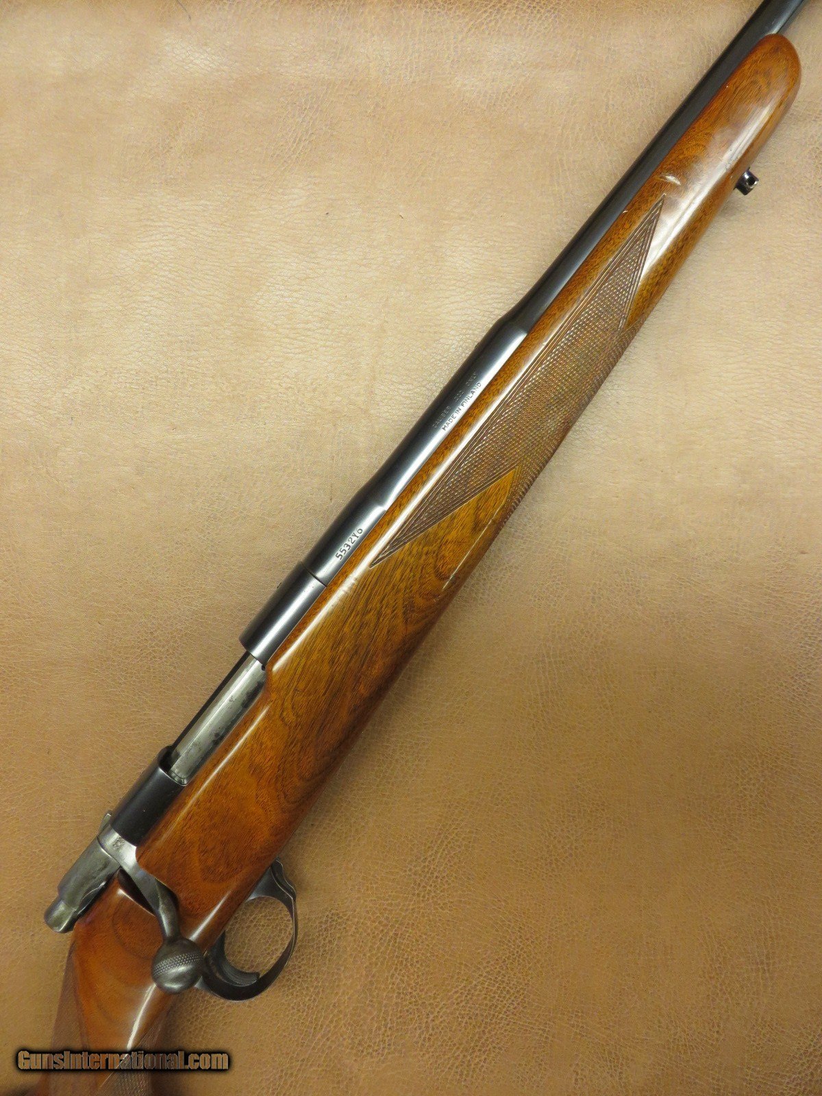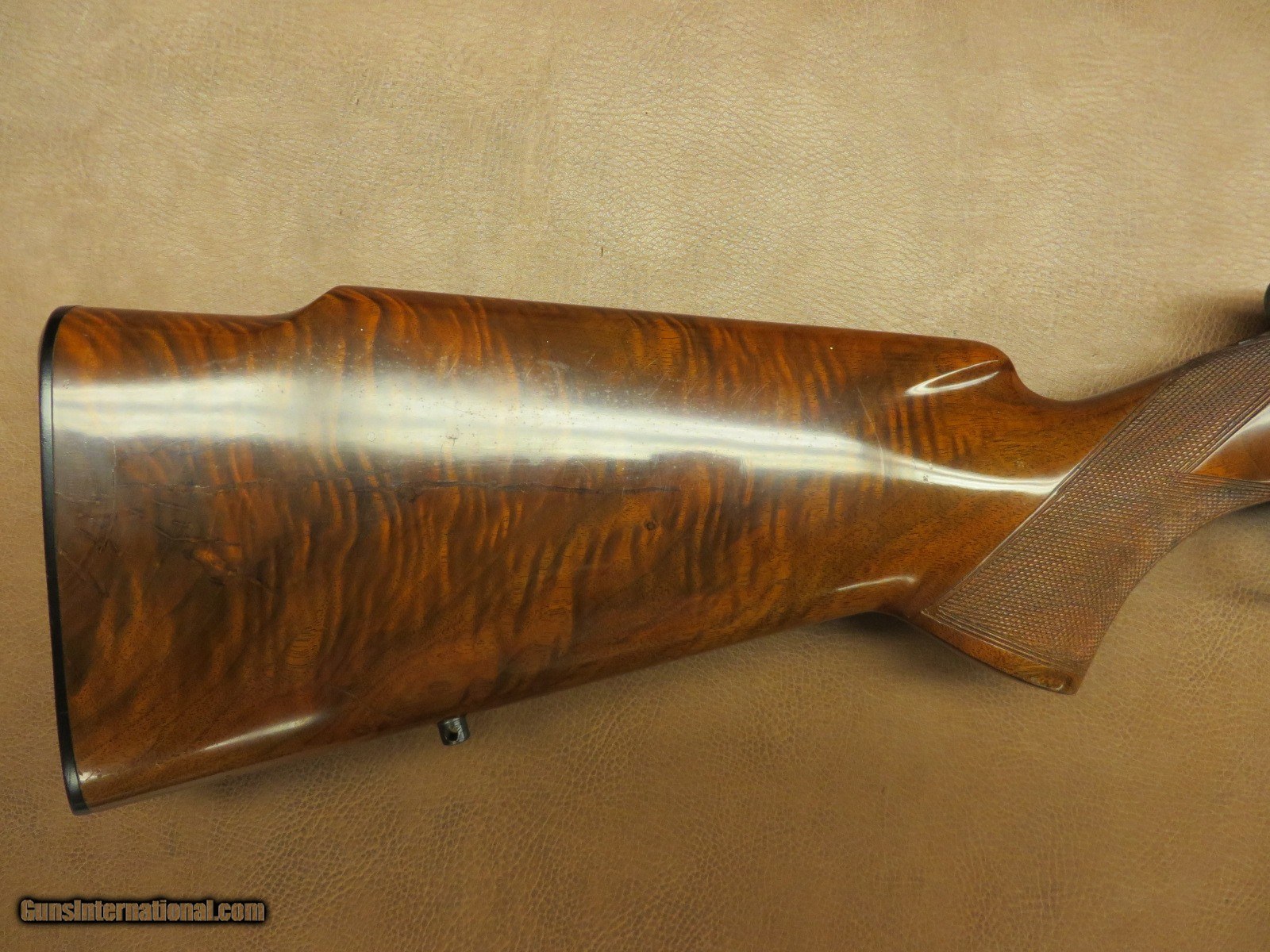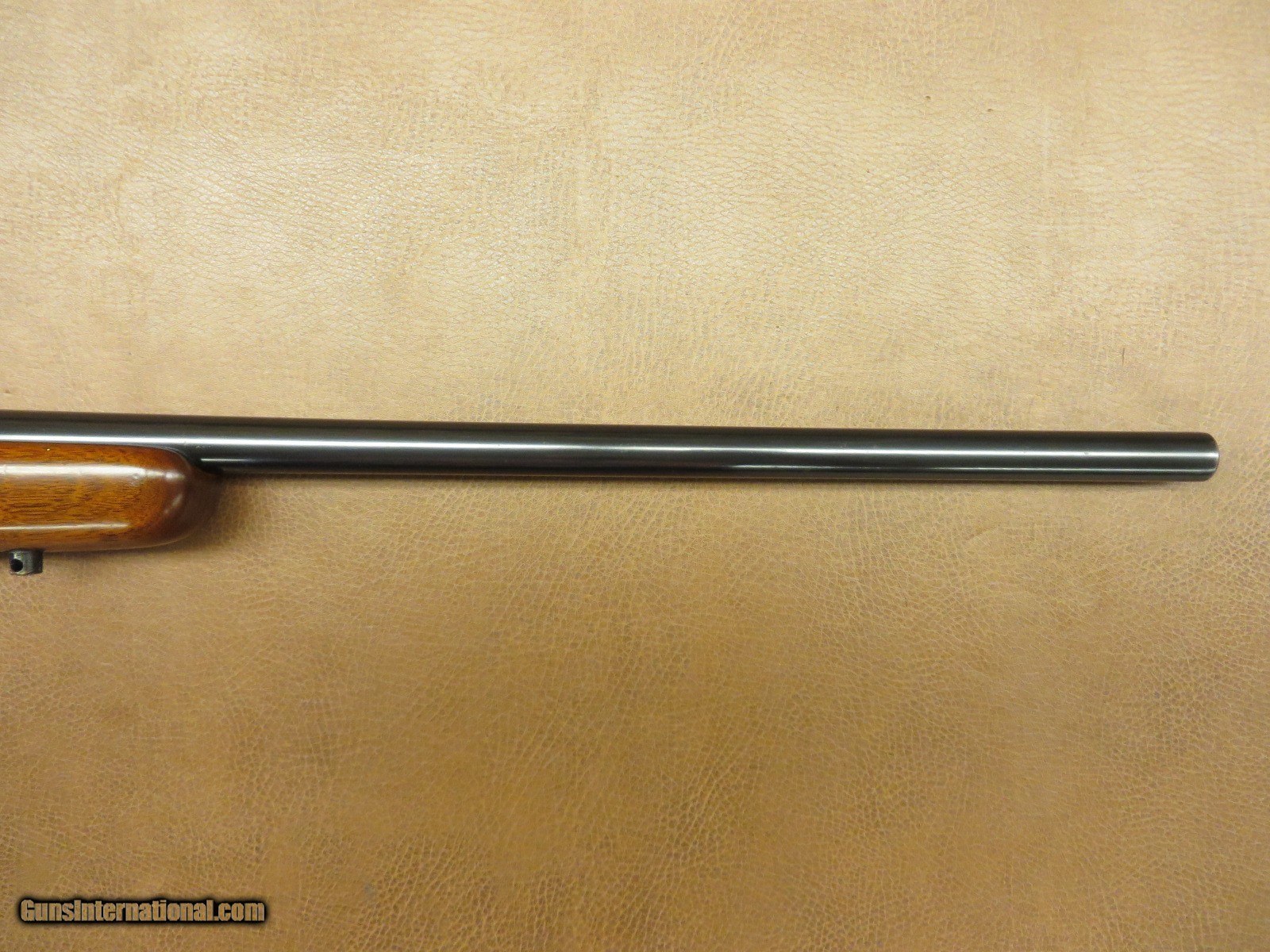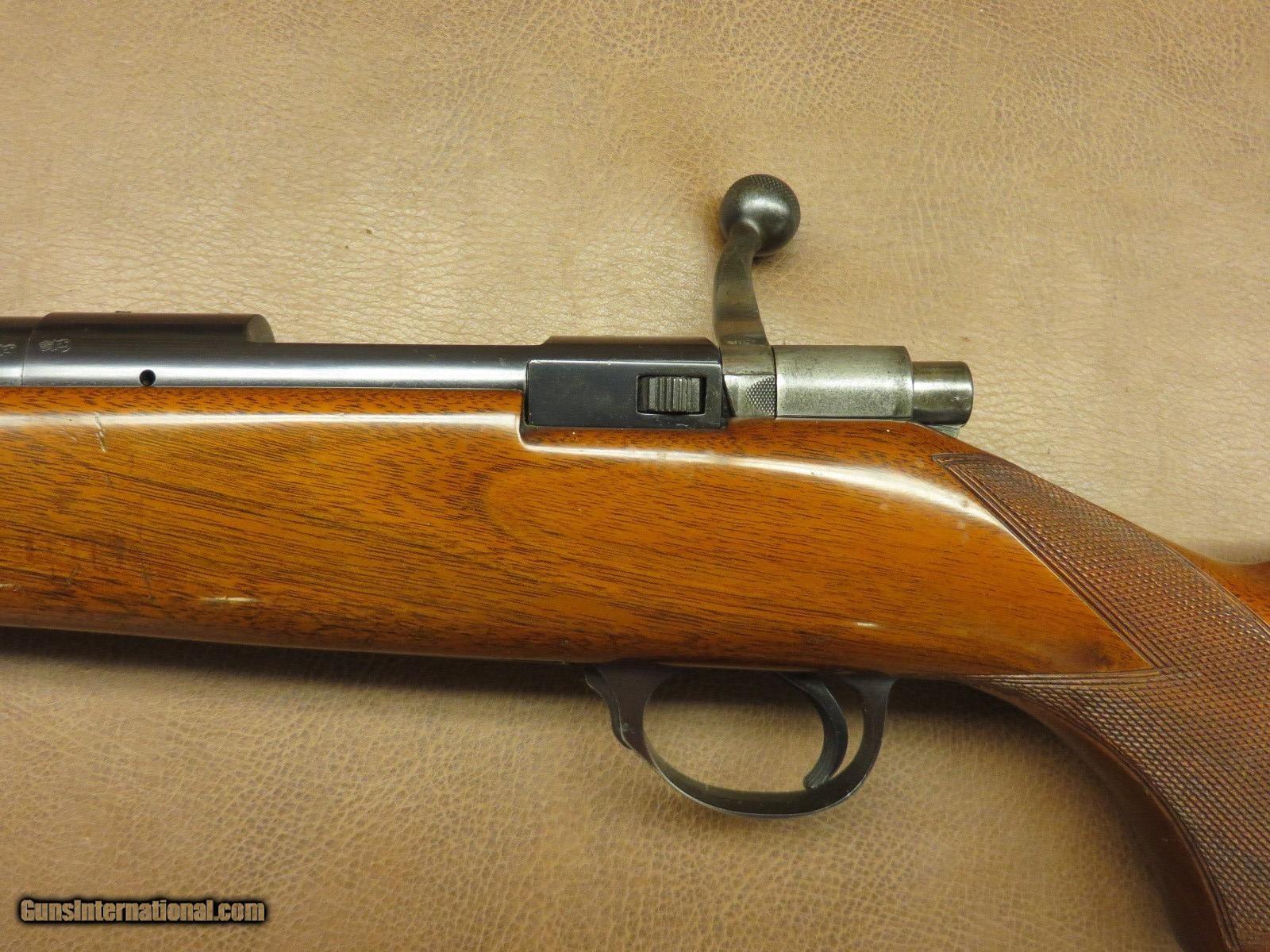 Description: .222 Remington has 22 inch stepped pencil barrel. Made in Finland in 1966 on Sako roundtop action. Engraved triggerguard and floorplate. Nicely figured high gloss checkered walnut stock has sling swivel studs, cheekpiece, and original butt plate. Blue on barrel and action is near 95%. Blue on triggerguard and floorplate and the wood finish are about 90%. SOLD |