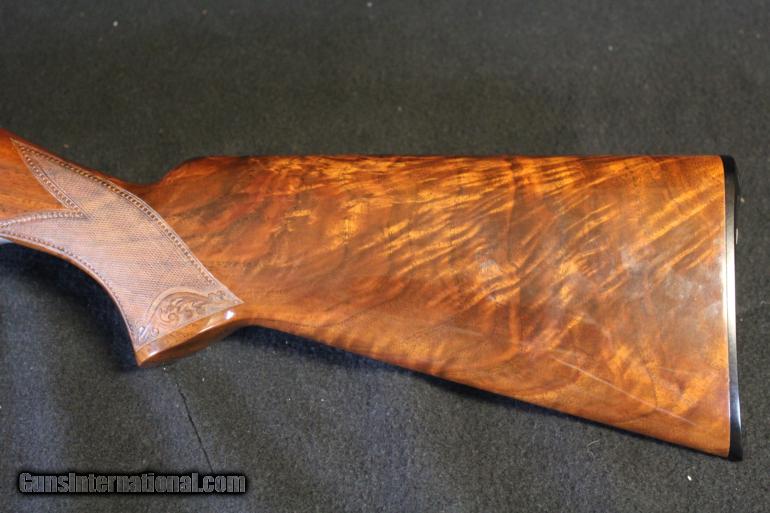 Description: Belgium Browning Grade IV BAR in .270 S/N 70388M70. Unfired and we believe the original box exists and will be included if it does. Wood and checkering are exceptional and shows no scratches or wear. The Metal has zero signs of wear but there is a thumb print sized light blemish on the lower right receiver (pictured) and a small area of discolor on the top of the receiver (also pictured) Barrel rate 99% with a small scratch just below the sight hood. Engraving is signed by master engraver CH. Servais SOLD |