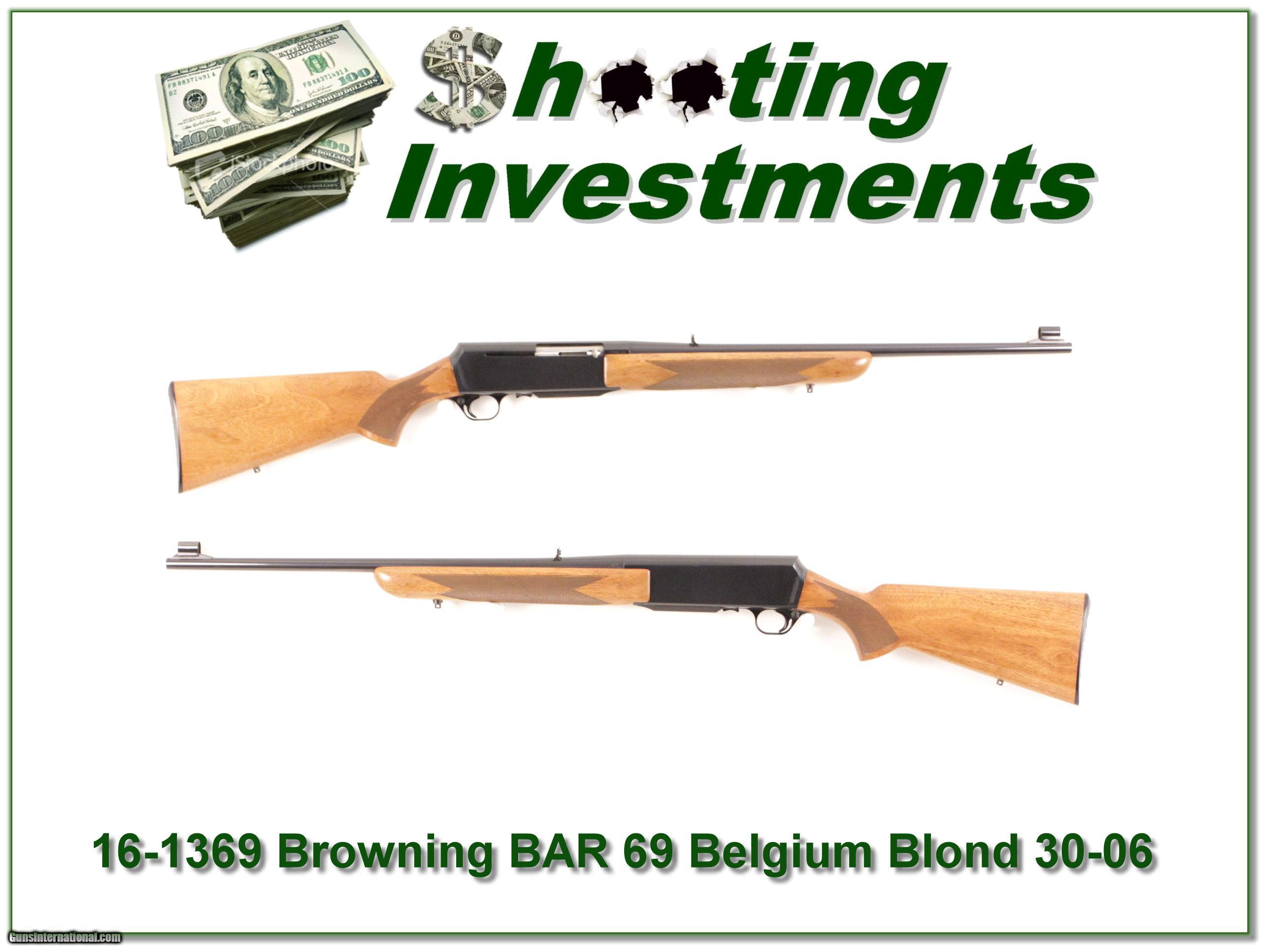 Description: This is a very Blond 1969 Belgium made Browning BAR. It is the full Belgium machined steel receiver BAR in 30-06. The blue is excellent. Wood has scattered light hunting marks. It will make a classic hunting gun and these original BARs are increase in value. That makes them Shooting Investments! Shipping and insurance is $35 or $15 more if you want it shipped in a new Plano hard case. Please email me with any questions or larger pictures. (I now consign quality firearms only 10%! Let me know if you have any you would like to sell!) [16-1369] Payment: Payment is by Money Order, Cashiers Check or Personal Check. I can now also accept MasterCard and Visa with a 3% convenience fee. PayPal can be used for some items but never firearms. Please let us know if you would like to pay via PayPal. Shipping: The shipping charge will be listed in each description. It is $35 for most guns. Some heavy guns or those insured for over $2000 will be higher. Shipments to Alaska and Hawaii are higher because air shipment is required. Most firearms are shipped within 5 days of receipt of payment. We prefer shipping at the beginning of the week to avoid firearms in transit over weekends. We package all shipments carefully and insure them for the full purchase price, rounded up to the next $100. In the unlikely event that damage occurs, it is important that you save all packaging material for the claims process. Optics are shipped Priority Mail and most other non-firearm shipments are shipped First Class. Returns: Our return policy is simple. If for any reason you are not pleased with your purchase, you may return your item for a refund. The only exception is ammunition, it cannot be returned. It is important to us that you are happy. Guns cannot be fired or dissembled before returning them and must be returned in the same condition as received. Notification of a return must occur with-in 3 days of receipt at your dealer. Shipping, convenience and dealer fees are not refundable and are the responsibility of the buyer. Lay-a-way: If needed, we offer a 60 day lay-a-way option on most firearms. It is 1/3 now, 1/3 in 30 days and 1/3 in 60 days. Lay-a-way firearm sales are final. Consigning your firearms with Shooting Investments: We will help you get top dollar for your firearms. While most local guns shops charge 20% or more, our fee is only 10% with a minimum of $50. At your local gun shop it might take months to sell. Selling on-line provides instant access to thousands of interested buyers. You won’t find any other on-line dealer willing to sell your firearms for only 10% or listing every gun on 4 separate s. Selling through an House typically costs the seller 15% and the buyer an addition 15% (so 30%) and you have to wait several months to sell and longer to receive funds. If properly priced, we will sell your firearms in a week or two. Send us an email or give us a call and we’ll explain how easy it is for you to get top dollar. Trading: We collect guns and usually just trade for guns we want to add to our collections. We often sell guns for others wanting to purchase one of ours. We find this the most fair to both of us. Our Commission is only 10% and we hold the gun you want until yours sells. Please contact us if you want to sell one of yours to buy one of ours. Help for California Buyers: We are happy to ship to California. It is the buyer’s responsibility to make sure any item you buy is legal in your state. We are also happy to help with your purchase of a firearm from someone other than us. If you see a gun you would like to buy but the seller can’t or won’t ship to California we can help. You buy the gun and have it shipped to us. We’ll then ship it to your California dealer. The cost for this service is only $30 + shipping. Let me know if we can help! SOLD |