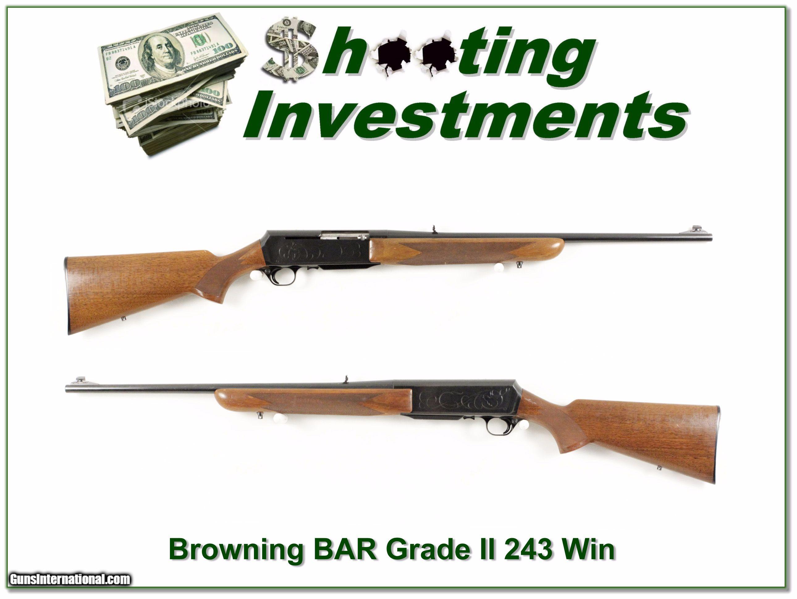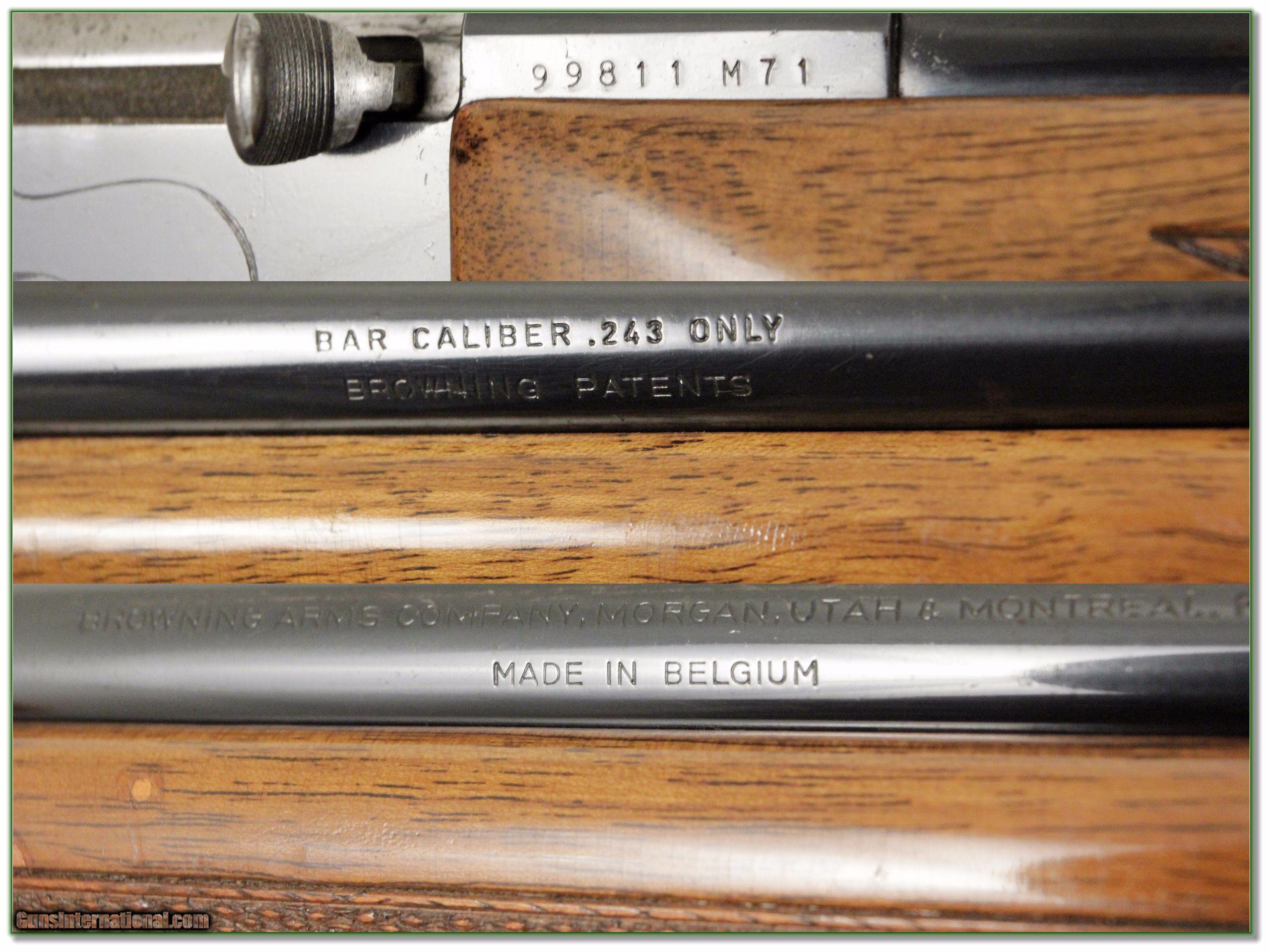 Description: This is a 71 Belgium made Browning BAR Grade II. These full Belgium 243s are hard to find. This one has been hunted and has some thinning on the receiver sharp edges and scattered minor marks on the wood. It will make a classic hunting gun with almost no recoil or it could be restored to collector condition. It is a real Shooting Investment! Shipping and insurance is $35 or $15 more if you want it shipped in a new Plano hard case. Please email me with any questions or larger pictures. (Consign your quality firearms with Shooting Investments for only 10%! Let me know if you have any you would like to sell!) 17-0977 Payment: Payment is by Money Order, Cashiers Check or Personal Check. I can now also accept MasterCard and Visa with a 3% convenience fee. PayPal can be used for some items but never firearms. Please let us know if you would like to pay via PayPal. Shipping: The shipping charge will be listed in each description. It is $35 for most guns. Some heavy guns or those insured for over $2000 will be higher. Shipments to Alaska and Hawaii are higher because air shipment is required. Most firearms are shipped within 5 days of receipt of payment. We prefer shipping at the beginning of the week to avoid firearms in transit over weekends. We package all shipments carefully and insure them for the full purchase price, rounded up to the next $100. In the unlikely event that damage occurs, it is important that you save all packaging material for the claims process. Optics are shipped Priority Mail and most other non-firearm shipments are shipped First Class. Returns: Our return policy is simple. If for any reason you are not pleased with your purchase, you may return your item for a refund. The only exception is ammunition, it cannot be returned. It is important to us that you are happy. Guns cannot be fired or dissembled before returning them and must be returned in the same condition as received. Notification of a return must occur with-in 3 days of receipt at your dealer. Shipping, convenience and dealer fees are not refundable and are the responsibility of the buyer. Lay-a-way: If needed, we offer a 60 day lay-a-way option on most firearms. It is 1/3 now, 1/3 in 30 days and 1/3 in 60 days. Lay-a-way firearm sales are final. Consigning your firearms with Shooting Investments: We will help you get top dollar for your firearms. While most local guns shops charge 20% or more, our fee is only 10% with a minimum of $50. At your local gun shop it might take months to sell. Selling on-line provides instant access to thousands of interested buyers. You won’t find any other on-line dealer willing to sell your firearms for only 10% or listing every gun on 4 separate s. Selling through an House typically costs the seller 15% and the buyer an addition 15% (so 30%) and you have to wait several months to sell and longer to receive funds. If properly priced, we will sell your firearms in a week or two. Send us an email or give us a call and we’ll explain how easy it is for you to get top dollar. Trading: We collect guns and usually just trade for guns we want to add to our collections. We often sell guns for others wanting to purchase one of ours. We find this the most fair to both of us. Our Commission is only 10% and we hold the gun you want until yours sells. Please contact us if you want to sell one of yours to buy one of ours. Help for California Buyers: We are happy to ship to California. It is the buyer’s responsibility to make sure any item you buy is legal in your state. We are also happy to help with your purchase of a firearm from someone other than us. If you see a gun you would like to buy but the seller can’t or won’t ship to California we can help. You buy the gun and have it shipped to us. We’ll then ship it to your California dealer. The cost for this service is only $30 + shipping. Let me know if we can help! SOLD |