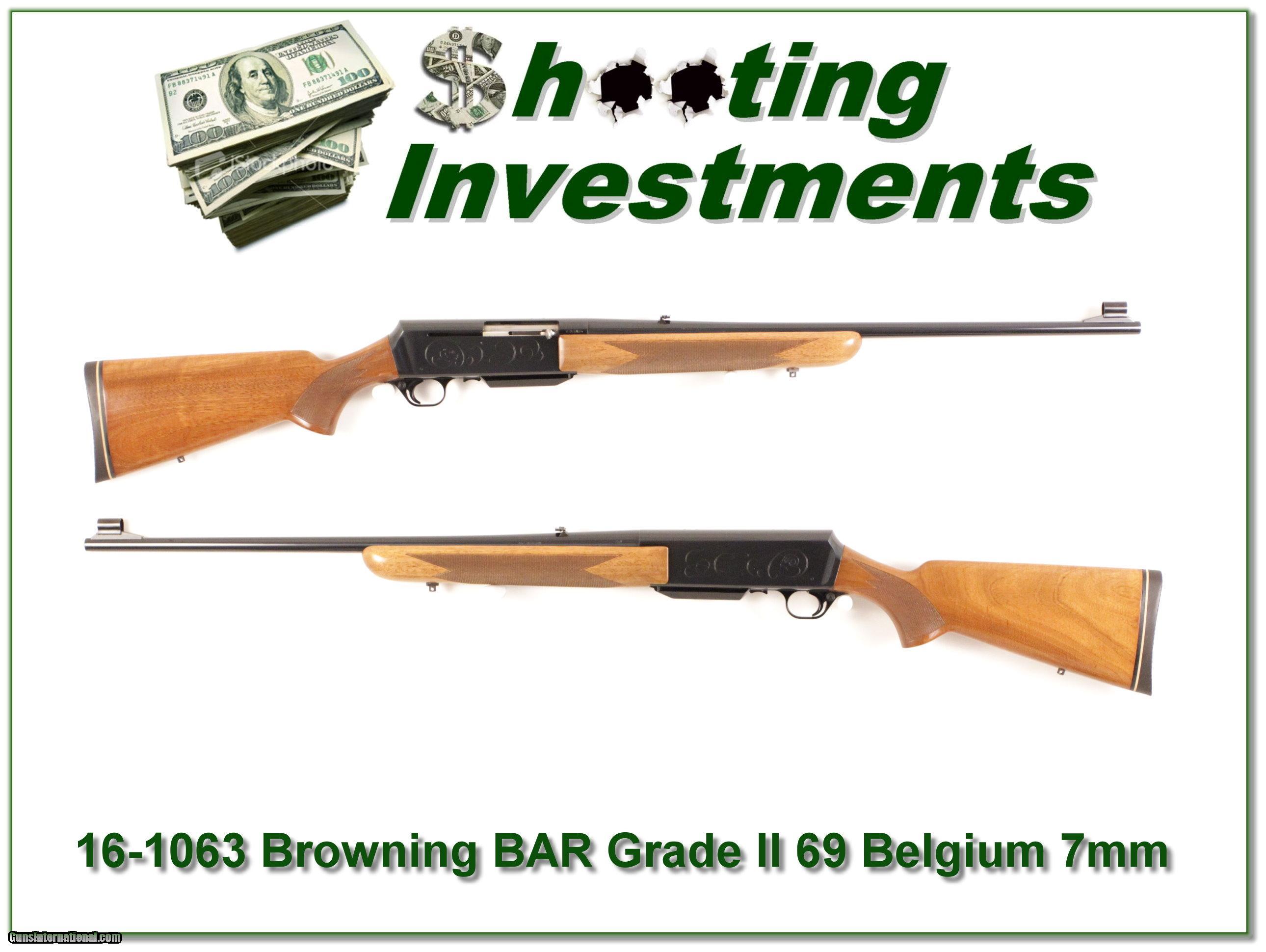 Description: Collectors and hunters, this is an excellent condition Browning BAR Grade II in 7mm Rem Mag. It was made in Belgium in 1969 and has the desired Blond Wood with very nice grain! I am sure never fired more than a few rounds. Both blue and wood are excellent with only a couple handing marks. For less than buying a New BAR you can have the real thing! And this one is sure to increase in value over time. That makes it a real Shooting Investment! Shipping and insurance is $35 or $15 more if you want it shipped in a new Plano hard case. Please email me with any questions or larger pictures. (I now consign quality firearms only 10%! Let me know if you have any you would like to sell!) [16-1063] Payment: Payment is by Money Order, Cashiers Check or Personal Check. I can now also accept MasterCard and Visa with a 3% convenience fee. PayPal can be used for some items but never firearms. Please let us know if you would like to pay via PayPal. Shipping: The shipping charge will be listed in each description. It is $35 for most guns. Some heavy guns or those insured for over $2000 will be higher. Shipments to Alaska and Hawaii are higher because air shipment is required. Most firearms are shipped within 5 days of receipt of payment. We prefer shipping at the beginning of the week to avoid firearms in transit over weekends. We package all shipments carefully and insure them for the full purchase price, rounded up to the next $100. In the unlikely event that damage occurs, it is important that you save all packaging material for the claims process. Optics are shipped Priority Mail and most other non-firearm shipments are shipped First Class. Returns: Our return policy is simple. If for any reason you are not pleased with your purchase, you may return your item for a refund. The only exception is ammunition, it cannot be returned. It is important to us that you are happy. Guns cannot be fired or dissembled before returning them and must be returned in the same condition as received. Notification of a return must occur with-in 3 days of receipt at your dealer. Shipping, convenience and dealer fees are not refundable and are the responsibility of the buyer. Lay-a-way: If needed, we offer a 60 day lay-a-way option on most firearms. It is 1/3 now, 1/3 in 30 days and 1/3 in 60 days. Lay-a-way firearm sales are final. Consigning your firearms with Shooting Investments: We will help you get top dollar for your firearms. While most local guns shops charge 20% or more, our fee is only 10% with a minimum of $50. At your local gun shop it might take months to sell. Selling on-line provides instant access to thousands of interested buyers. You won’t find any other on-line dealer willing to sell your firearms for only 10% or listing every gun on 4 separate s. Selling through an House typically costs the seller 15% and the buyer an addition 15% (so 30%) and you have to wait several months to sell and longer to receive funds. If properly priced, we will sell your firearms in a week or two. Send us an email or give us a call and we’ll explain how easy it is for you to get top dollar. Trading: We collect guns and usually just trade for guns we want to add to our collections. We often sell guns for others wanting to purchase one of ours. We find this the most fair to both of us. Our Commission is only 10% and we hold the gun you want until yours sells. Please contact us if you want to sell one of yours to buy one of ours. Help for California Buyers: We are happy to ship to California. It is the buyer’s responsibility to make sure any item you buy is legal in your state. We are also happy to help with your purchase of a firearm from someone other than us. If you see a gun you would like to buy but the seller can’t or won’t ship to California we can help. You buy the gun and have it shipped to us. We’ll then ship it to your California dealer. The cost for this service is only $30 + shipping. Let me know if we can help! SOLD |